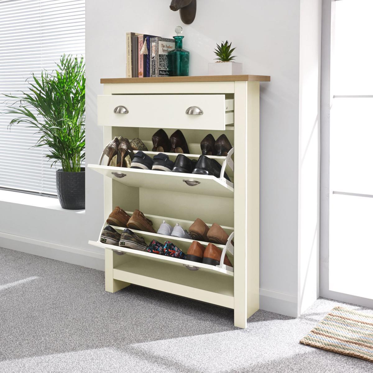 I’m a fan of this cream shoe drop cabinet because its slim profile and neutral shade slot neatly into hallways without overwhelming the space. The shaker-style doors and soft-close hinges feel well made, and the muted cream finish works equally well in Scandi, coastal or modern farmhouse schemes. For styling, keep the top surface clear of clutter - a slim tray for keys, a small pot plant and a couple of favourite books are all you need. Hang a simple round mirror above to bounce light and check your outfit before heading out. Inside, use the two drop-front compartments to separate daily from occasional pairs, so everything stays organised yet within easy reach.