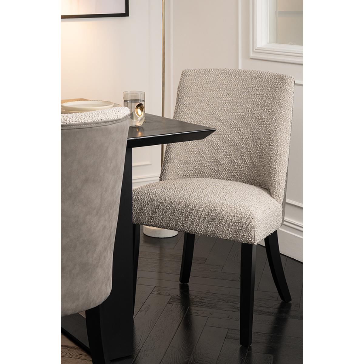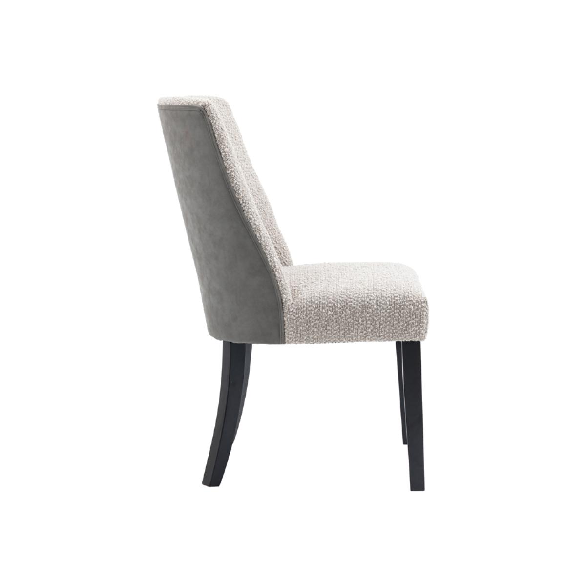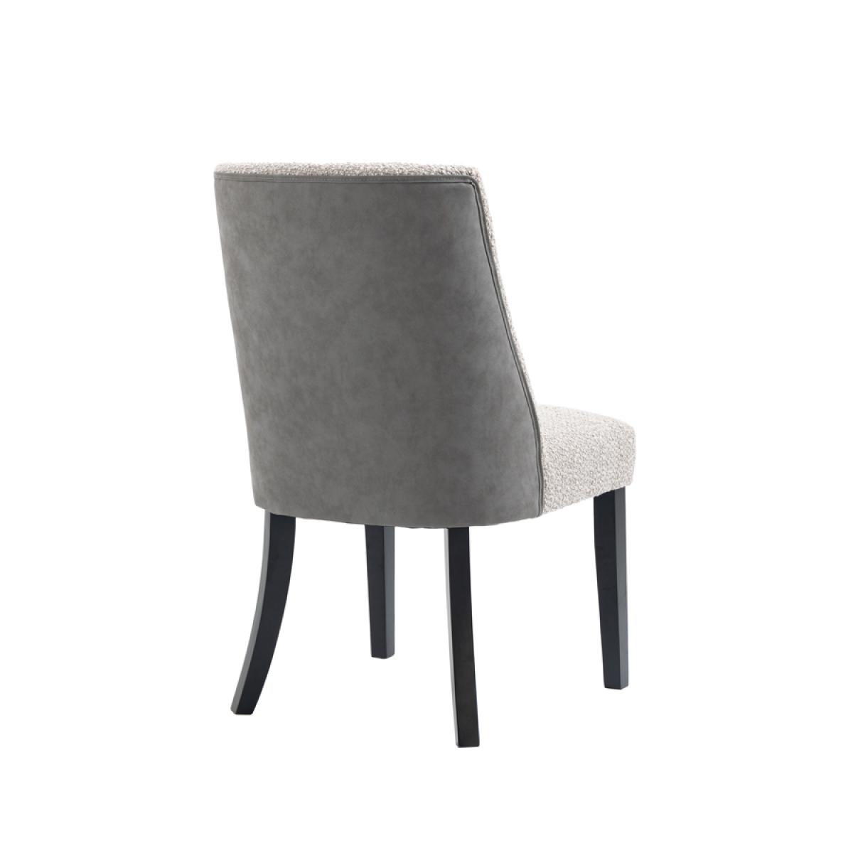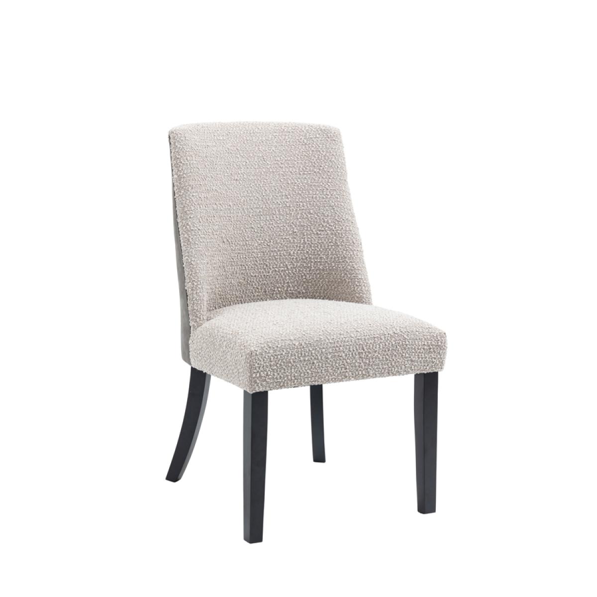 A refined and elegant dining chair. Textured bouclé upholstery seat with a tonal faux leather to back. Stained solid ash legs. Minimal assembly required, simply attach legs.