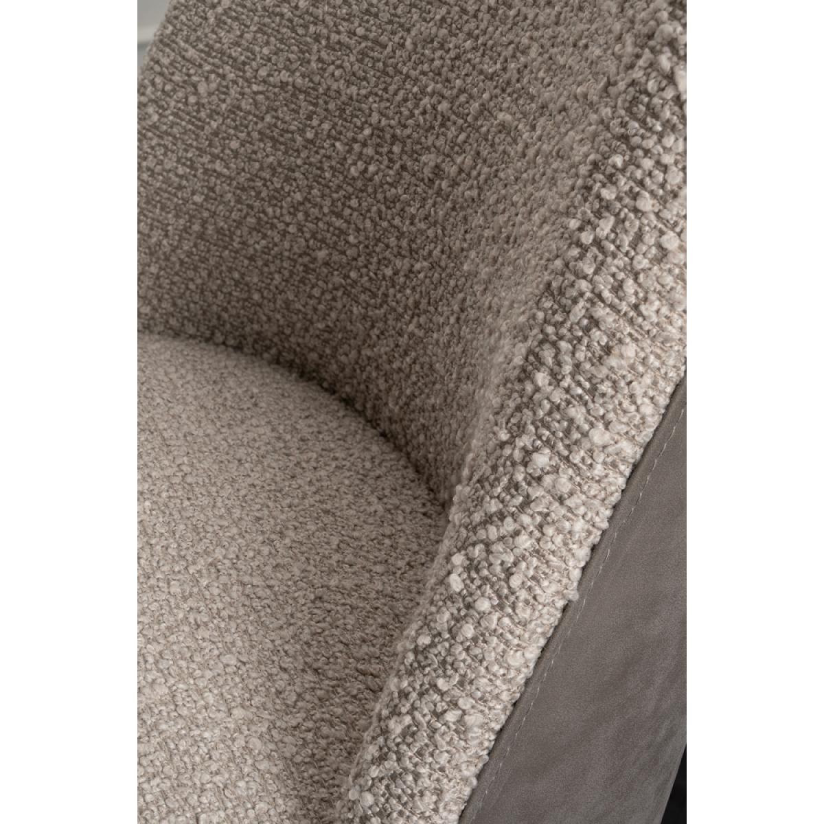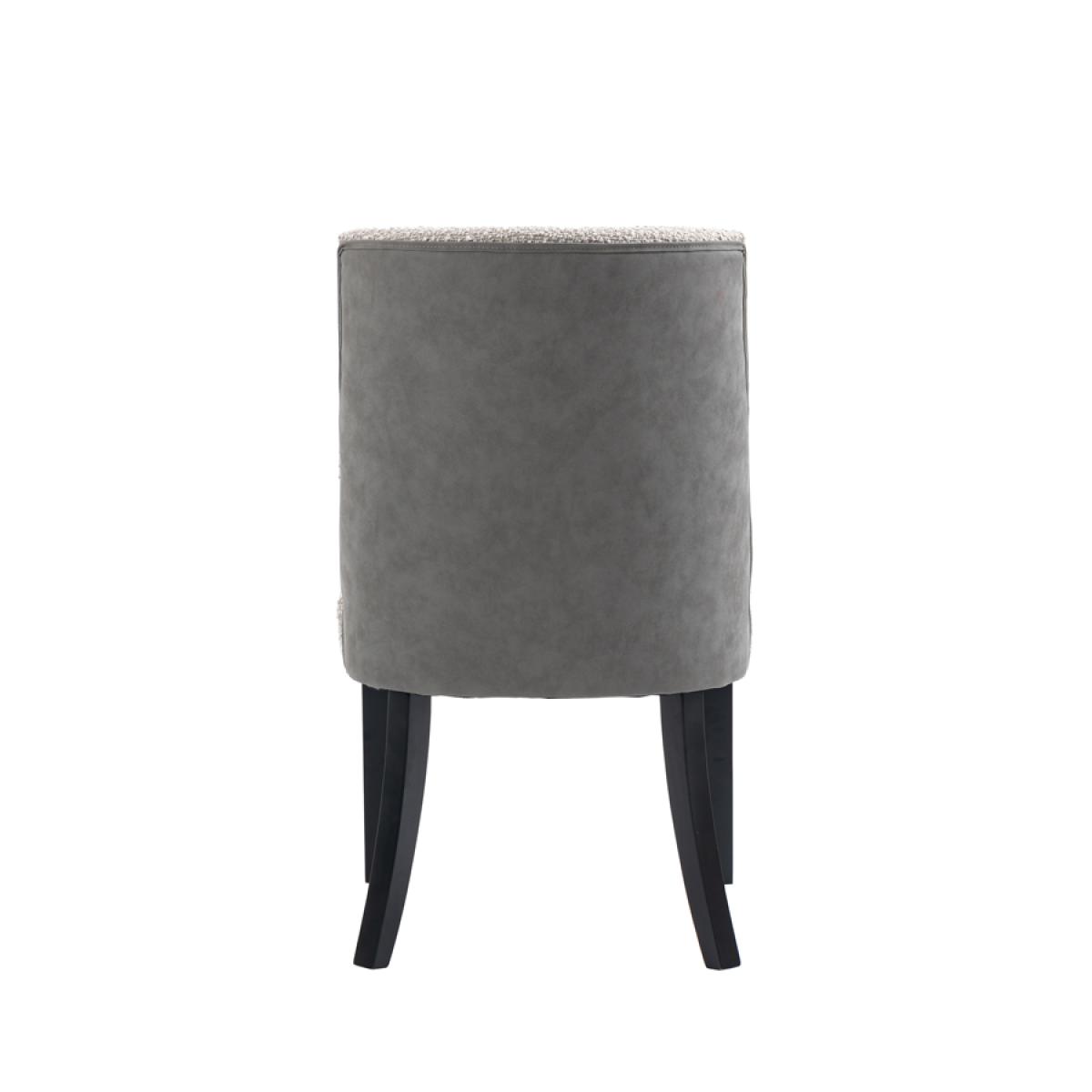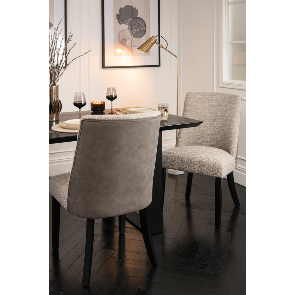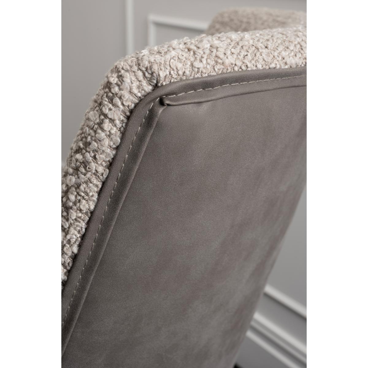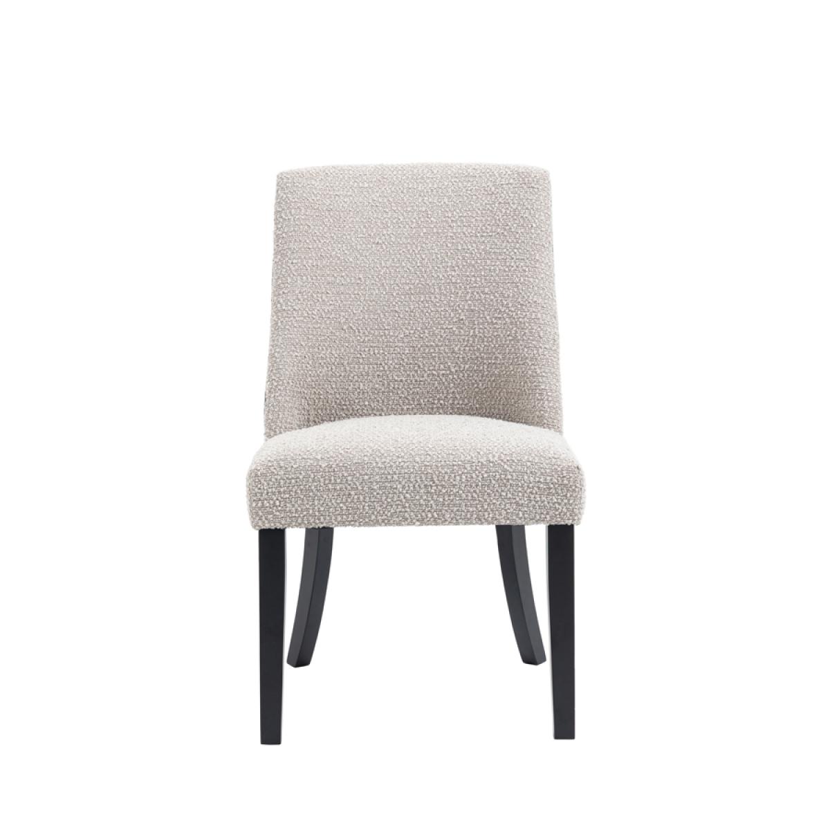 A refined and elegant dining chair. Textured bouclé upholstery seat with a tonal faux leather to back. Stained solid ash legs. Minimal assembly required, simply attach legs.