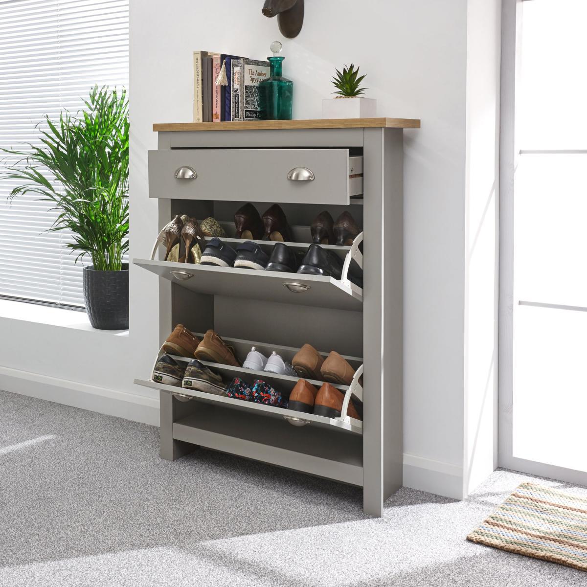 The perfect mix of practicality and style, this Lancaster Grey Shoe Drop is complete with two shoe rack spaces and is perfect for neatly storing away footwear. Available in either a grey or white colourway, and featuring a contrasting oak effect top, this product is as stylish as it is practical. Please note, unfortunately we cannot deliver this item to Northern Ireland or the Channel Islands.