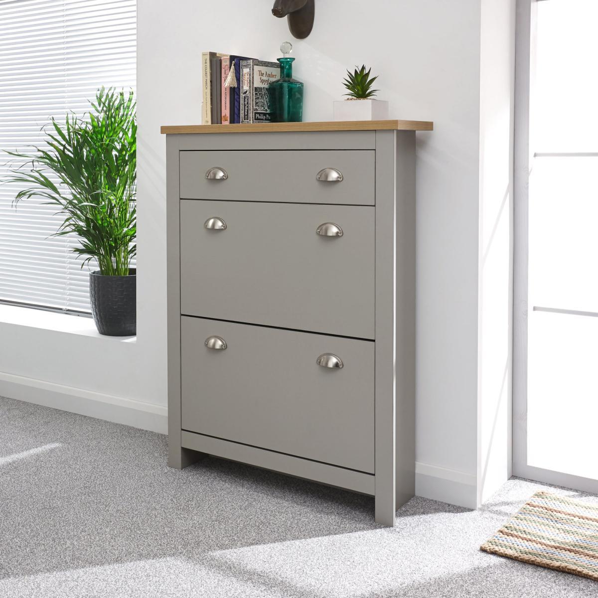 I’m a fan of this grey shoe cabinet because its slim profile and muted finish slot neatly into narrow hallways or cloakrooms without feeling bulky. The oak-effect top adds a touch of warmth, so it works equally well in Scandi-inspired spaces, modern country hallways or even a pared-back urban flat. For styling, keep the surface clutter-free by using a small tray for keys and a low-profile plant or mirror above to lift the eye. Inside the tilt-out compartments you’ll easily organise daily shoes, while the drawers are perfect for spare laces or gloves. A simple runner in natural tones and a wall hook nearby complete a smart, functional entrance.