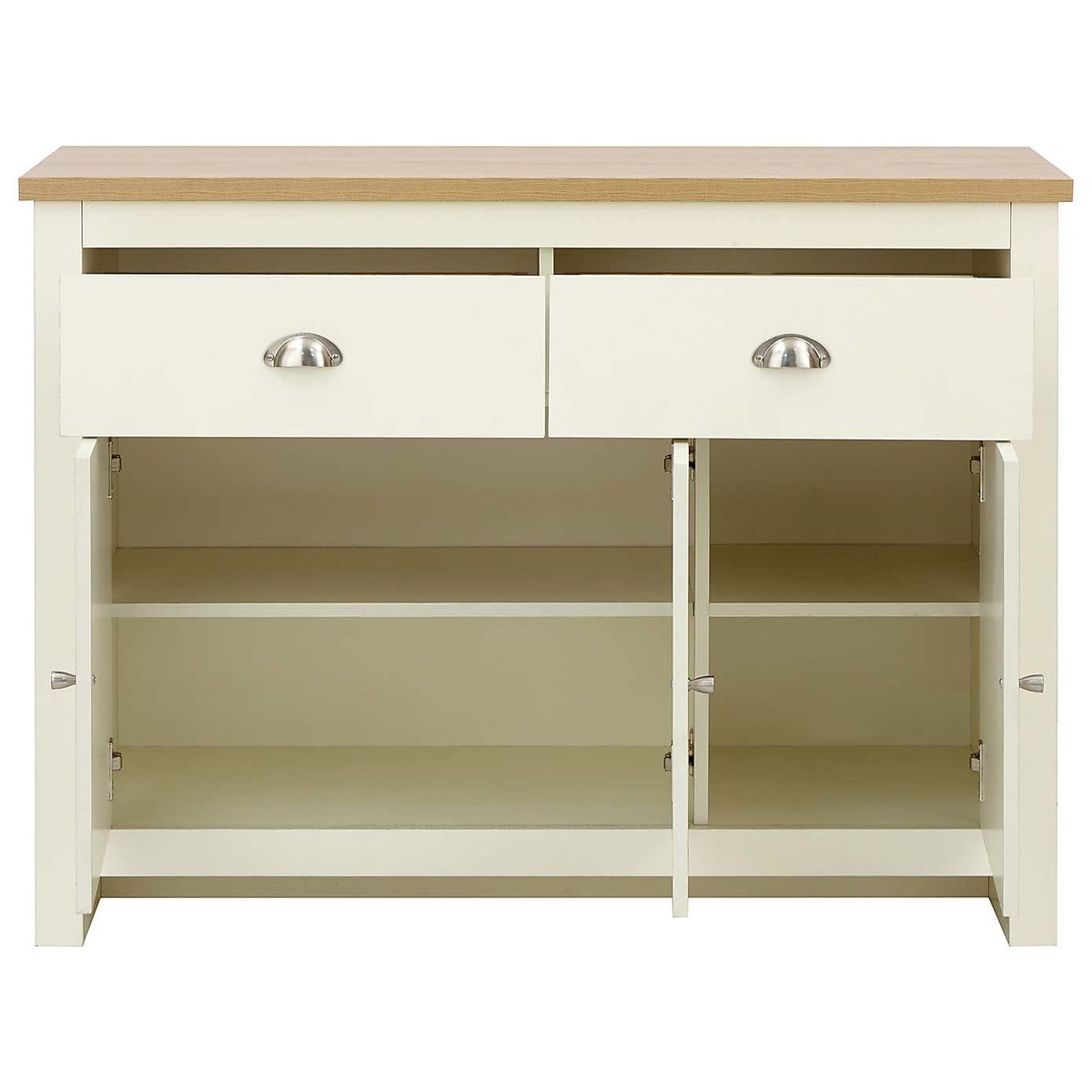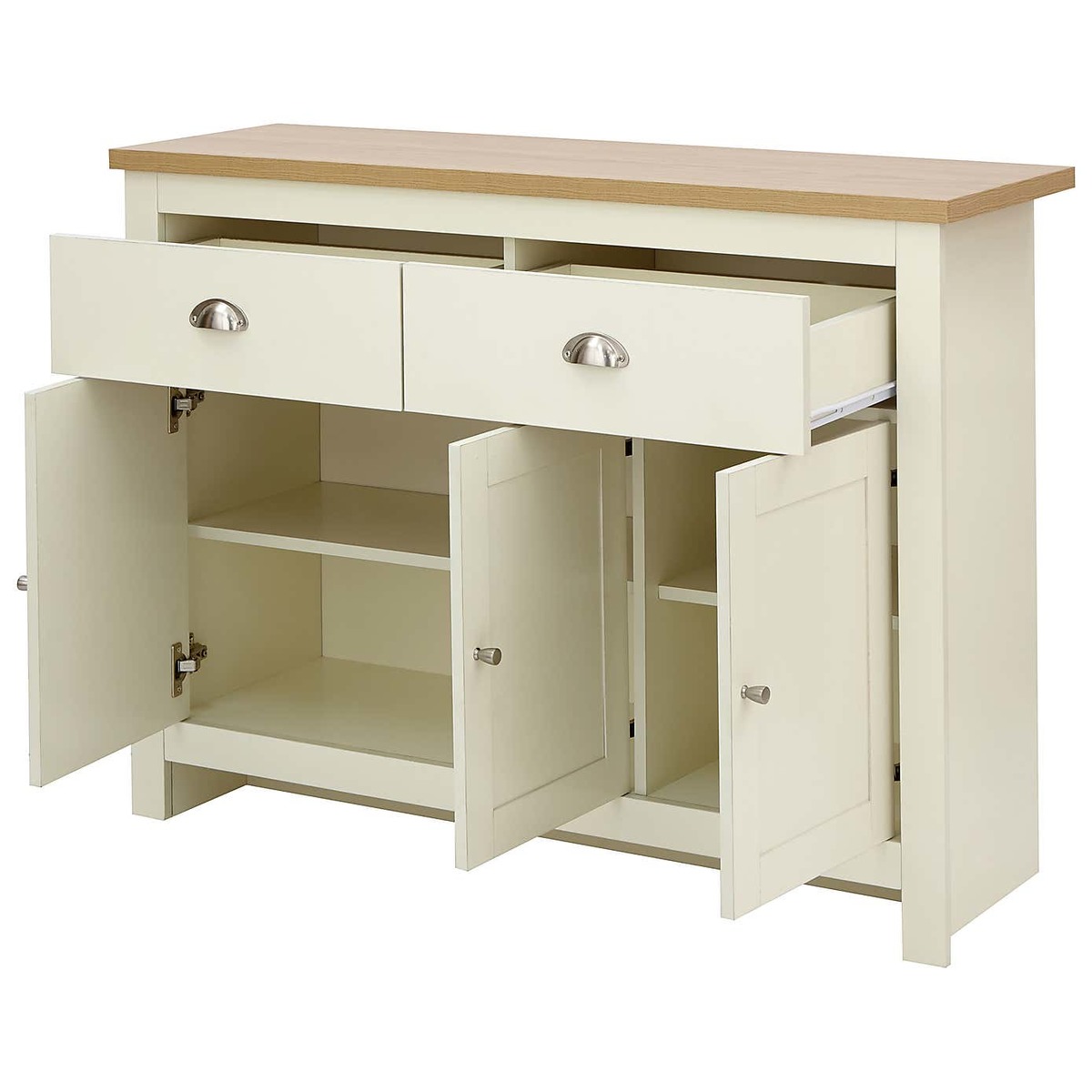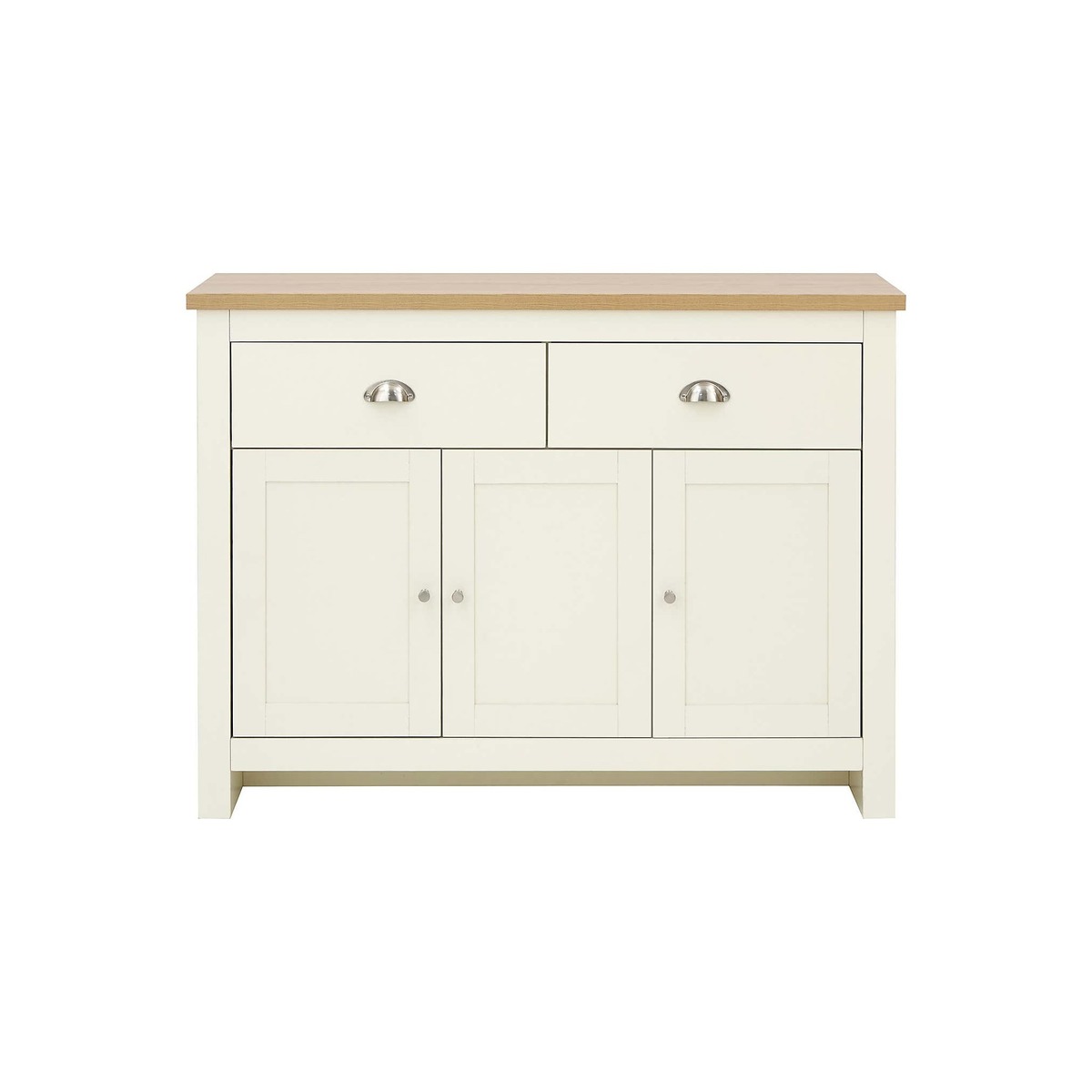 I’ve been using this cream sideboard in both modern Scandi and classic country schemes - its clean lines and neutral finish make it endlessly adaptable. The oak-effect top adds warmth, so it sits comfortably alongside natural textiles and muted tones. Practically, the two drawers are ideal for cutlery or office bits, while the triple cupboard holds larger items out of sight. To style, try a cluster of ceramic vases or a low-profile table lamp on one side, and a shallow tray with candles and a small plant on the other for balanced layering.