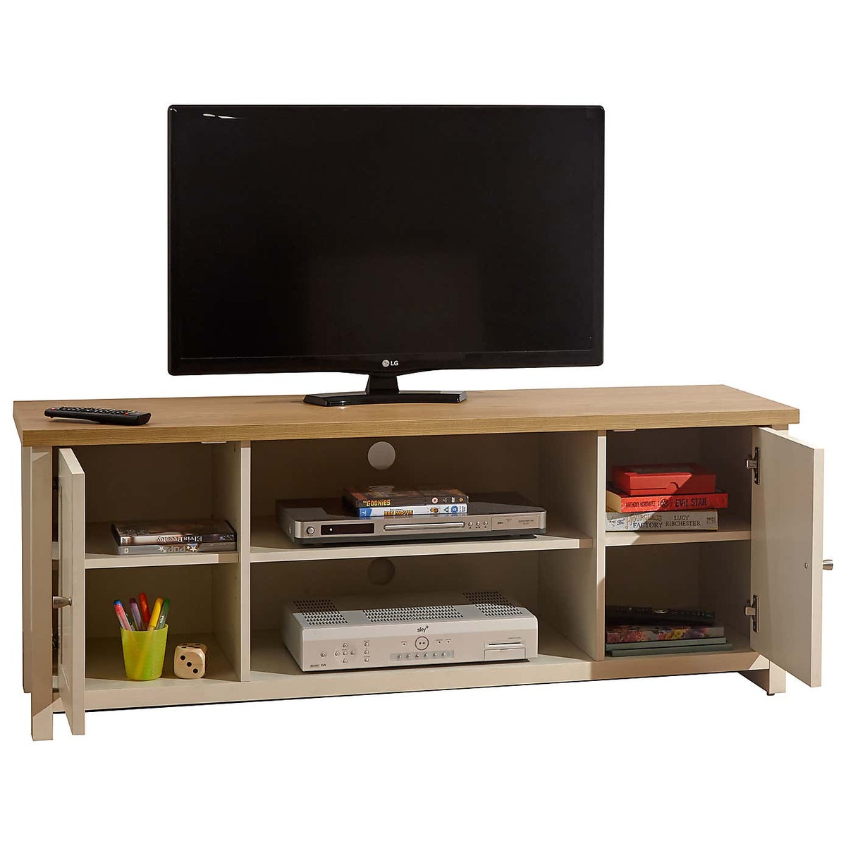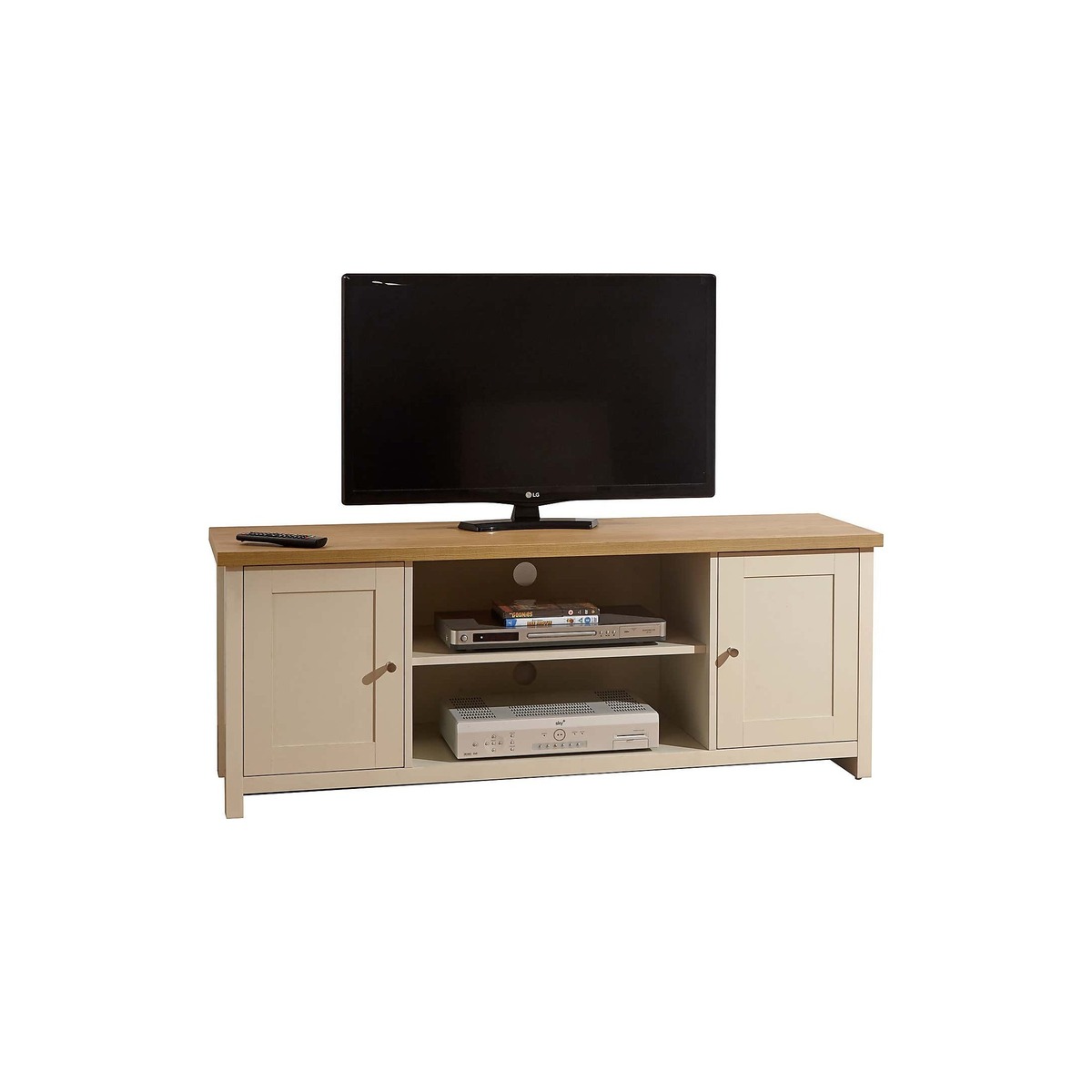 * Suitable for T Vs up to 55"* Self assembly required* Two open shelves with cable access* Two spacious cupboards* Painted finish with natural oak veneer top* Satin silver coloured handles An elegant solution for your living room, the Lancaster Large TV stand, boasts a stunning country cottage styling and is finished in a cream colourway. Complete with two spacious cupboards and two large open shelves with convenient cable access, this TV stand features a contrasting oak veneered top and delicate satin silver coloured handles. Do not use solvent based cleaners or detergents as they can bleach or damage the product.
