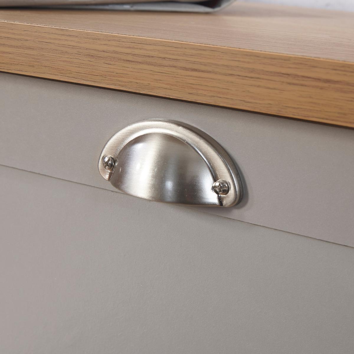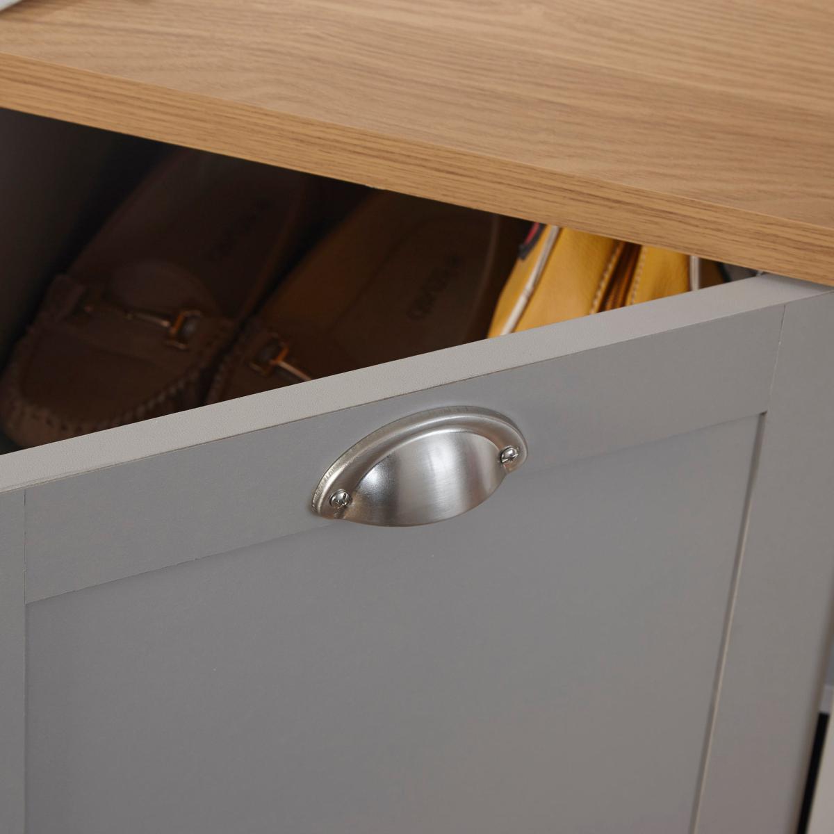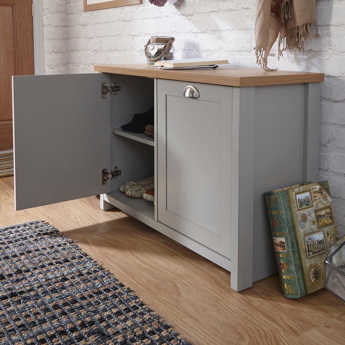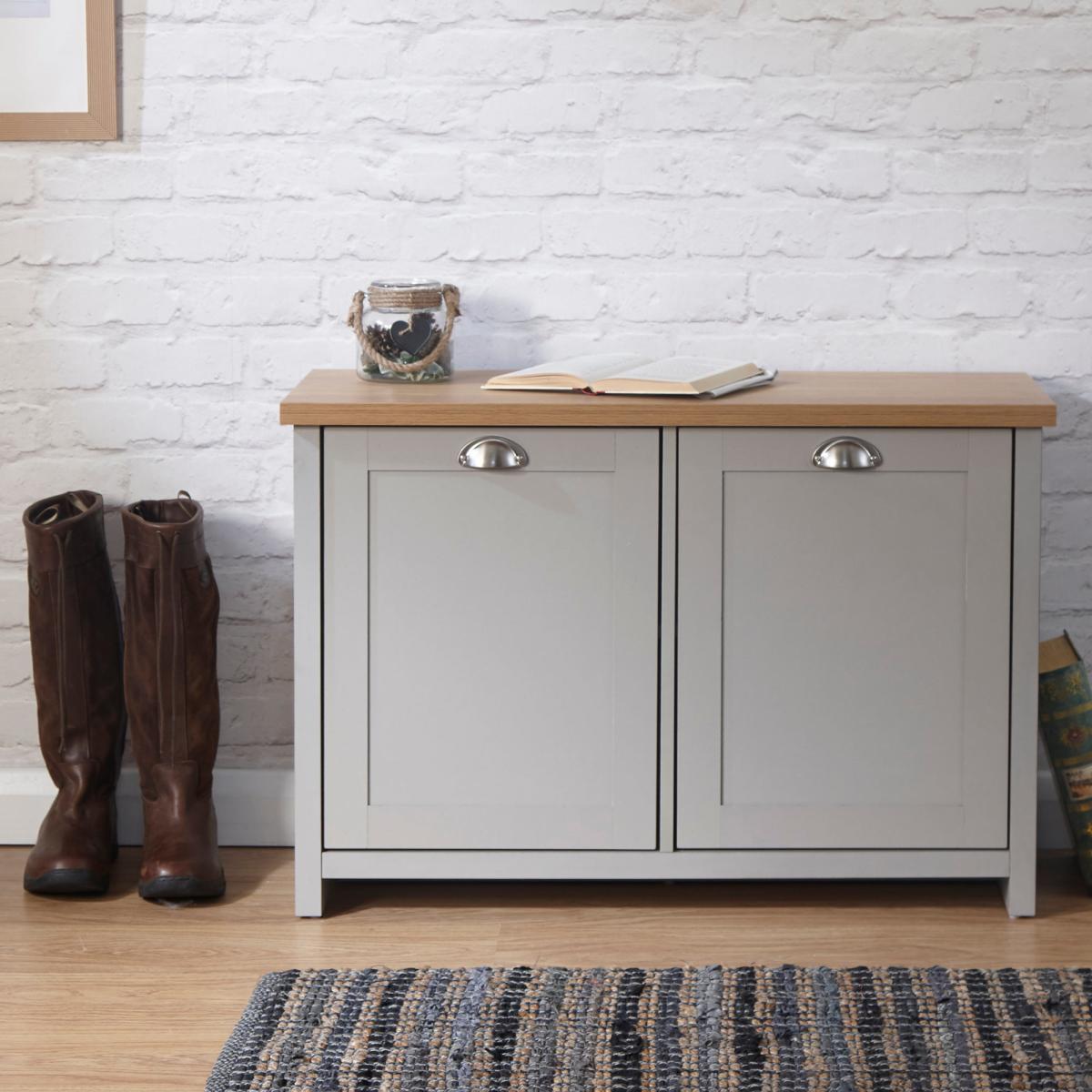 Inspired by countryside cottages, this Lancaster Shoe Cabinet is complete with four shelves and is perfect for neatly storing away footwear. Available in either a cream or grey colourway, and featuring a contrasting oak effect top, this product is as stylish as it is practical. Please note, unfortunately we cannot deliver this item to Northern Ireland or the Channel Islands.