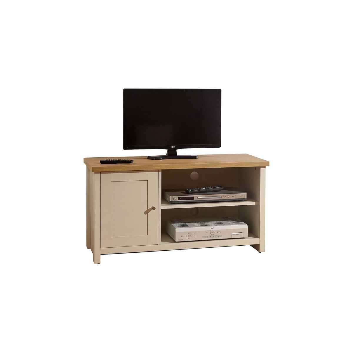 An elegant solution for your living room, the Lancaster small TV stand, boasts a stunning country cottage styling and is finished in a cream colourway. Complete with a single spacious cupboard and two large open shelves with convenient cable access, this TV stand features a contrasting oak veneered top and delicate satin silver coloured handles. Do not use solvent based cleaners or detergents as they can bleach or damage the product.