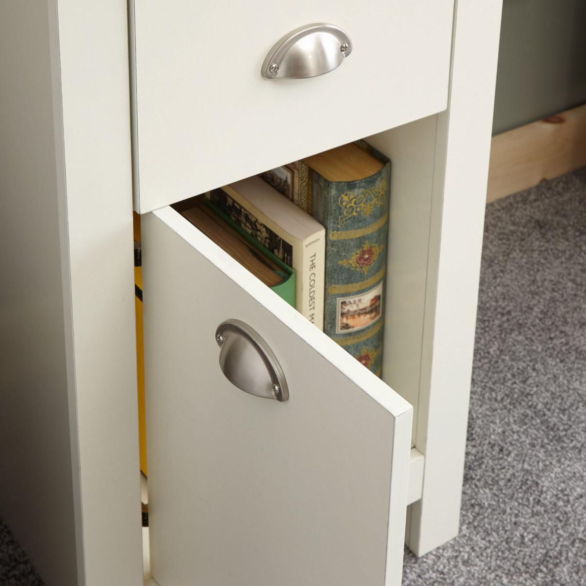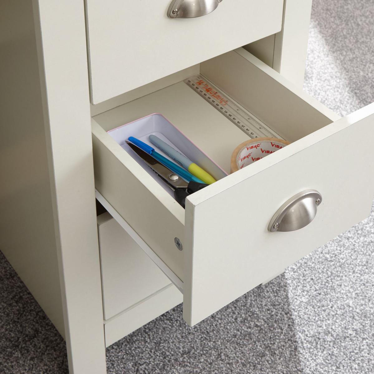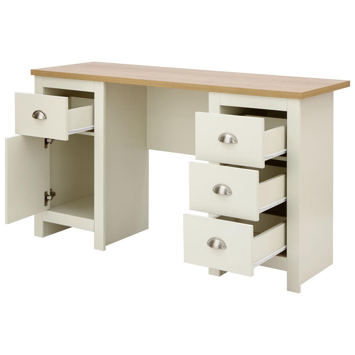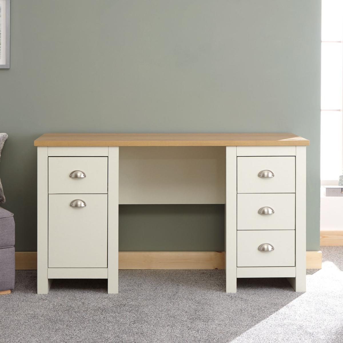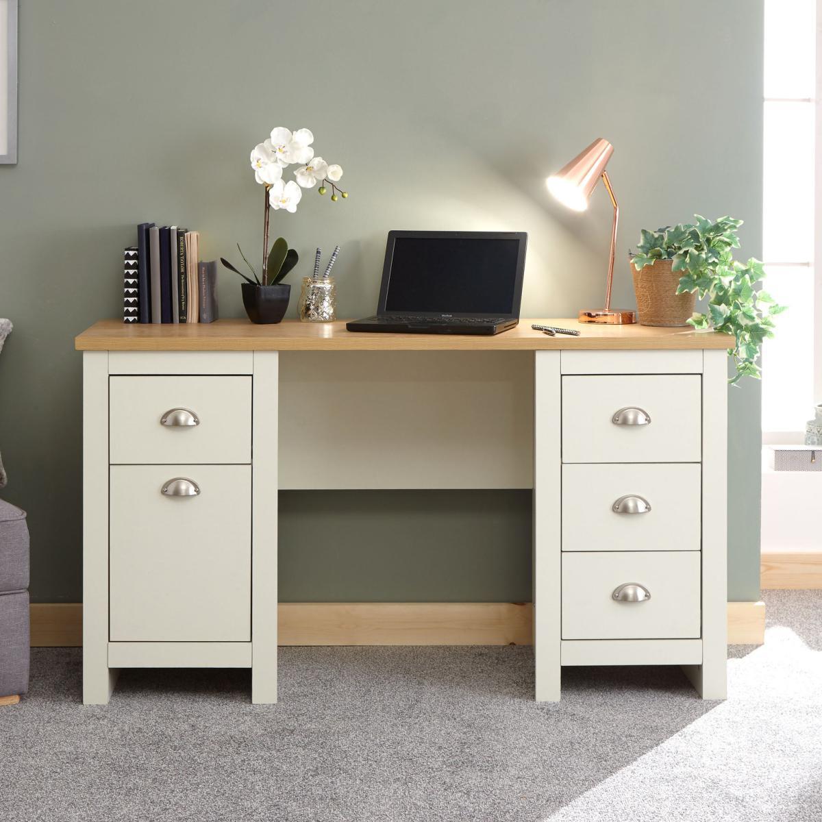 Designed in a contemporary country style, the Lancaster study desk is available in a choice of stylish grey or cream colourways with a contrasting oak veneer top and would be a great addition to your home. This self-assembly desk features plenty of storage, with four ample sized drawers and a handy cupboard space, complete with signature satin silver finished drawer handles. Under Desk Chair Space: H 73 x W 52. 5cm. Please note, unfortunately we cannot deliver this item to Northern Ireland or the Channel Islands.