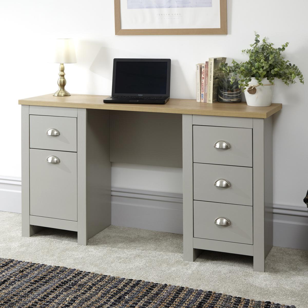 Our Lancaster Study Desk features a convenient cupboard and 4 large storage drawers in addition to a useful working area. It is available in a modern soft grey finish with contrasting oak veneer top, the drawers and cupboard on are fitted with our signature 'Lancaster' satin silver drawer pulls.