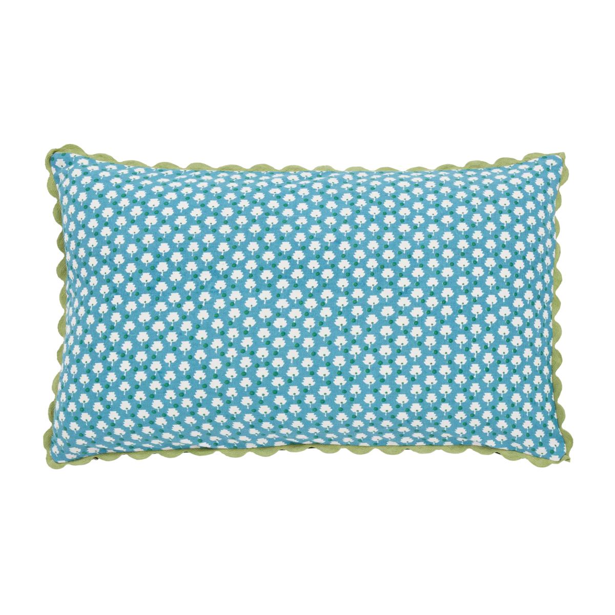 This rectangular bed cushion has a dainty pint and scallop trim.