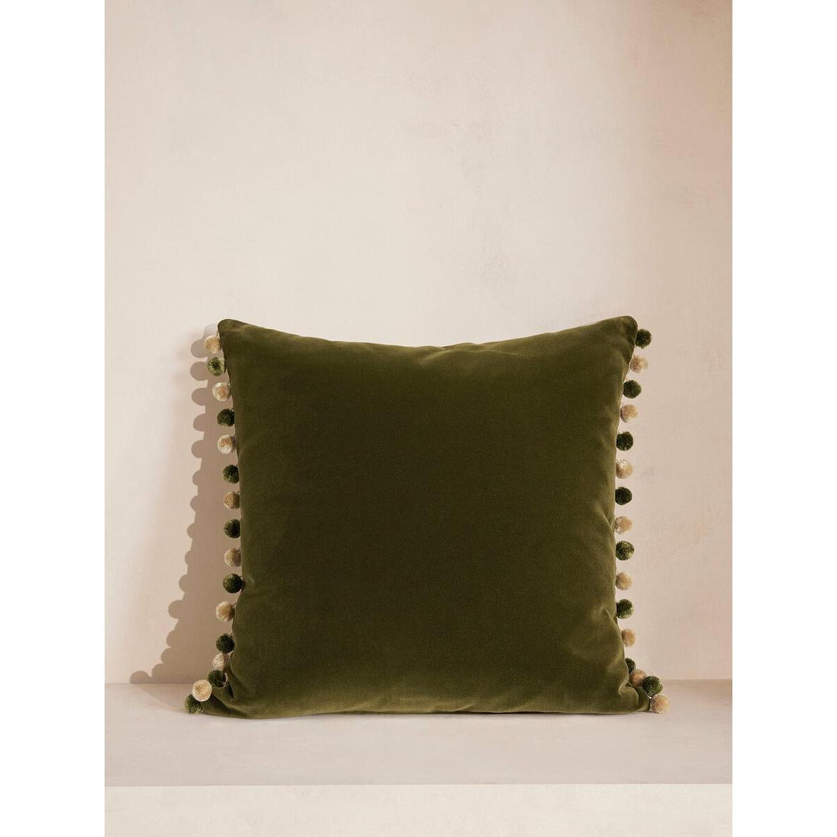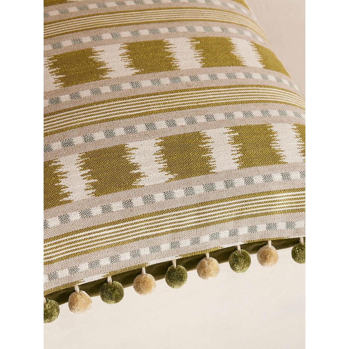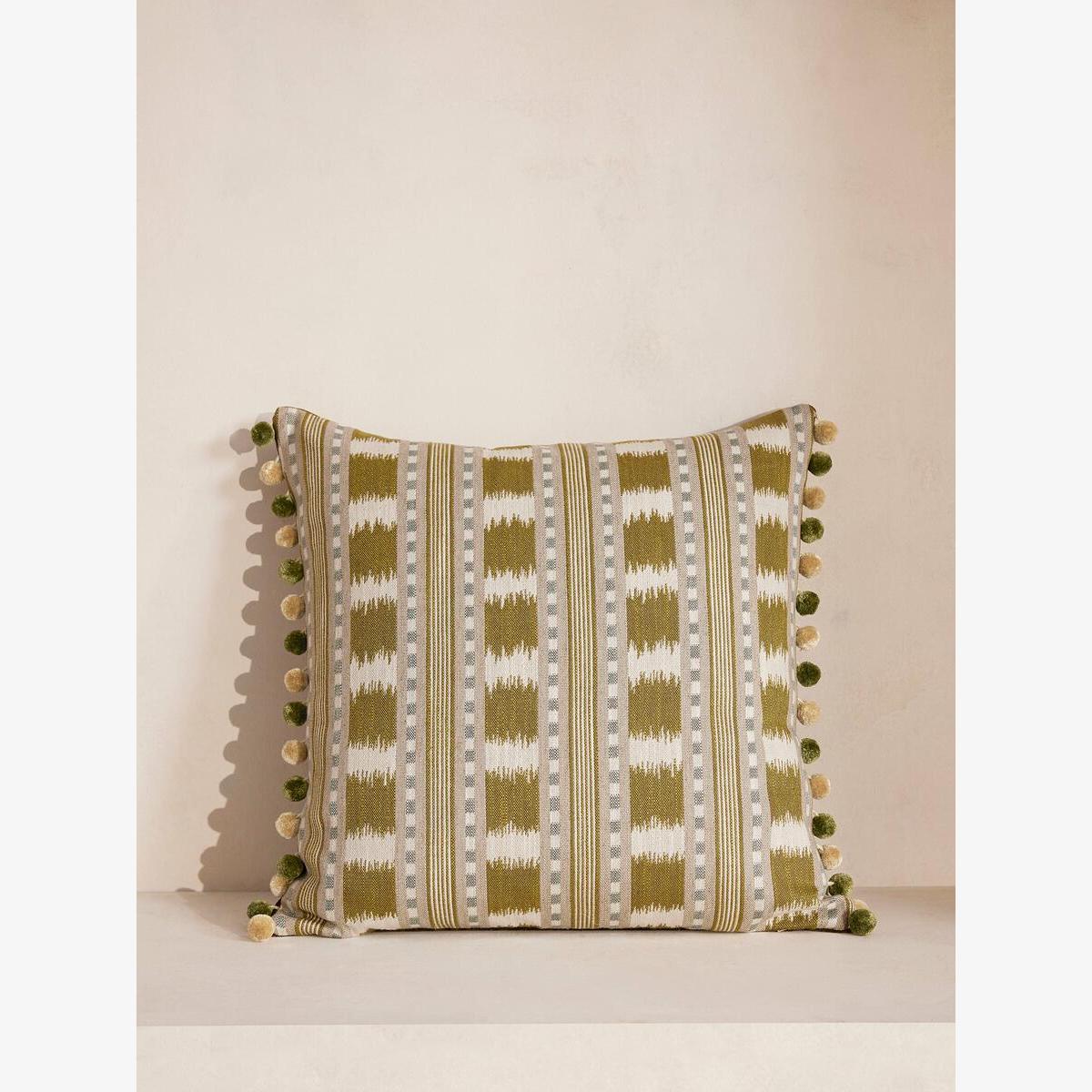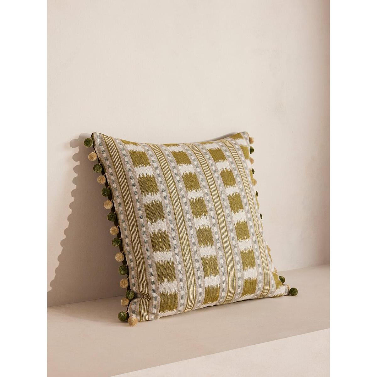 Designed exclusively using James Hare fabric, our Lando cushion features a large-scale Ikat stripe taken from its Shalimar collection, where classic meets contemporary. Crafted from a cotton and linen blend, a soft handle and feel adds extra comfort to this design, finished with a decorative pom-pom trim to complement the earthy tones. Layer on the sofa or bed with other Ikat patterns and solid colours, as we do in Soho Farmhouse. Printed cushion Designed with James Hare fabric Large-scale Ikat stripe taken from its Shalimar collection Crafted from cotton and linen blend Soft handle and feel Decorative pom-pom trim in olive and beige Similar Ikats seen in Soho Farmhouse