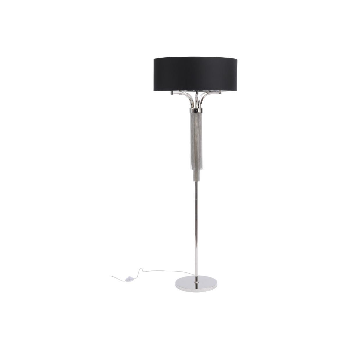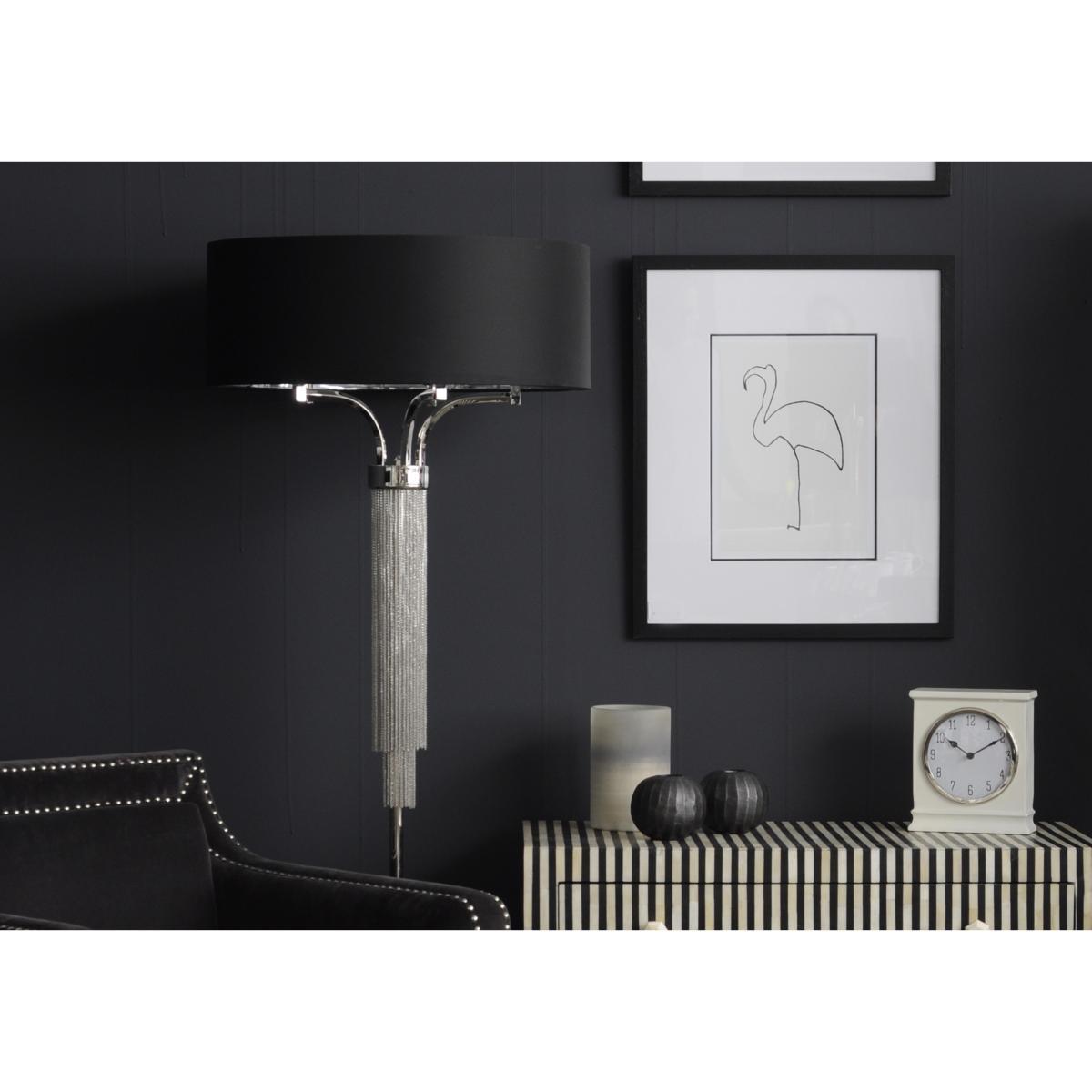 Every lamp should have a silver lining. Introduce Deco style glamour to your home with the Langan floor lamp. Cascading antique silver chains catch and diffuse the light. Why you'll love it. Luxe black and silver floor lamp. Striking Deco style. Glamorous cascading chain detailing. The black drum shade has reflected silver lining. Matches the Langan table lamp. What you need to know. Iron with a polished nickel finished. Silver coloured chain detailing. Black fabric drum shade. Screw cap E14 40W bulb (not included). Dimensions. Width. 60 cm (23.6 inches). Depth. 60 cm (23.6 inches). Height. 165 cm (65 inches). Weight. 12 kg.