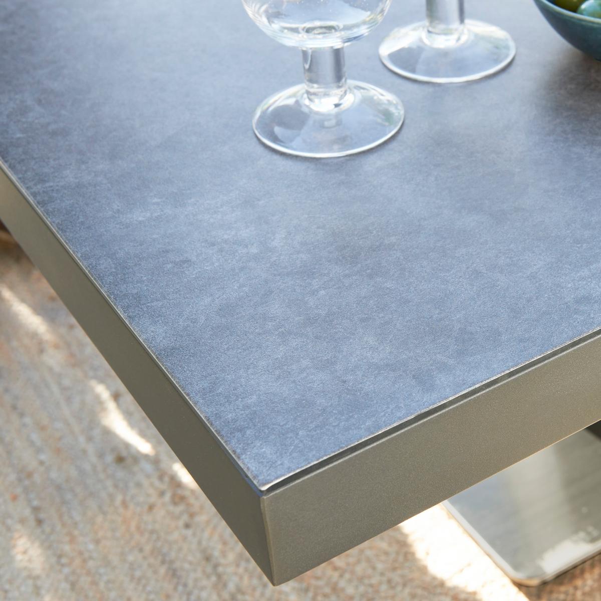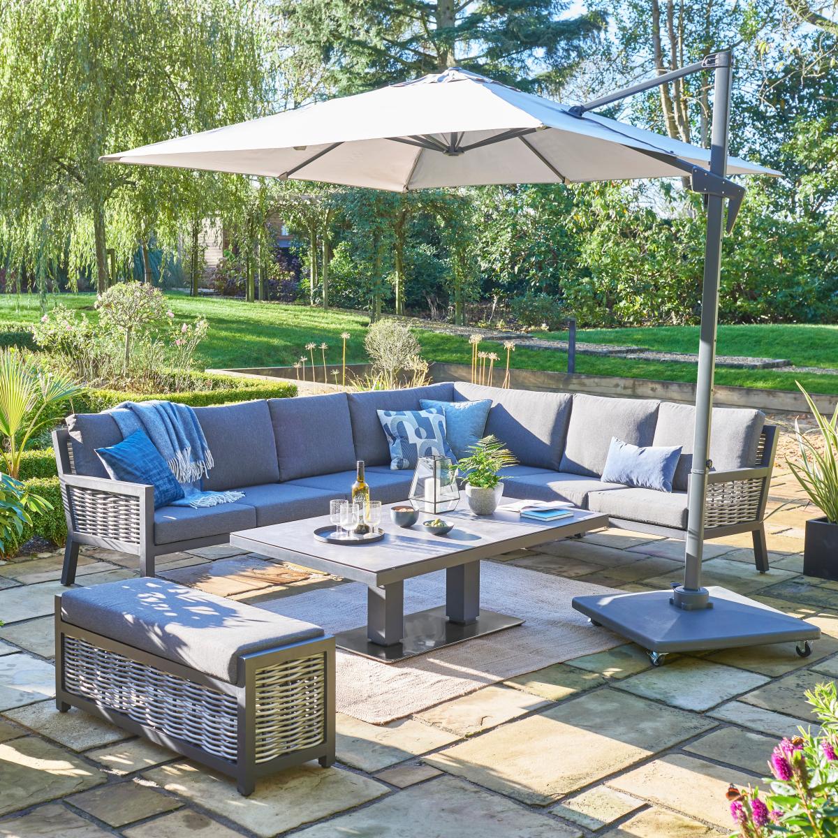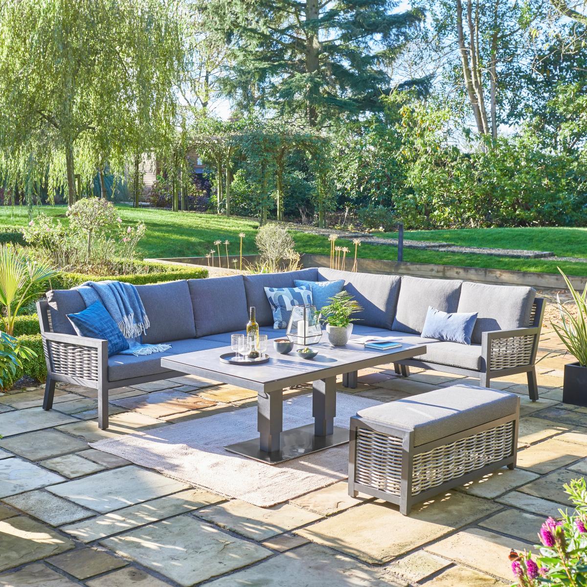 * 1 x table, 1 large corner sofa and 1 x bench * Scratch and rust resistant frame * Wicker design * Cushions included * Weather resistant This large corner set offers a scratch and rust-resistant frame with UV-treated wicker, ensuring long-lasting durability. Comfortably seating up to eight people, it’s the perfect choice for outdoor gatherings. The set comes complete with showerproof cushions for easy maintenance. The visually striking slate grey ceramic-glass top adds both beauty and function, making it a standout feature of your outdoor space.