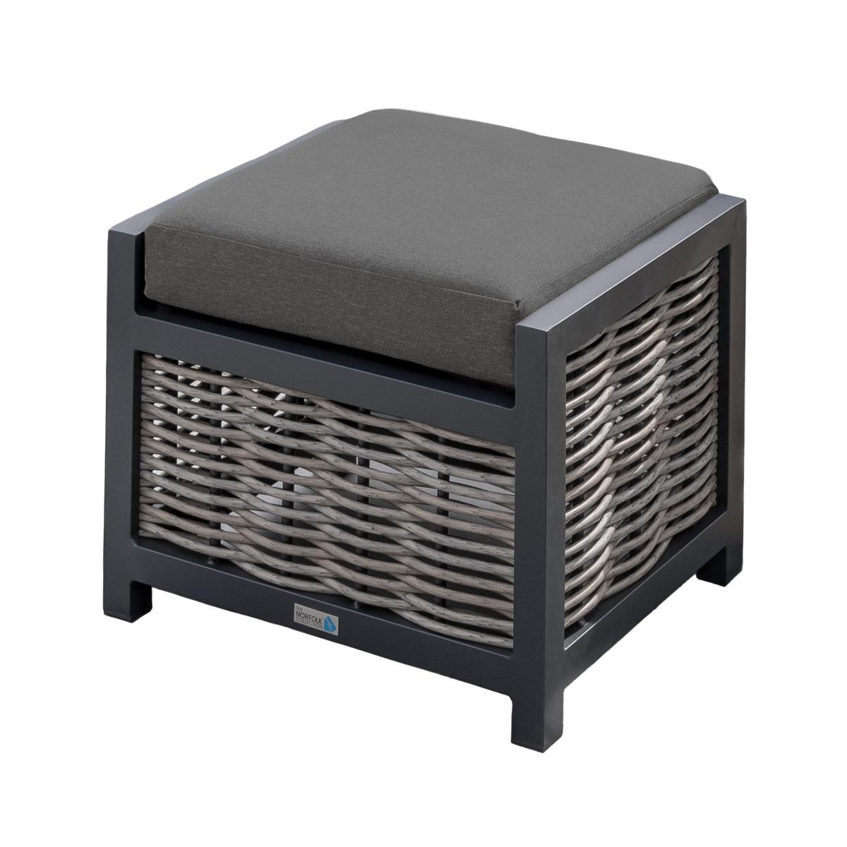 * Metal frame * Woven detailing * Weather resistant This space-saving stool features a scratch and rust-resistant frame with UV-treated wicker and a showerproof cushion for extra seating in your Langham set. The perfect addition for adding extra comfort to your outdoor seating arrangement.