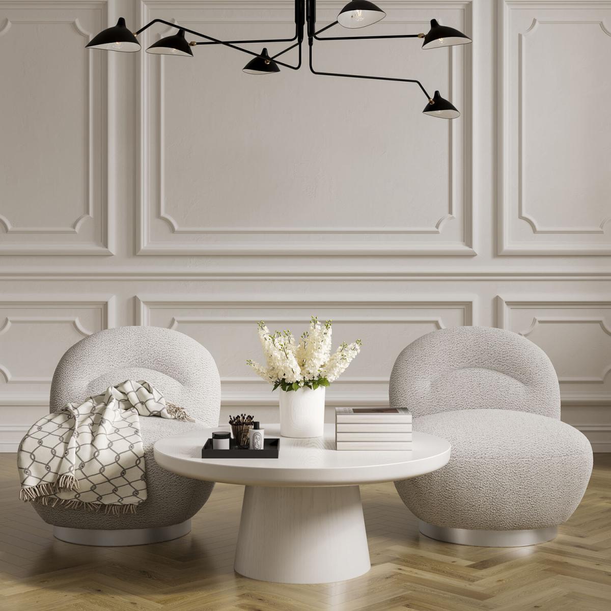 Sway in style and utmost comfort with this Langham Swivel Chair. It features a curved design with a comfy padded seat upholstered in boucle fabric, making it ideal for adding elegance and functionality to any space. It sits on a swivel base in a brushed metal finish, that makes it more cosy and chic. With two modern colours to choose from, it's an excellent choice to elevate the decor of your home, office and living space.