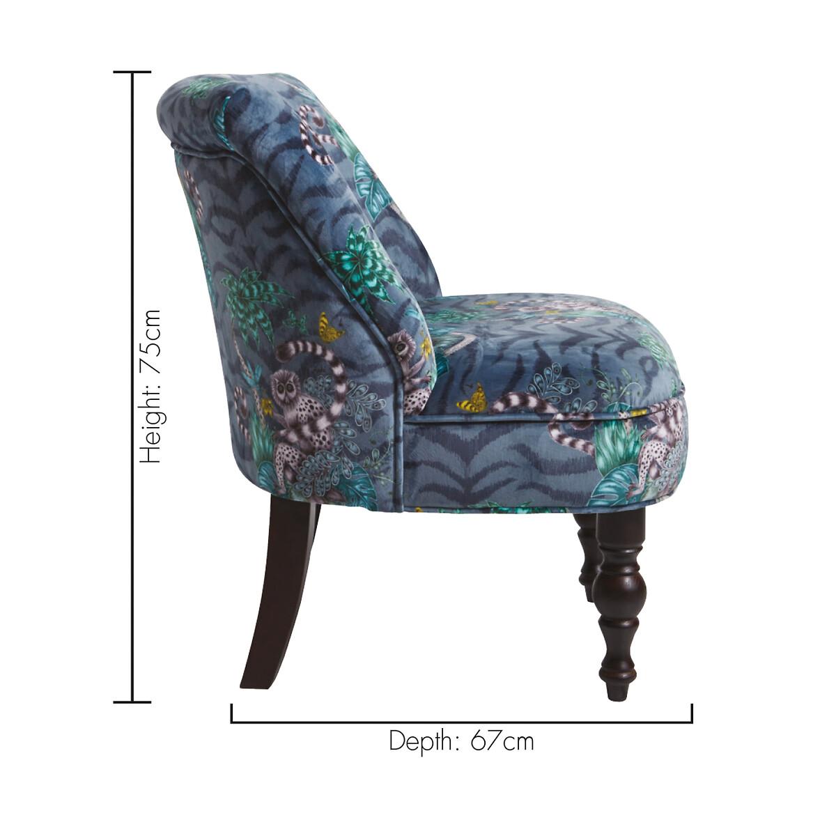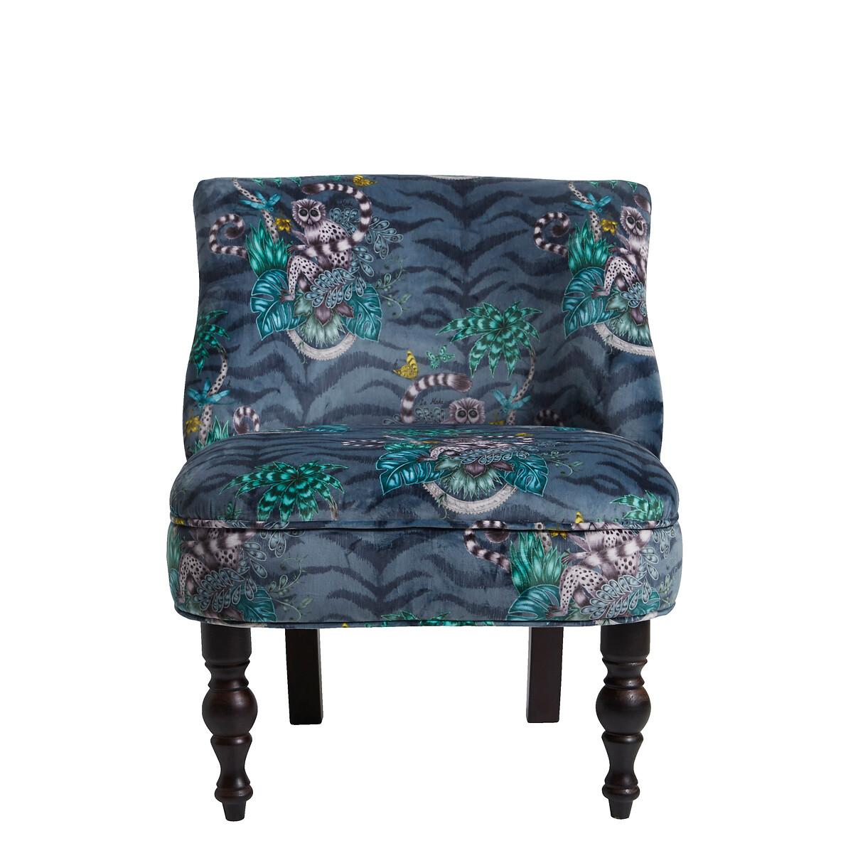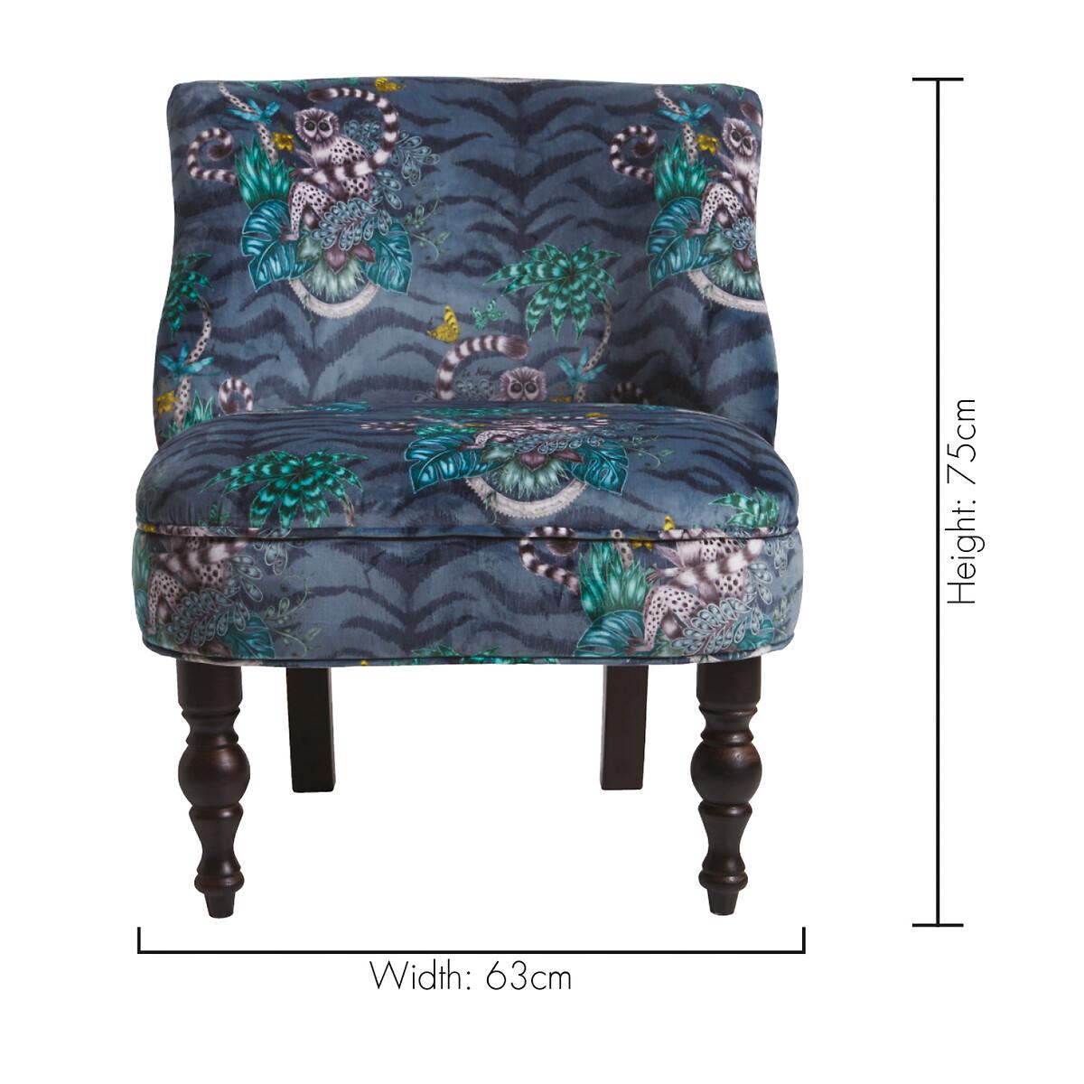 Featuring a curious ring-tailed lemur surrounded by palms and foliage, this is sure to be a conversation starter! In rich navy velvet, this chair would make a sophisticated yet playful statement. Product Details Velvet upholstery Foam and fibre filling. Solid beech legs. Wooden frame Sponge clean onlyComposition. Fabric- 100% Polyester, Legs- 100% Beech Wood, Filling- 100% FR Foam. Product Dimensions - 69 cm x62 cm x75 cm. Product Weight - 15 KGPackage Dimensions - 70 cm x 70 cm x 70 cm. This product will be dispatched by one of our trusted suppliers. You’ll be contacted by their selected courier about your delivery. Please note that this item cannot be delivered to the Offshore Islands, Northern Ireland or the Republic of Ireland.