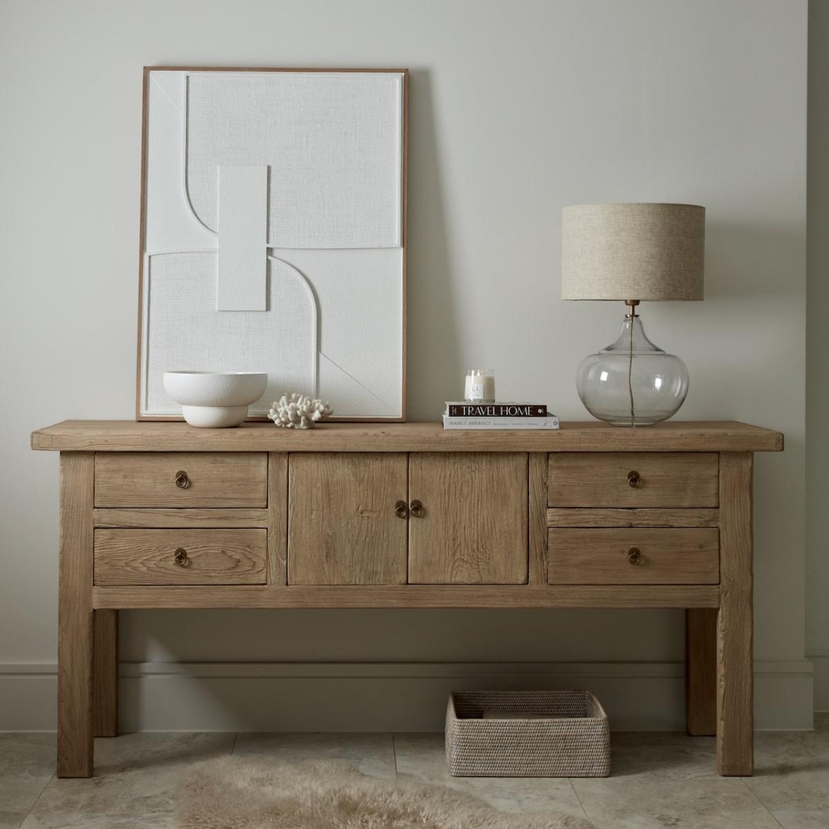 The Langley Console Table is made from solid reclaimed elm which has wonderful aged imperfections and beauty which makes this a beautifully timeless piece if furniture. The unit comprises four drawers and a cupboard in the middle for storage of unsightly objects, which are finished off with bronzed iron handle hoops, a subtle touch. Place in your hallway for elegant storage or in your dining room/lounge to make a great place to style your bar!