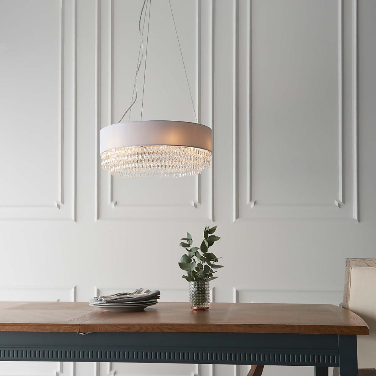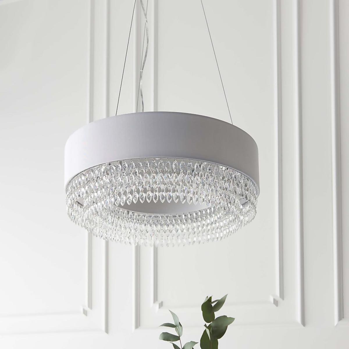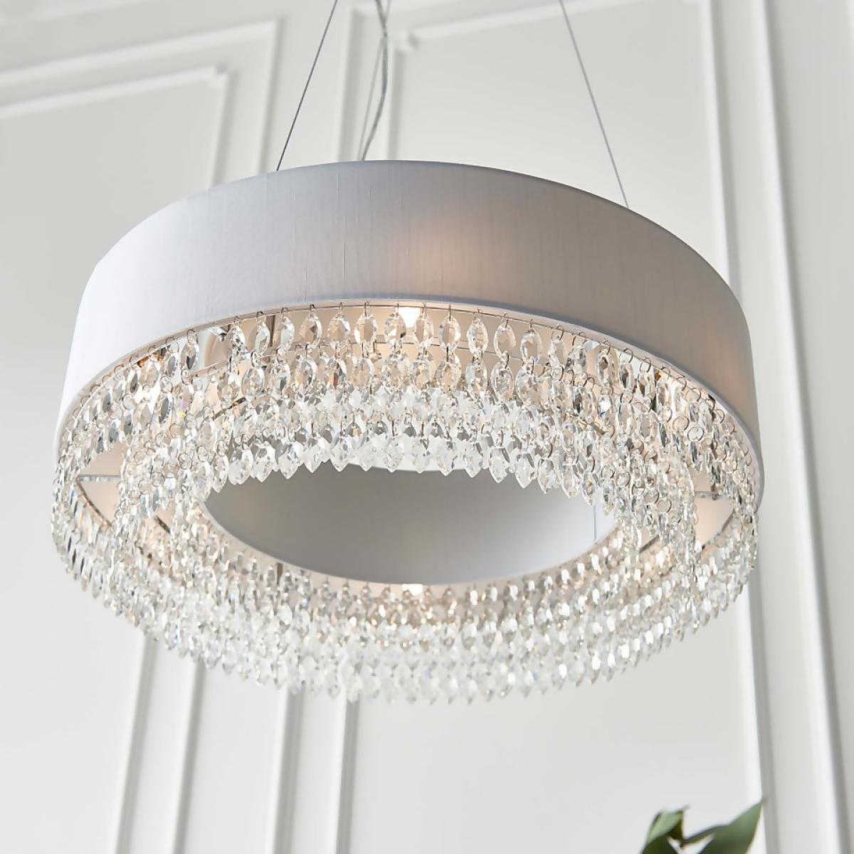 The perfect centre piece! Luxurious facetted glass crystals set in polished chrome metalwork, contrasting with silver grey silk mix fabric, this pendant ceiling light makes a bold statement.