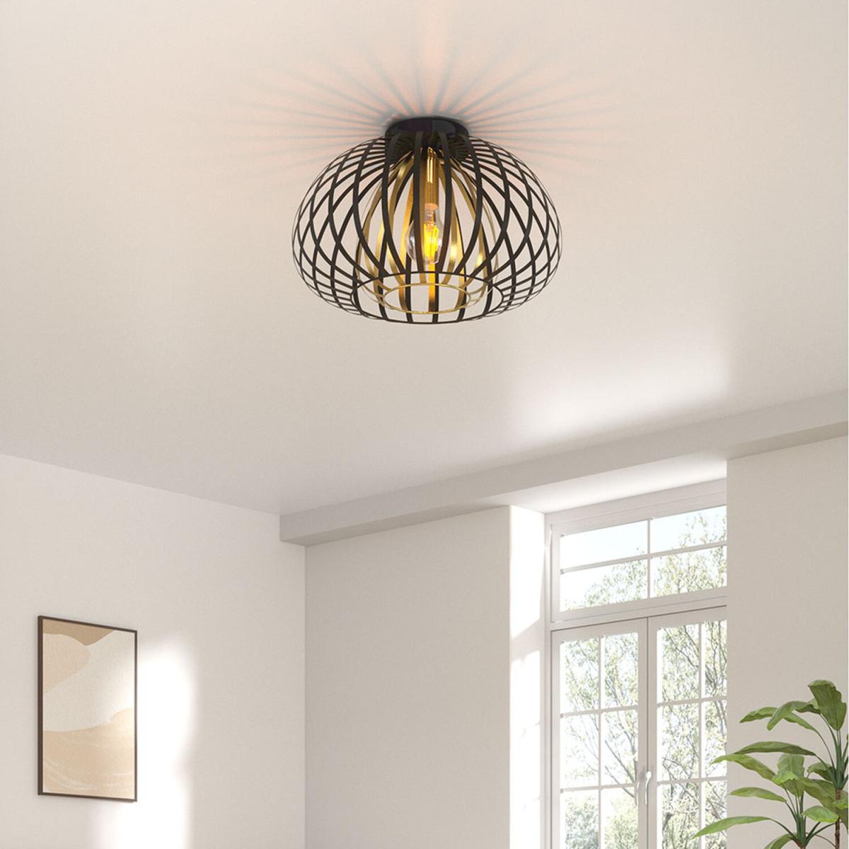 This ceiling lamp features a striking design with a lantern-inspired frame encasing the central bulb. The lampshade is crafted in two layers, with a golden inner layer and a black outer layer, creating an elegant contrast of light and dark tones. When switched on, the light filters through the layered shade, casting a captivating pattern of alternating light and shadow across the ceiling. This unique interplay of brightness adds a sophisticated touch to any space. The bold and distinctive lampshade design ensures it stands out, making it a perfect choice for both living rooms and bedrooms.