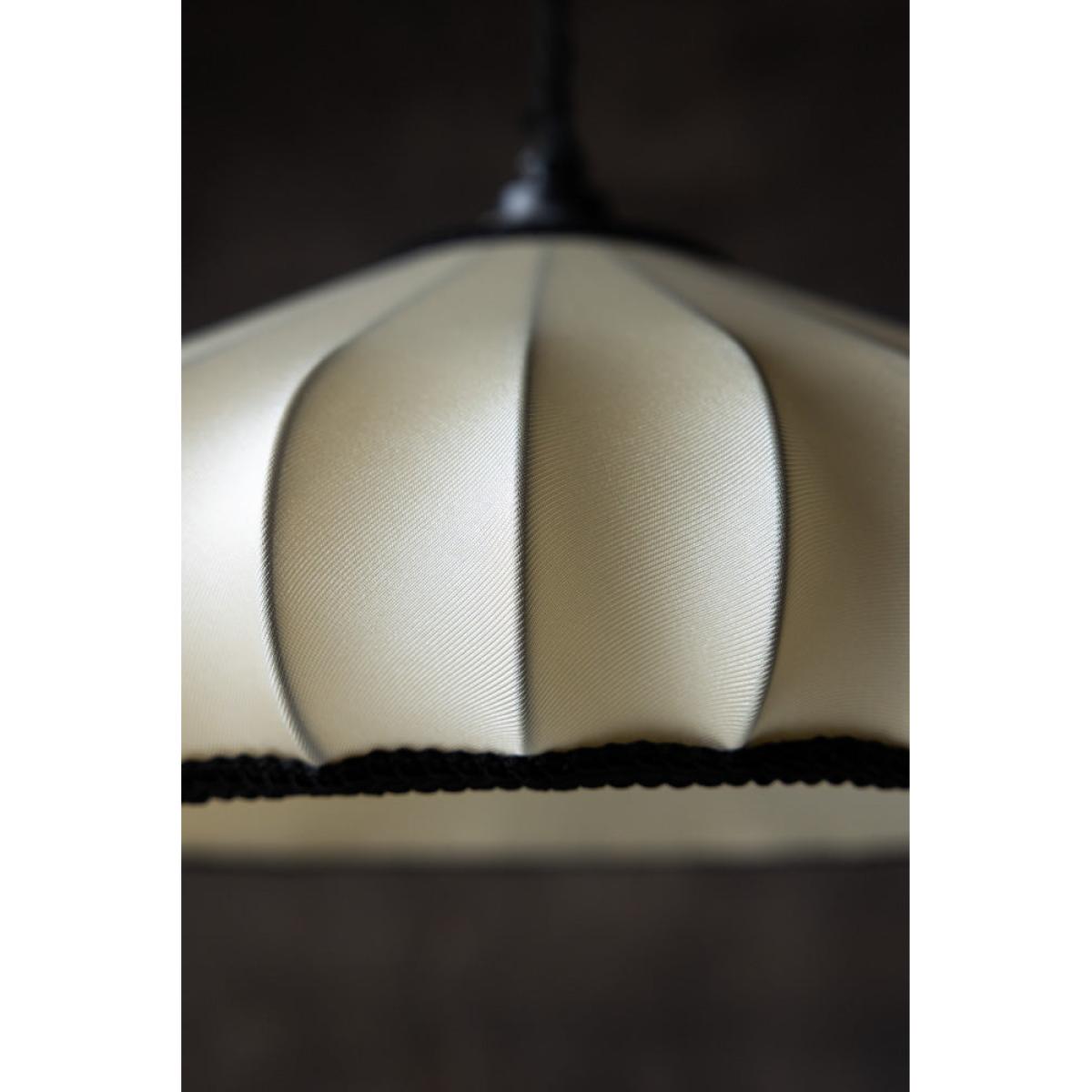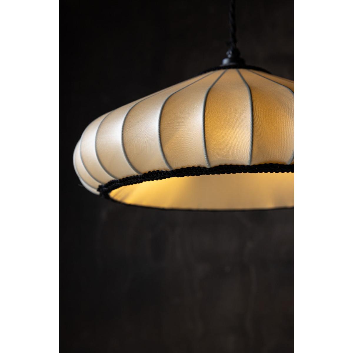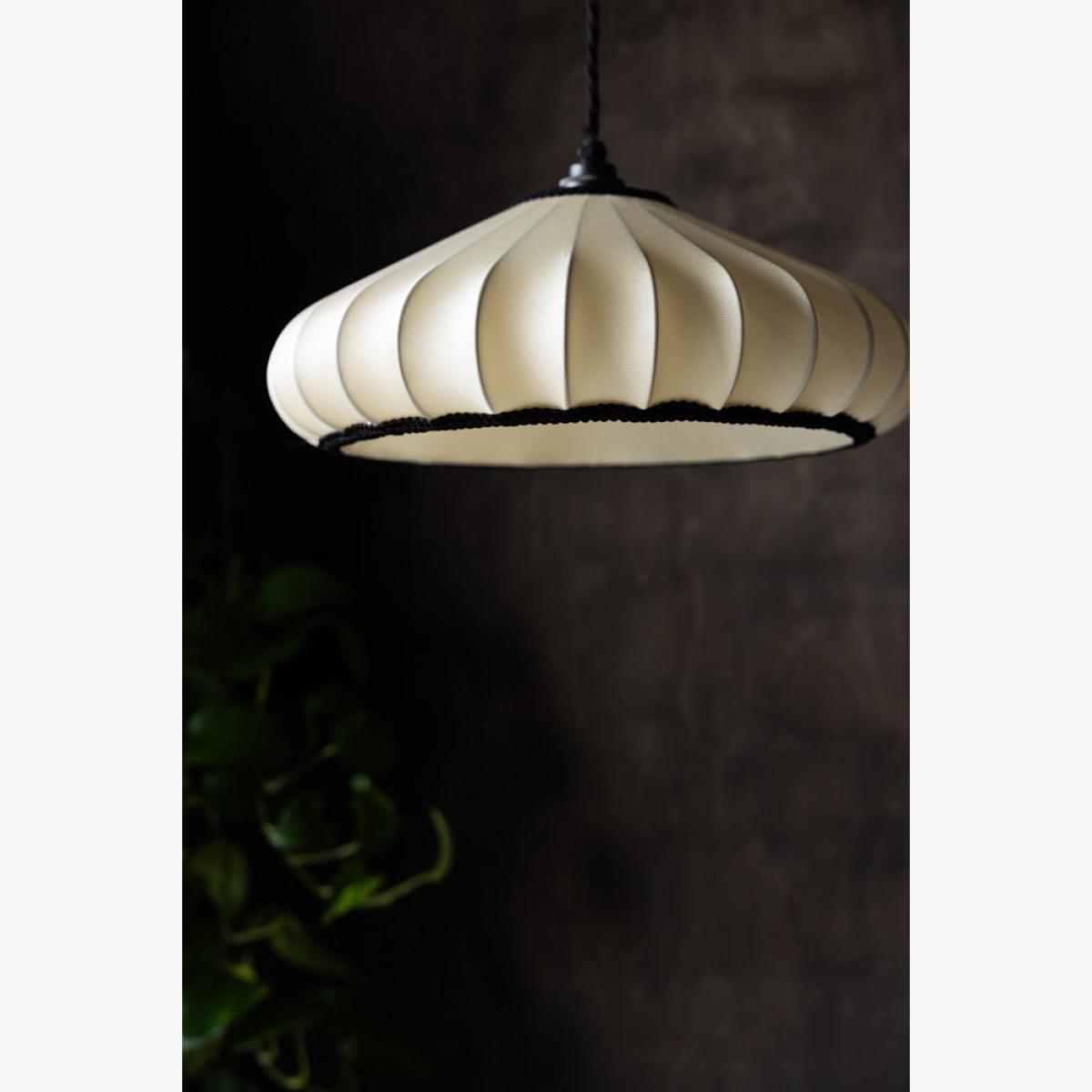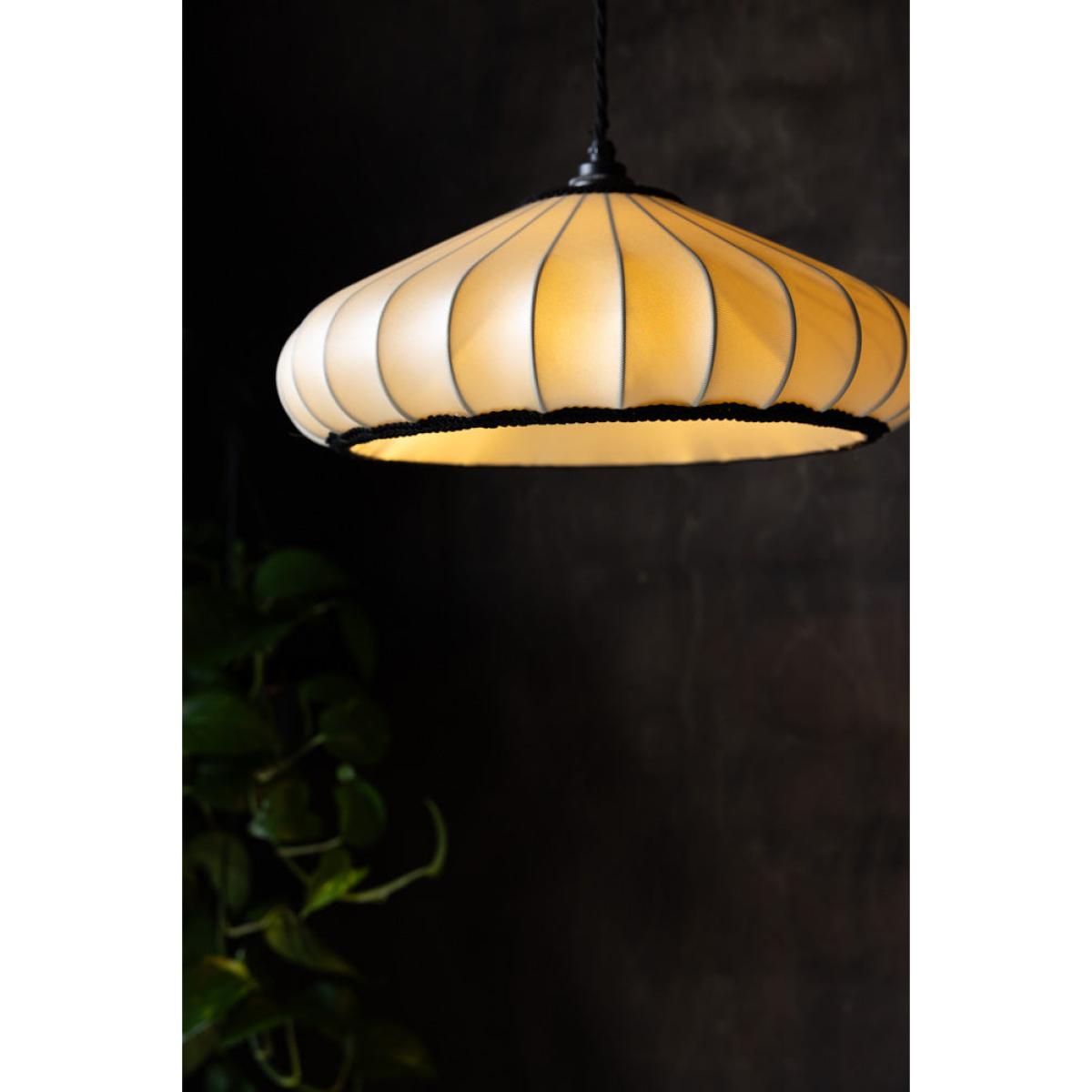 <!--td --> This beautiful, ribbed lampshade brings a touch of subtle elegance to your surroundings, whether you choose to style this in the living room, bedroom or hallway. Crafted in a delicate oyster colour, this piece is all about the neutrals during the daytime, but come the evening, when the lights go on, this takes on a gorgeously warmer hue that adds character and depth to your living space. We love the ribbed design, which gives this an artisanial yet sophisticated feel, and the black piping around the bottom of the shade that creates a pleasing contrast and adds a simple but stylish flourish to the overall finish.- Lantern Style Flush Easyfit Light Shade- Material: Polyester and Cotton - Measures: H15cm x W40cm x D40cm- Requires E27 40w bulb LED