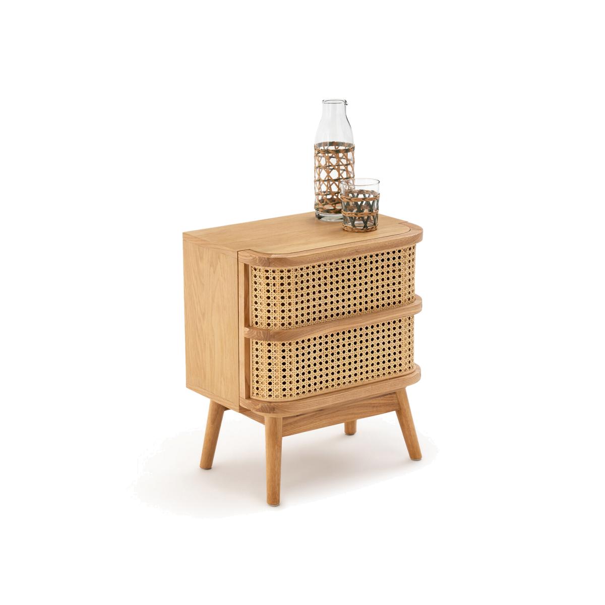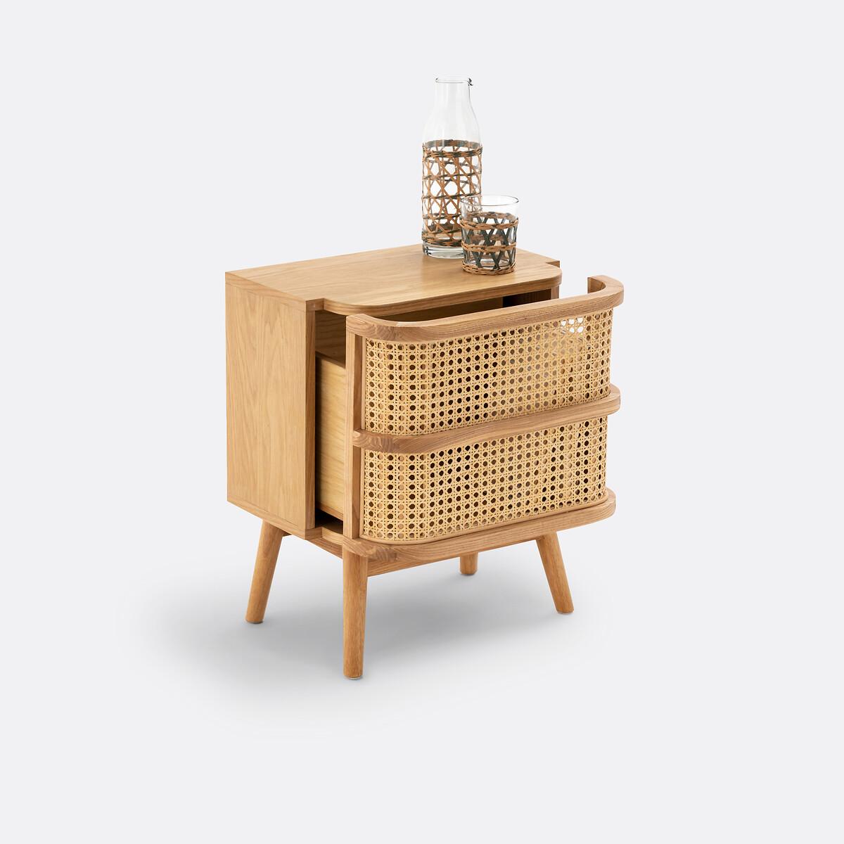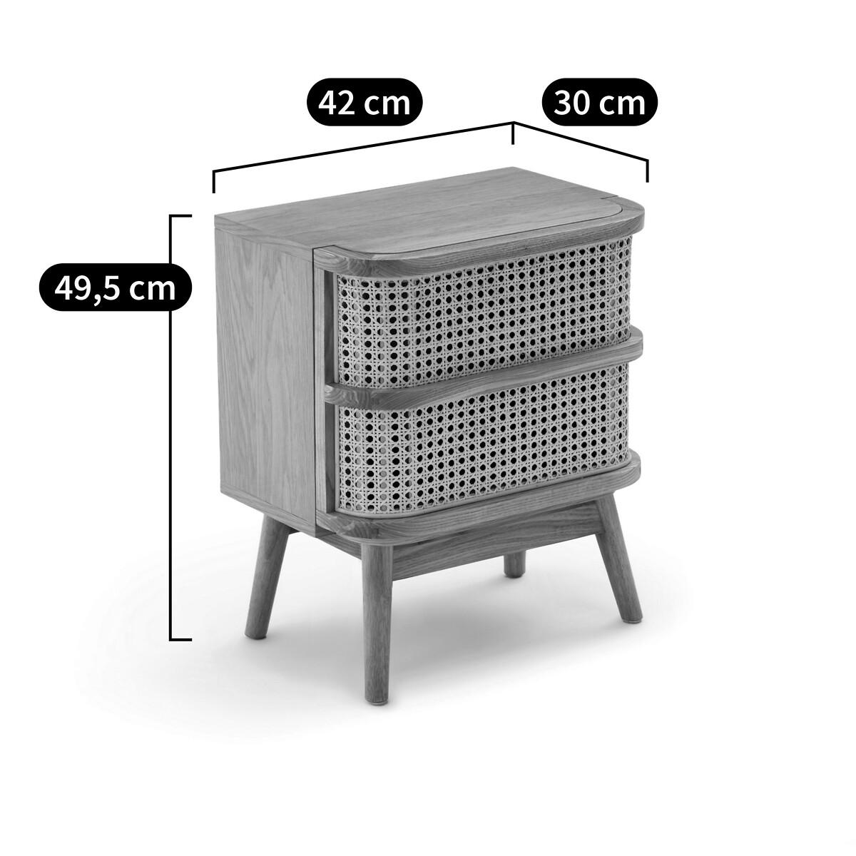 The Laora 1-drawer cane bedside table combines wood and rattan cane front, well in line with the trend. It will look great in your home. Product Details • 1 drawer • Ash veneered MDF cabinet, nitrocellulose varnish finish • Legs in solid rubberwood stained oak, nitrocellulose varnish finish • Drawer front in solid ash and rattan caneDimensions. Overall • Width: 42cm • Height: 49.5cm • Depth: 30cm • Weight: 9kg. Usable dimensions • Drawer: L33.5 x H20 x D24.5 cm • Sold with feet to be attached. • WOOD FROM SUSTAINABLY MANAGED FORESTS. FSC® certified wood comes from forests that are environmentally, socially and economically well managed. Parcel Dimensions1 parcel • L38.5 x H45 x D48.5 cm. 10.7 kg.