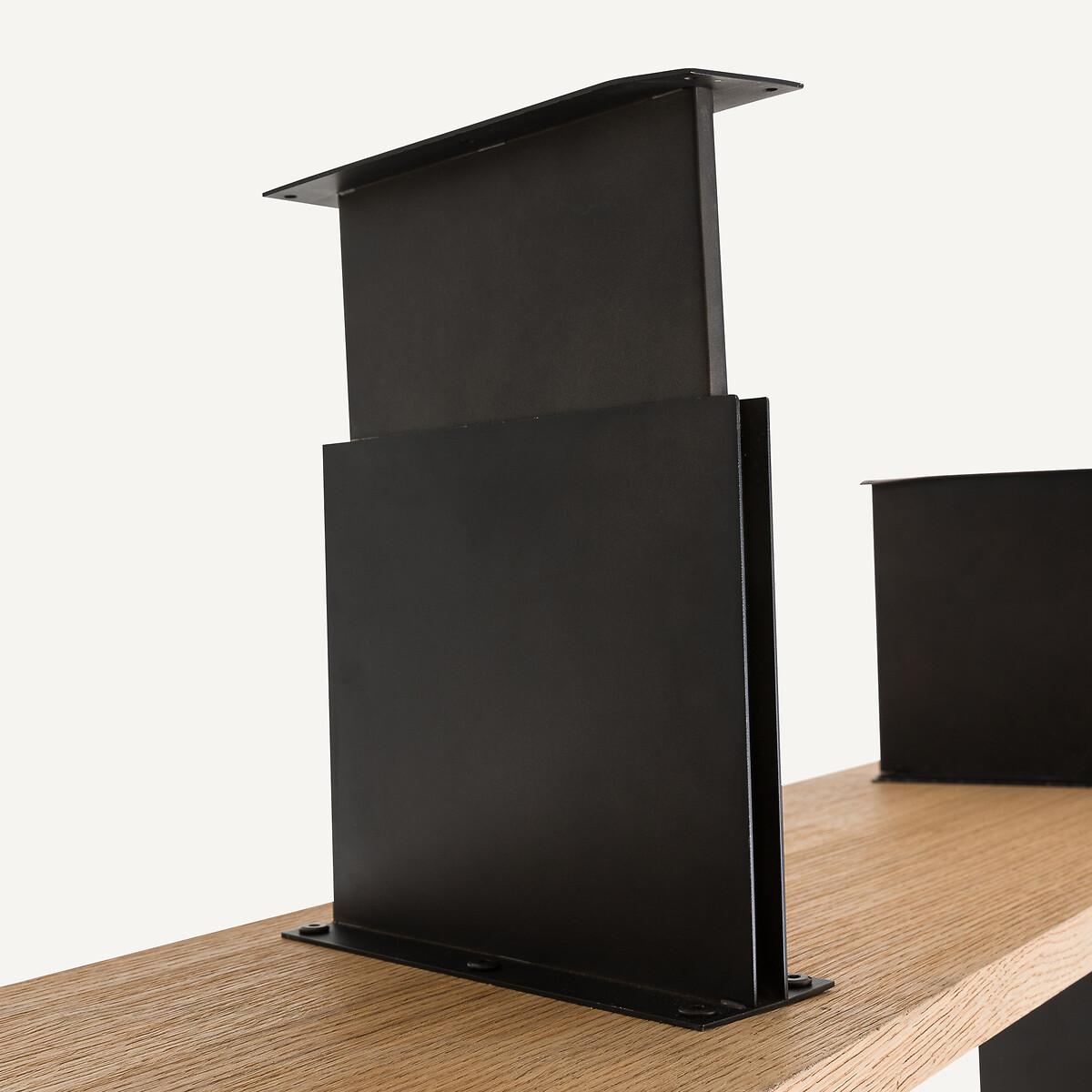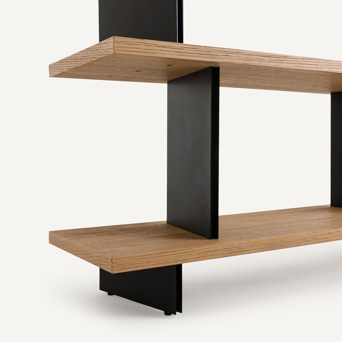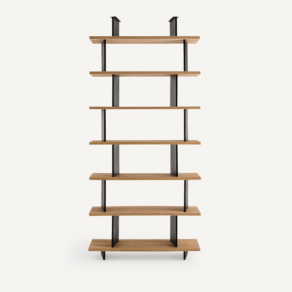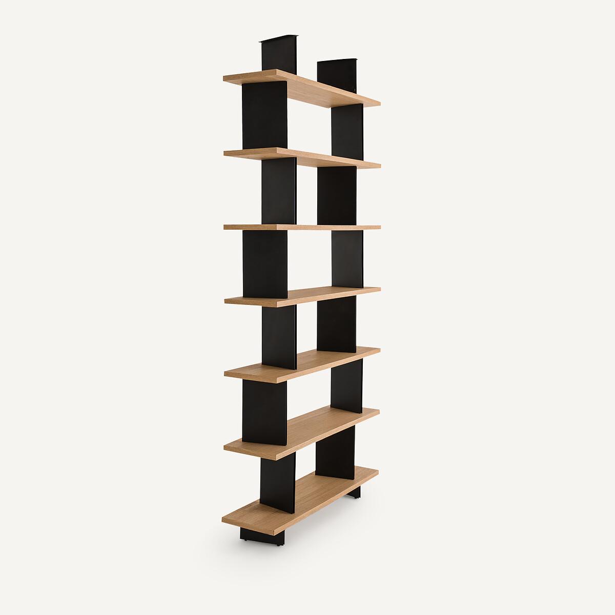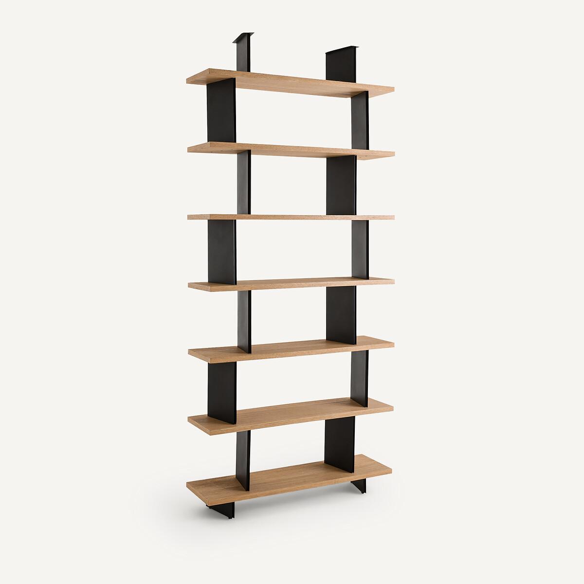 Sculptural and modular, Laos is a bookcase unit that lends itself to numerous purposes. In a linear configuration along a wall, multiple bookcases together form wall coverage. Placed in the centre of a room, they act as a divider between spaces, allowing light to pass through. Positioned in a corner, they create an intimate, more cosy space. The vertical metal elements provide a break from the linearity of the sandblasted oak shelves. A signature AMPM design. Product Details • Shelves in MDF sanded oak veneer FSC®, nitrocellulose finish • Fixed steel louvers with used effect epoxy finish • Wall fixing provided (2 small brackets), screws and plugs not included • Adjustable ceiling mounting provided (2 removable slats), screws and plugs not includedDimensions. Overall • Width: 110cm • Depth: 30cm • Height without high slats if wall mounted: 222.5cm • Height with slats if ceiling mounted: from 244 to 257cm (adjustable)Usable space • Shelf: L110 x H32 x D30cmDelivery:. Assembly required. Available for home delivery. Note! Please check that all access points are large enough to accommodate your delivery (doors, stairs, lifts). • WOOD FROM SUSTAINABLY MANAGED FORESTS. FSC® certified wood comes from forests that are environmentally, socially and economically well managed. Dimensions and weight of parcel2 parcels • L42 x H41 x D32cm, 45kg • L120 x H27.5 x D40cm, 50kg
