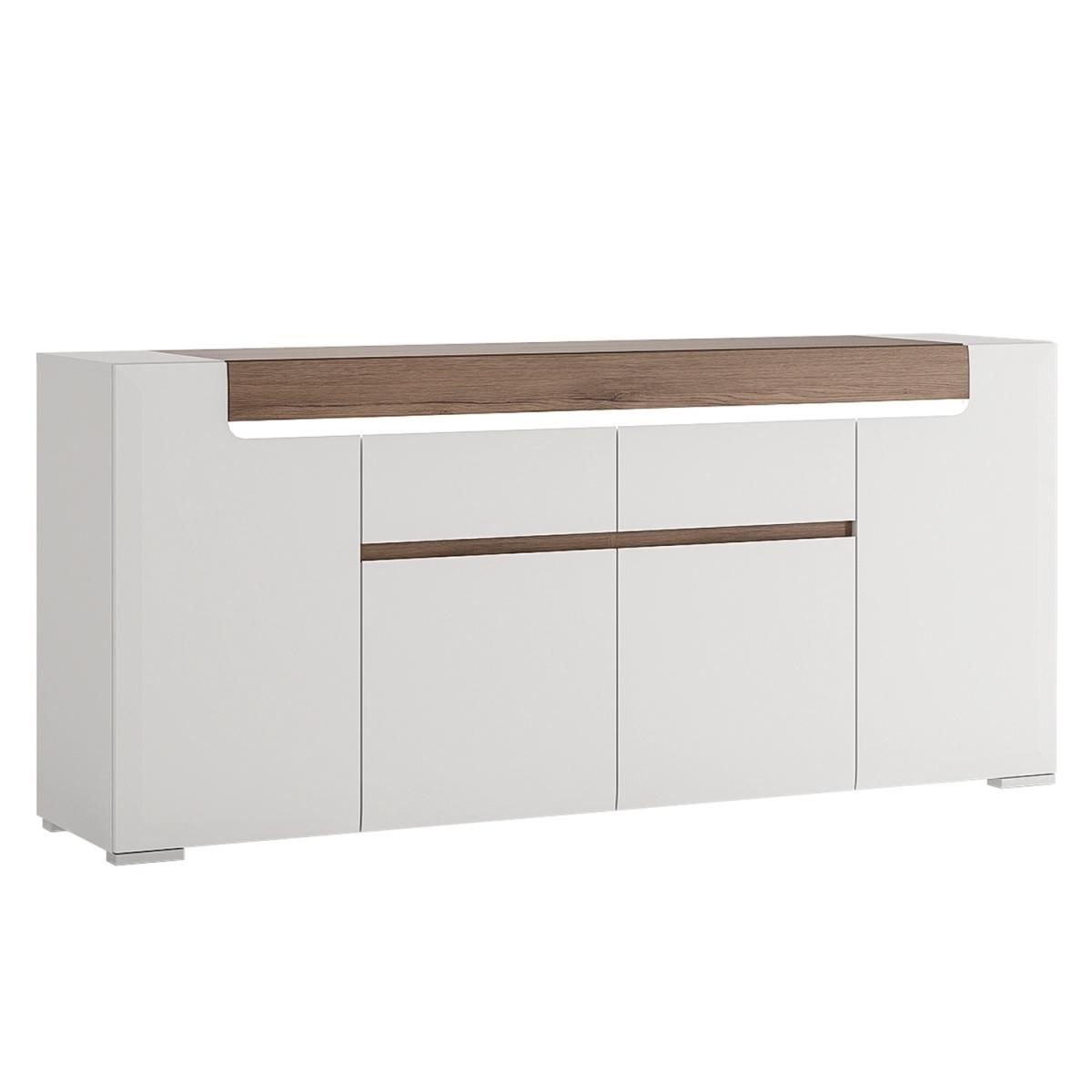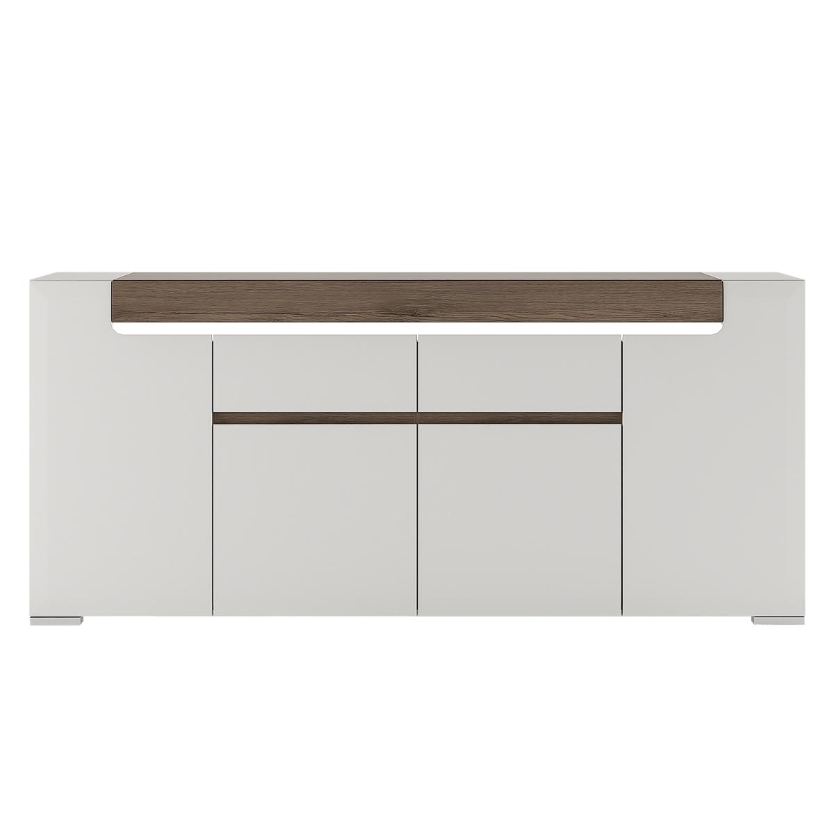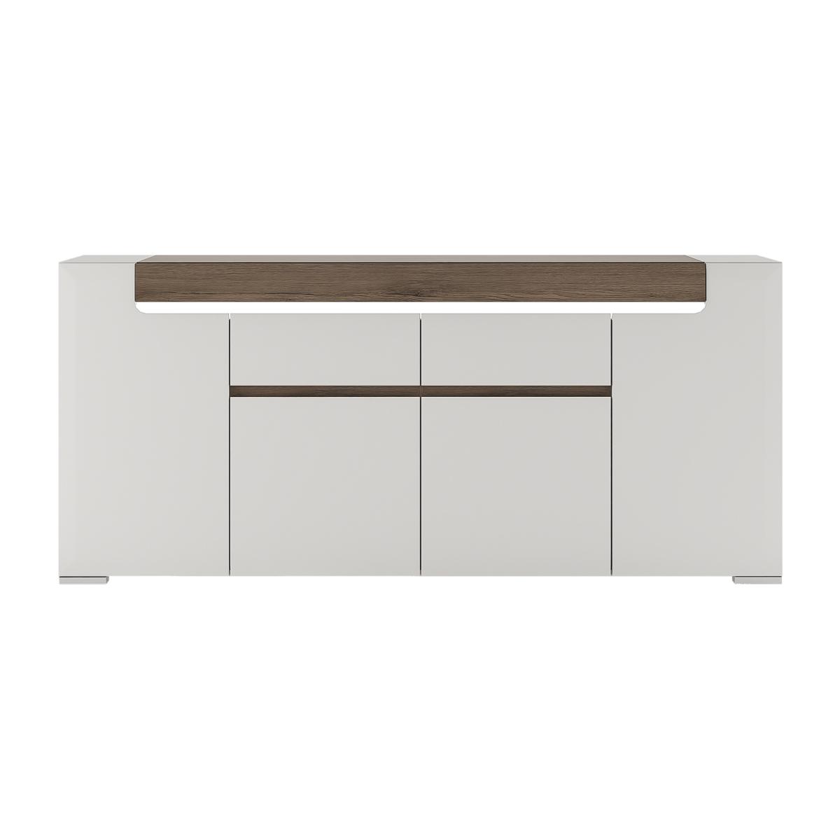 A smart and contemporary addition to any home, the Laos Four Door Two Drawer Sideboard with Flex Light will provide a wonderful storage solution with a modern twist. Beautifully styled with a wide design, the sturdy frame comes complete with two drawers and four cupboards, ideal for storing everything from paperwork, spare keys and dinnerware. The sideboard features soft close doors and drawers, internal LED lighting and adjustable shelves, while the sleek finish in white high gloss is complemented with an oak trim so you can display your belongings in style.