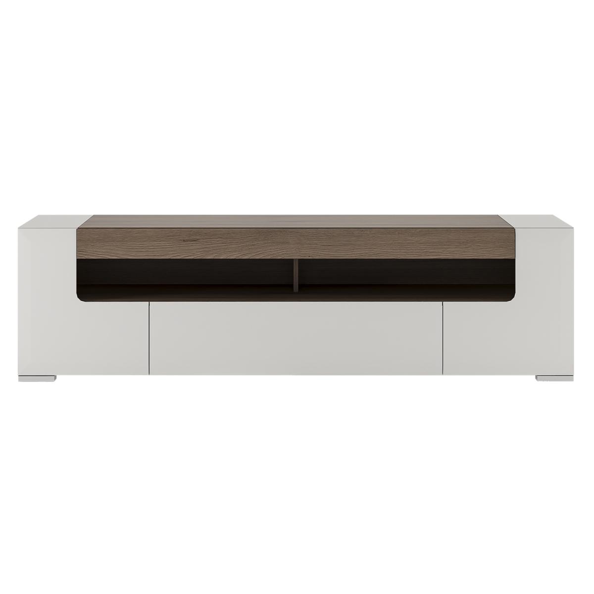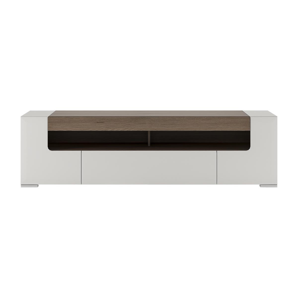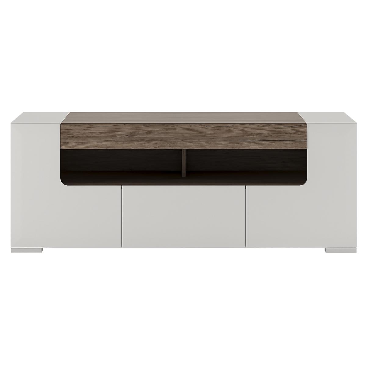 Rejuvenate your TV area with the smart and contemporary Laos Wide TV Cabinet. Securely housing any modern TV, the storage unit will give your television a modern dimension to transform the way you watch your favourite films and shows. Its white high gloss finish is complemented with a sophisticated oak trim to effortlessly suit any existing decor, whilst the ample storage space allows you to store discs, DVD players, remote controls and more. Why compromise on style or practicality when you can have both?