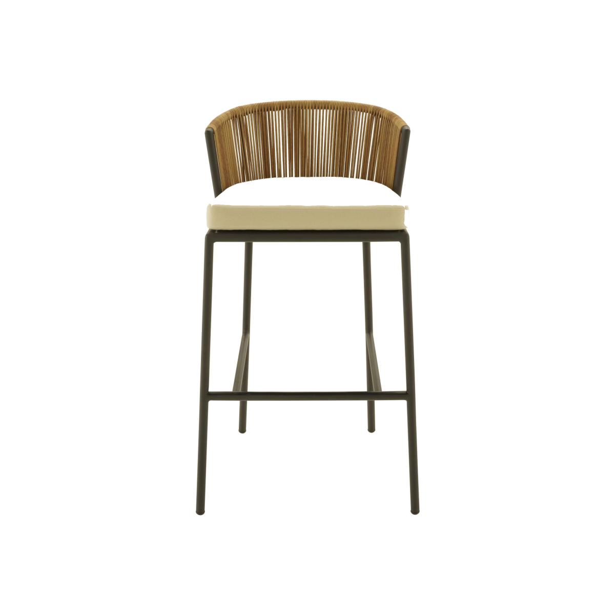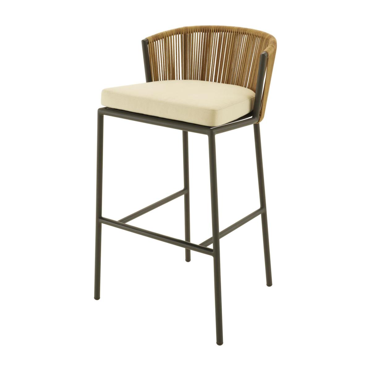 The Lapel bar chair consists of a large shell made of woven synthetic wicker. This durable, hard-wearing material perfectly reproduces the warm, authentic aspect typical of natural fibre braiding. The perforated material provides great visual lightness. The braiding, made in Indonesia, is extremely complex because it requires a taut, perfect finish. Lapel captures a simple idea: that of a jacket collar or the top of a boot. The seat is made up of two interlocking volumes, creating a play of relief. The taut cords define in the air the particular shape of the seat, characterised by a protruding upper “band” that comfortably wraps the seated person, like a lapel. This protruding strip also has a functional aspect, since it serves as a handle to easily move the seat. The woven synthetic rattan creates an eye-catching moiré effect, brightens the visual volume of the seat and helps with air circulation, allowing it to dry quickly in the event of rain. The refined structure in charcoal-coloured aluminium brings a contemporary dimension to the armchair. Suitable for outdoor use, the Lapel bar chair is just as at home on your terrace as in your living room.