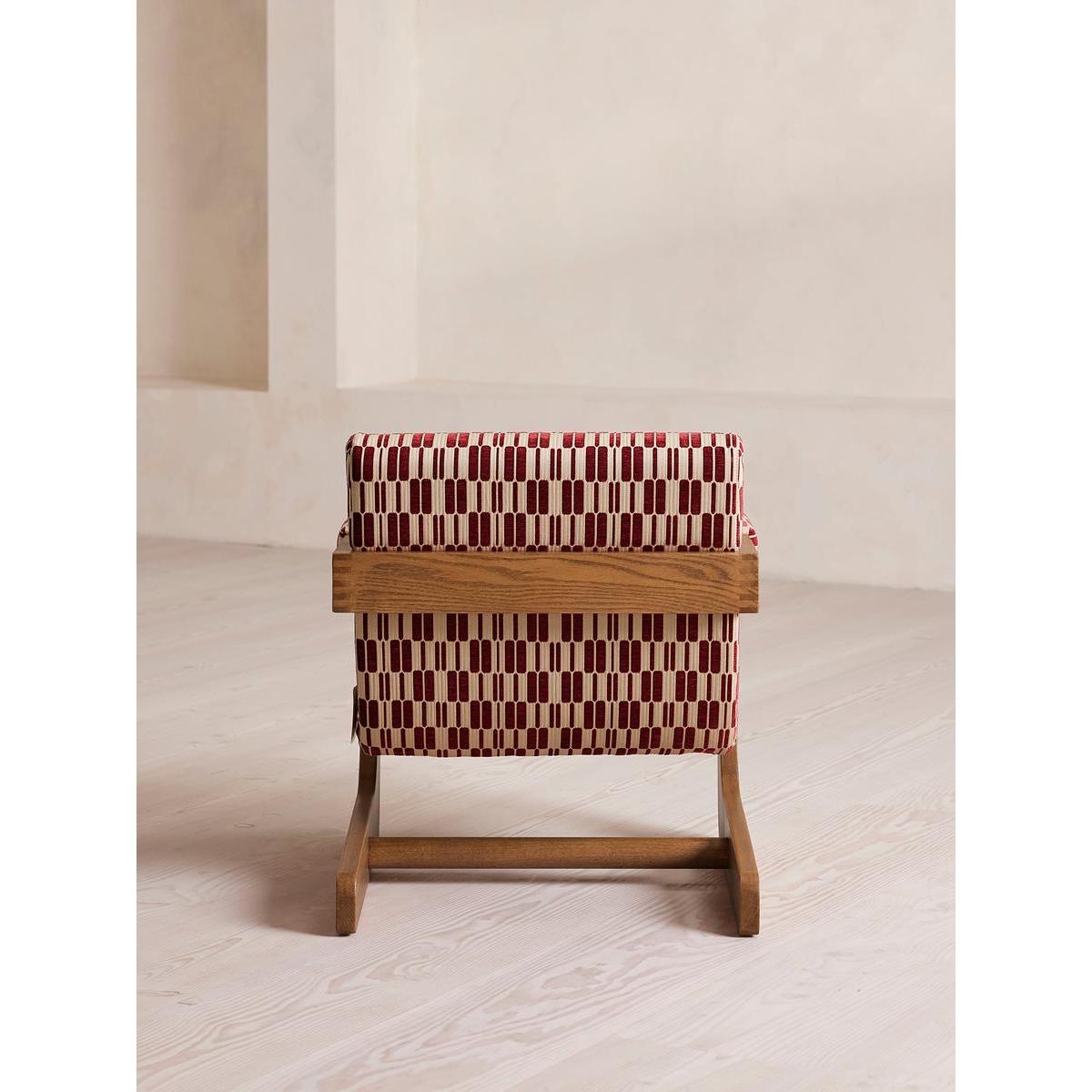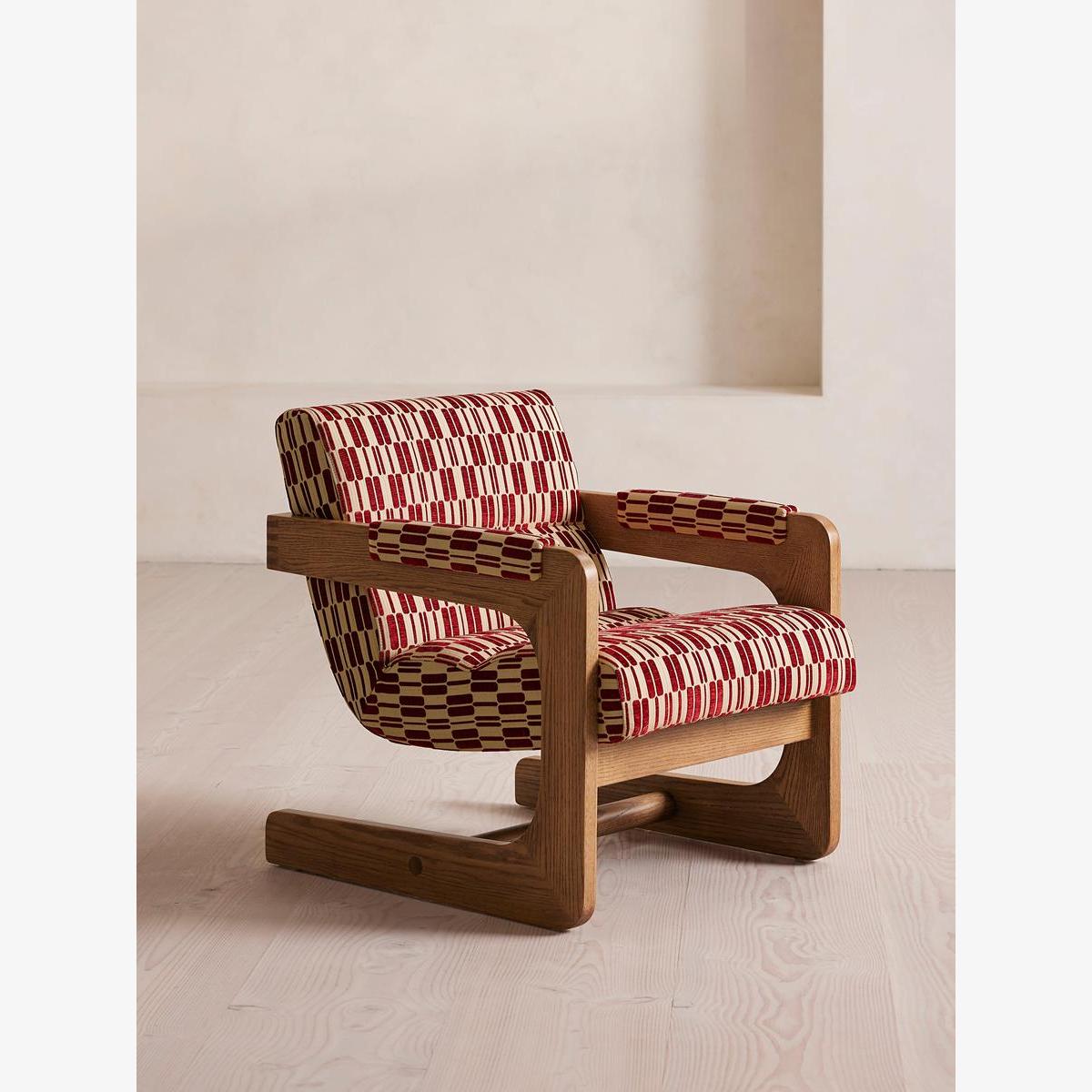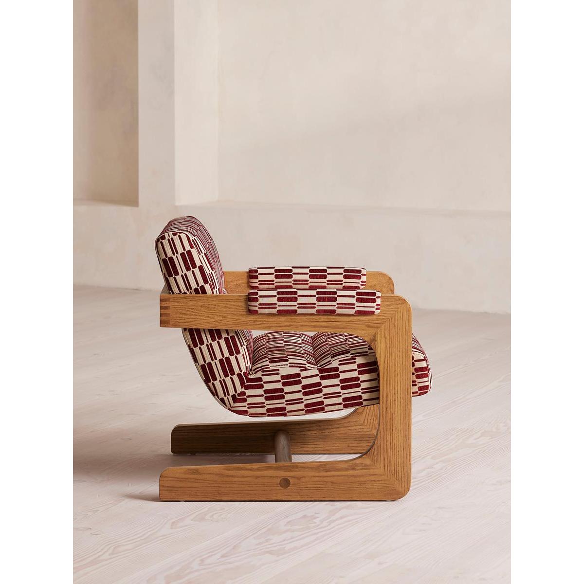 An angular silhouette upholstered in our geometric-inspired Claudius jacquard fabric. Inspired by the interiors of Soho House Rome, the Lara armchair uses traditional oakwood joinery to create its sculptural silhouette. Padded cushioning brings comfort to angular arms, while the seat and backrest are upholstered in our Claudius jacquard fabric.