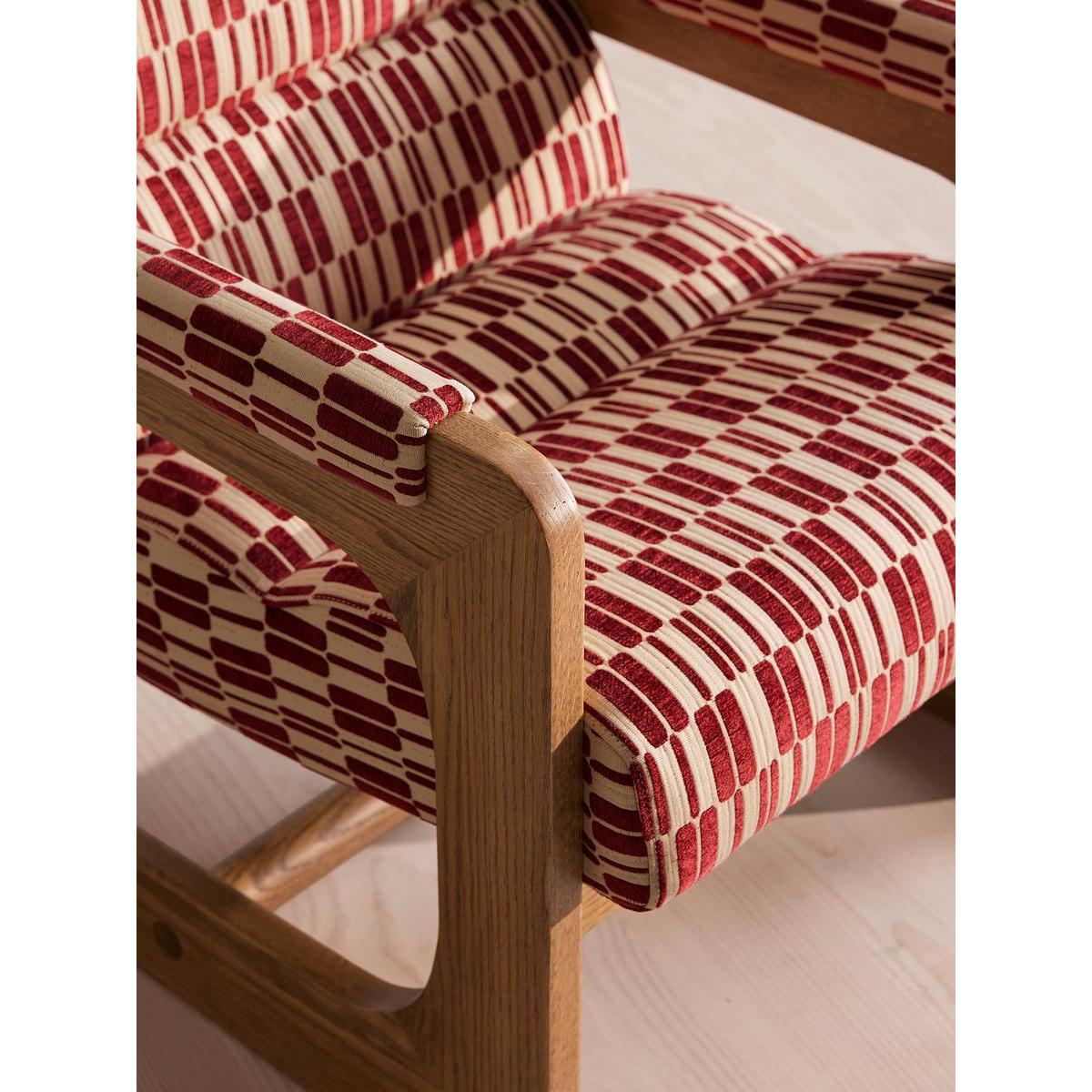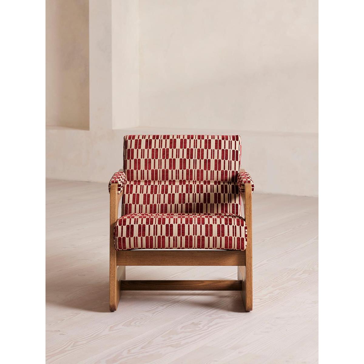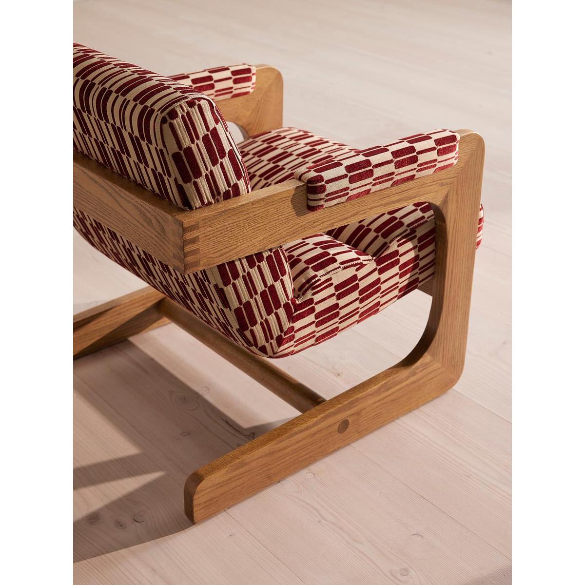 An angular silhouette upholstered in our geometric-inspired Claudius jacquard fabric. Inspired by the interiors of Soho House Rome, the Lara armchair uses traditional oakwood joinery to create its sculptural silhouette. Padded cushioning brings comfort to angular arms, while the seat and backrest are upholstered in our Claudius jacquard fabric.