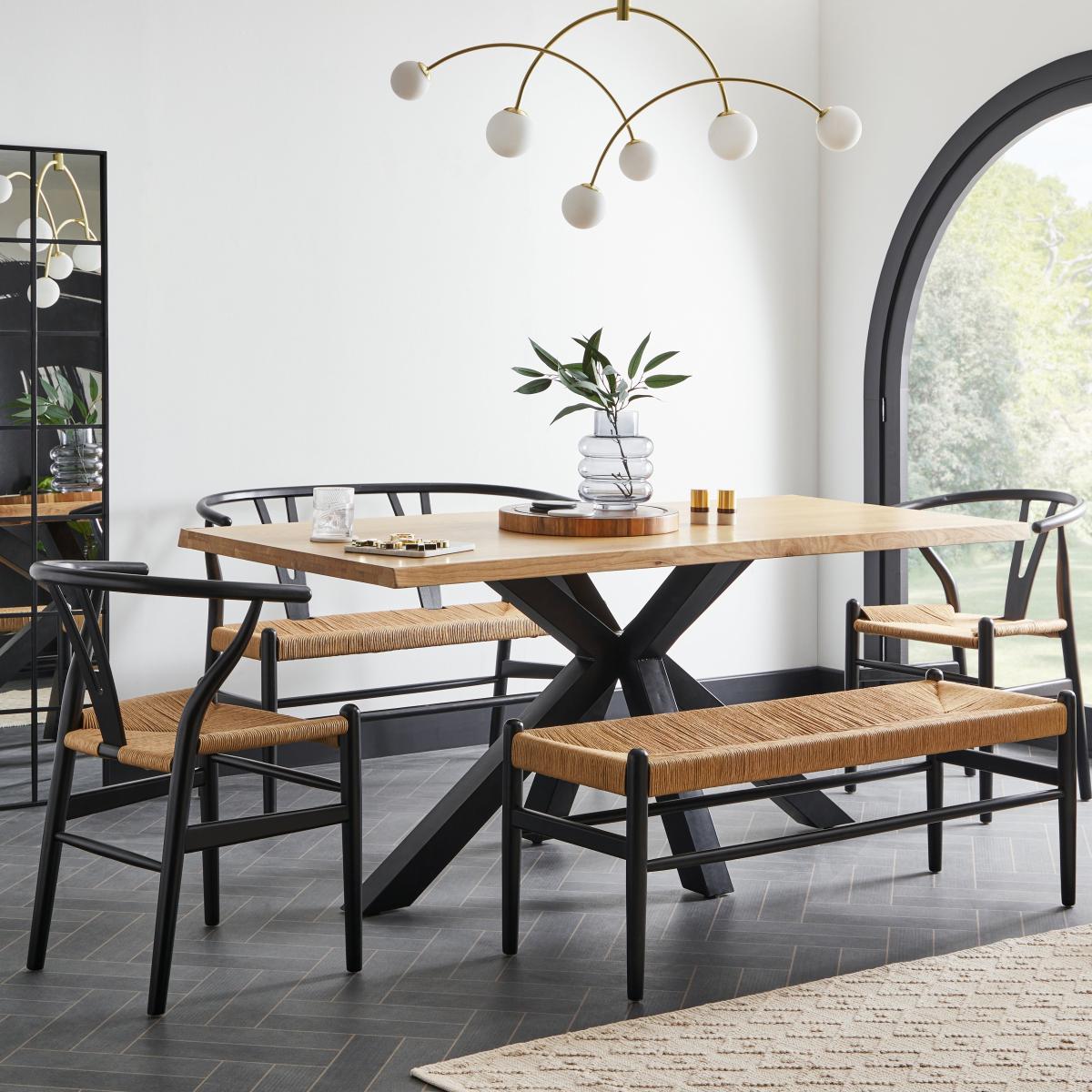 I’m a fan of how this bench’s slim black frame and woven seat balance clean lines with a touch of texture - it feels equally at home in a Scandi-inspired kitchen, a minimalist loft or a more eclectic dining nook. Its low profile keeps sight lines open, so it’s especially useful in smaller or open-plan layouts. For styling, tuck a neutral linen cushion or a light sheepskin throw at one end to soften the look and add comfort. Pair it with a solid oak or marble-topped table and mix in a couple of chairs in a similar black finish for cohesion. In a hallway, it can double as a drop-zone: prop a wicker basket beneath for shoes or blankets and finish with a ceramic vase of foliage.