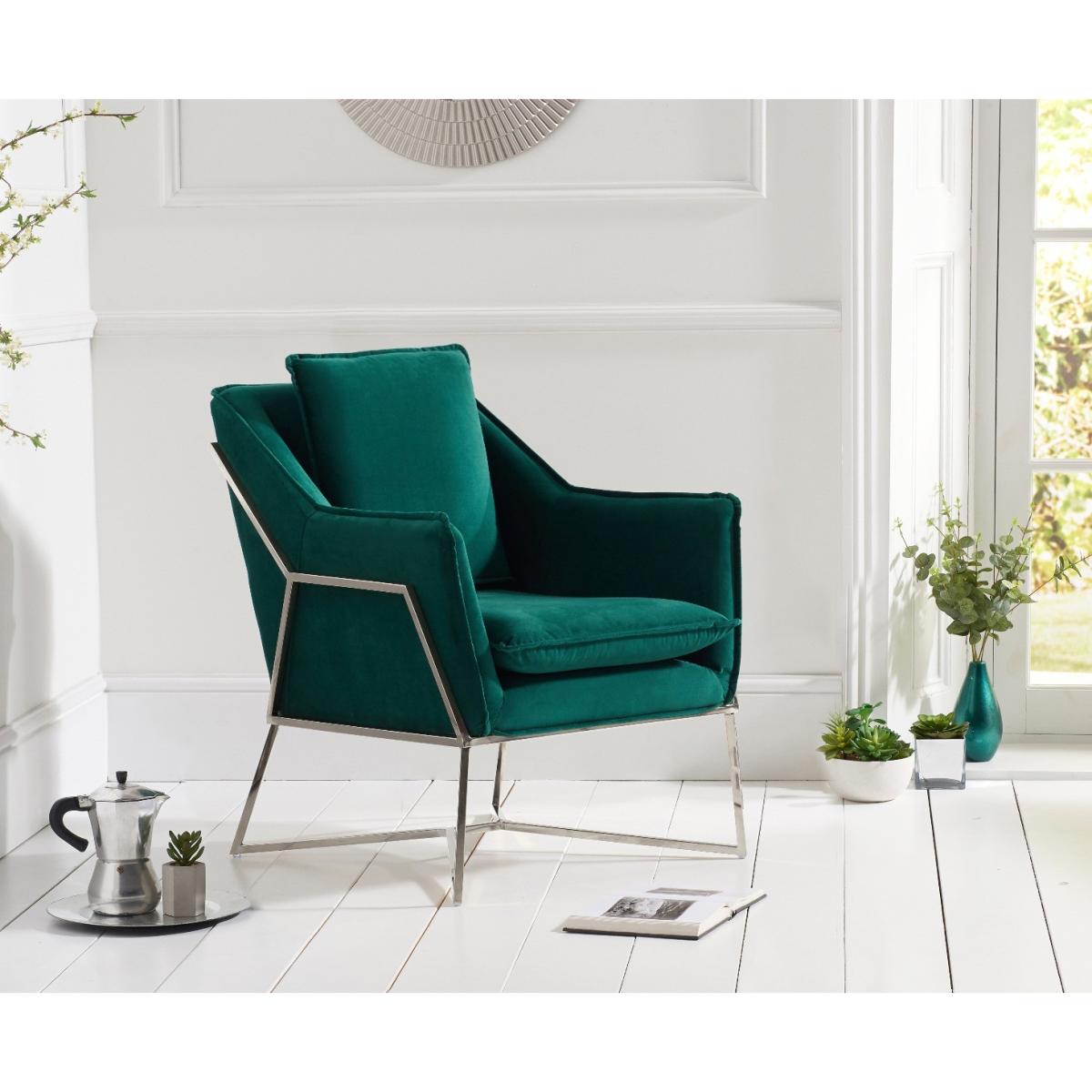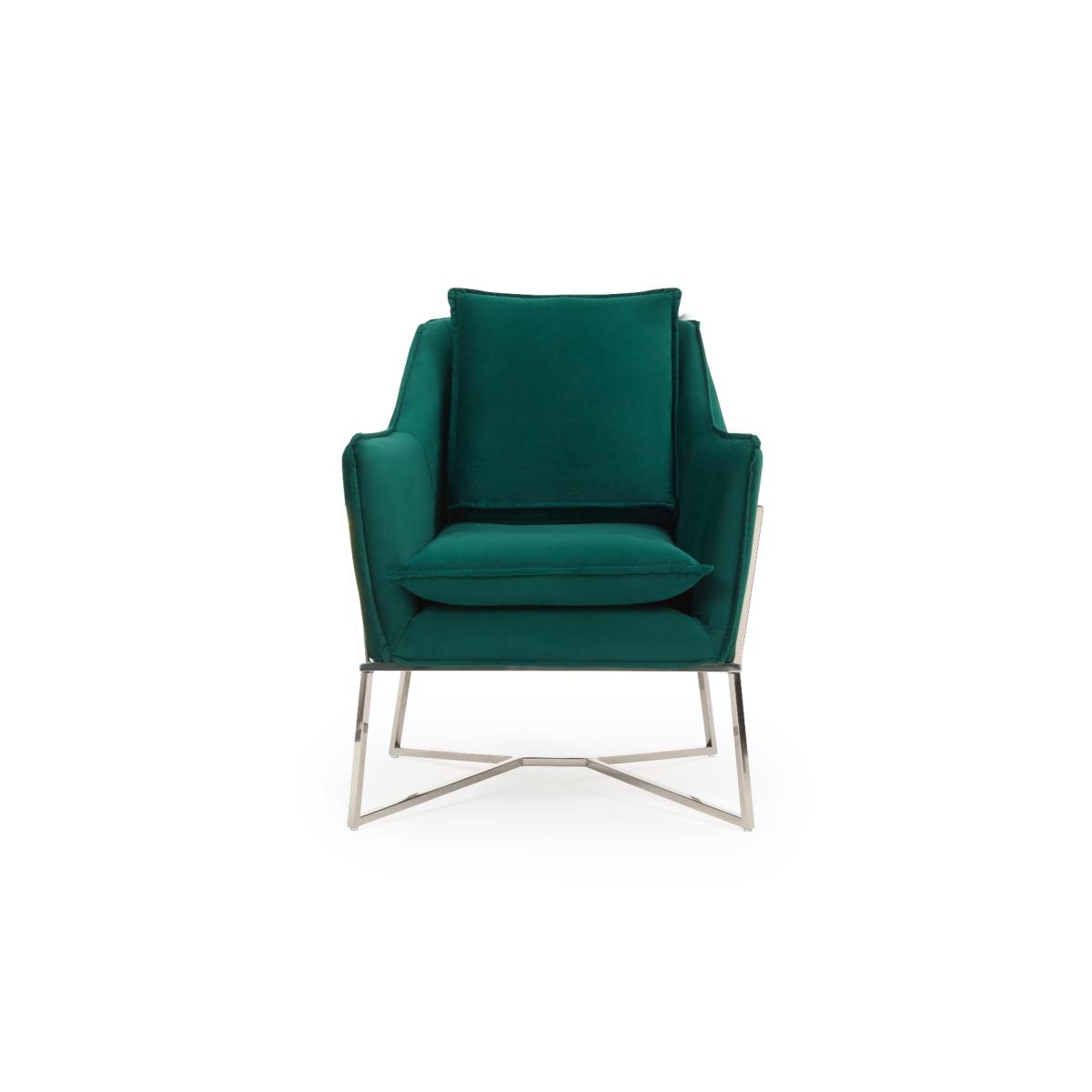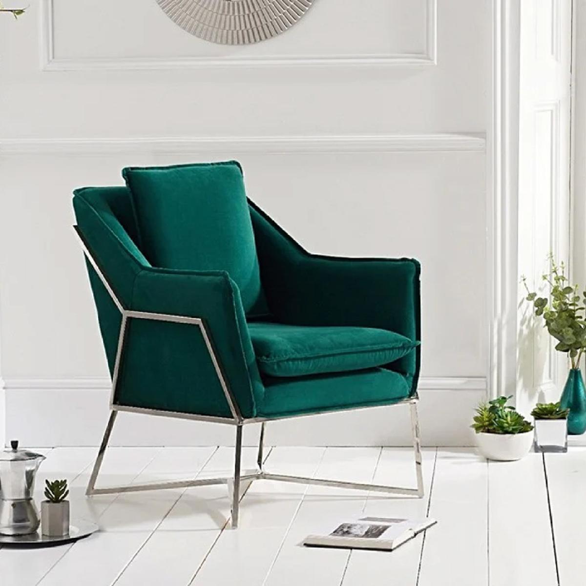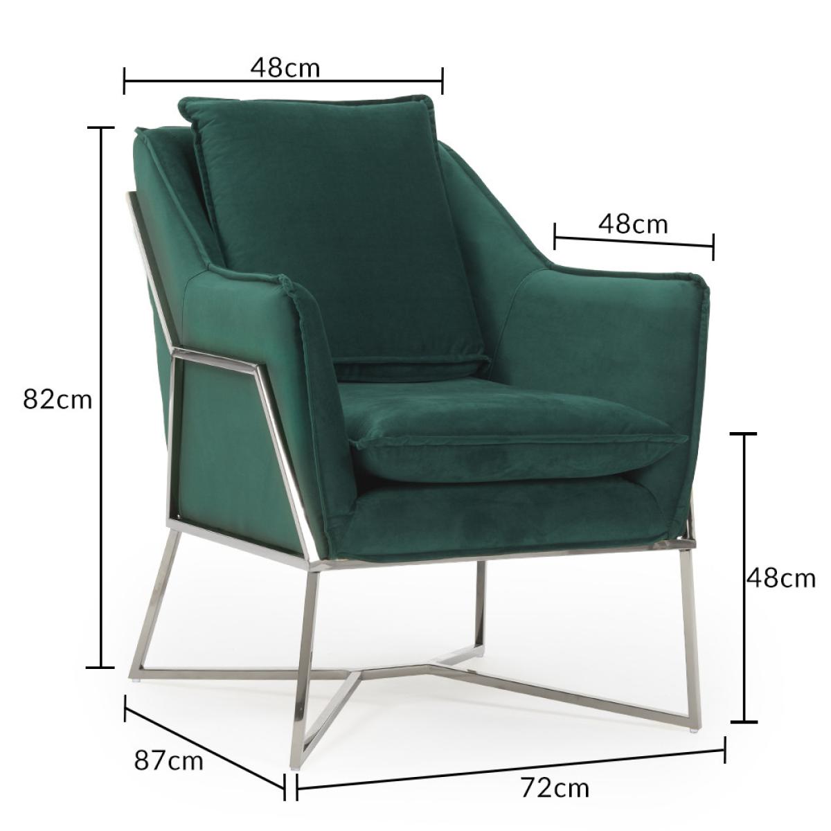 The Lara Green Velvet Accent Chair with Chrome Legs brings unique style to any space. With soft-touch green velvet and comfortable cushioning, the accent chair is complete with a sleek chrome base in a stunning crossed design. Unique accent chair makes a stylish statement Soft-touch velvet in jewel green adds a pop of colour Comfortable padded frame with seat and back cushion Sleek chrome base in an eye-catching crossed design