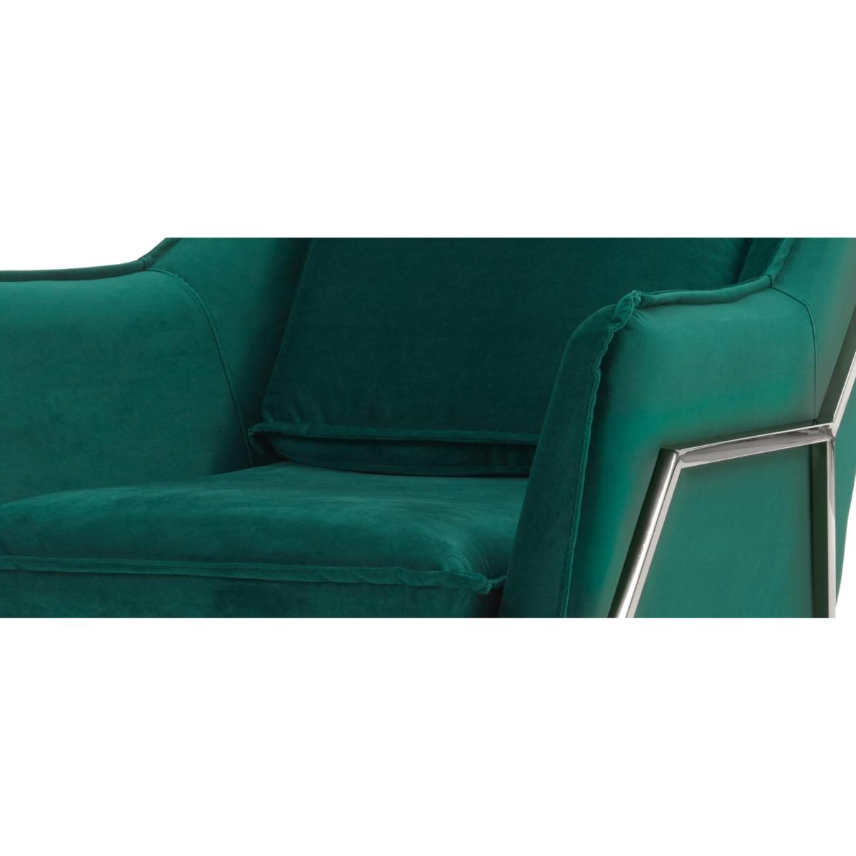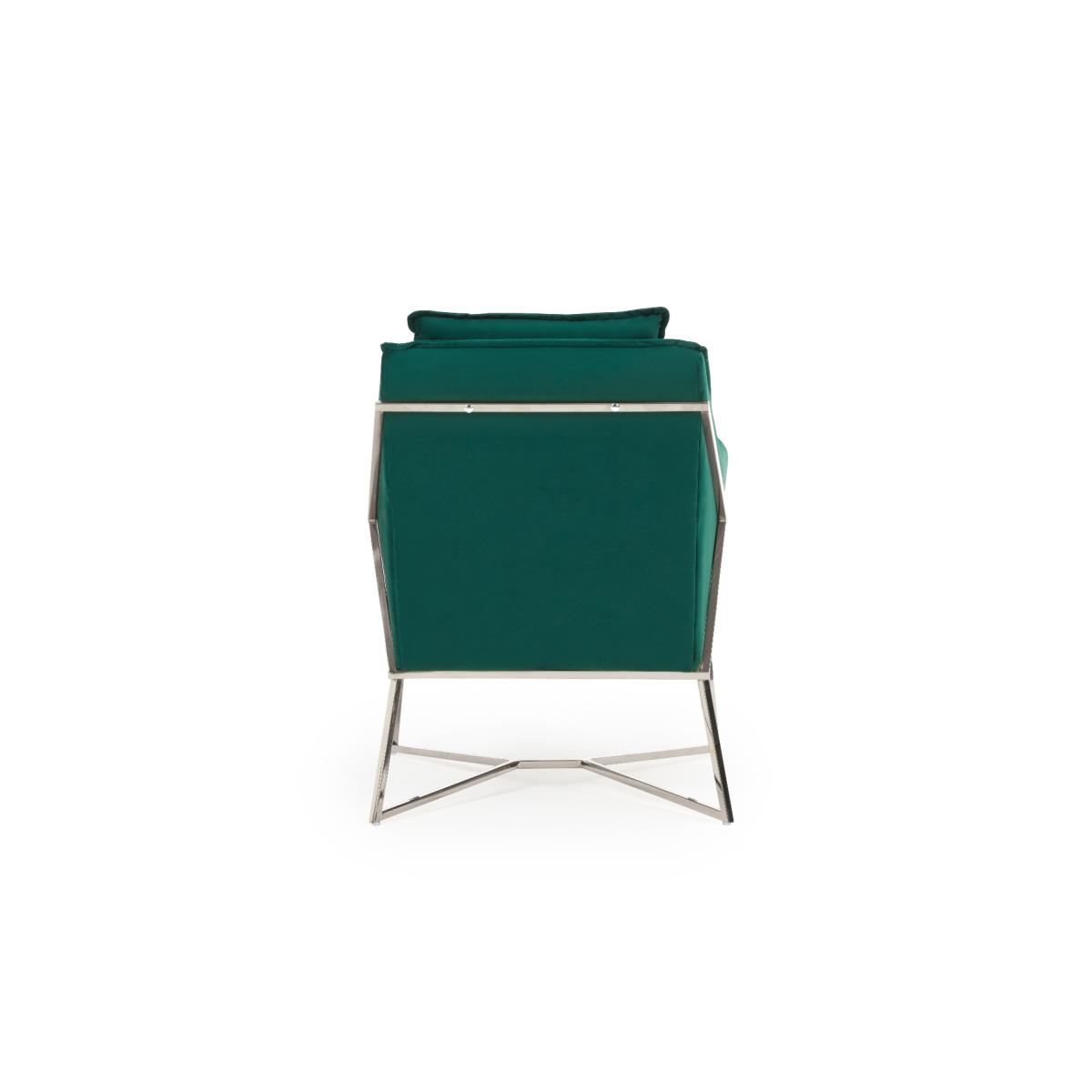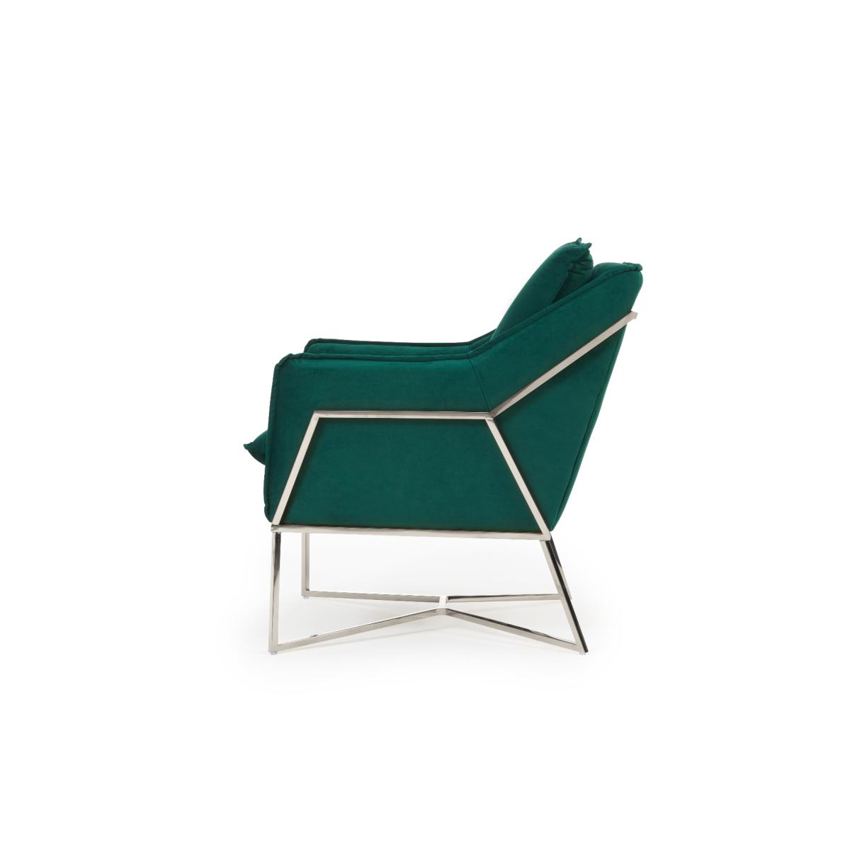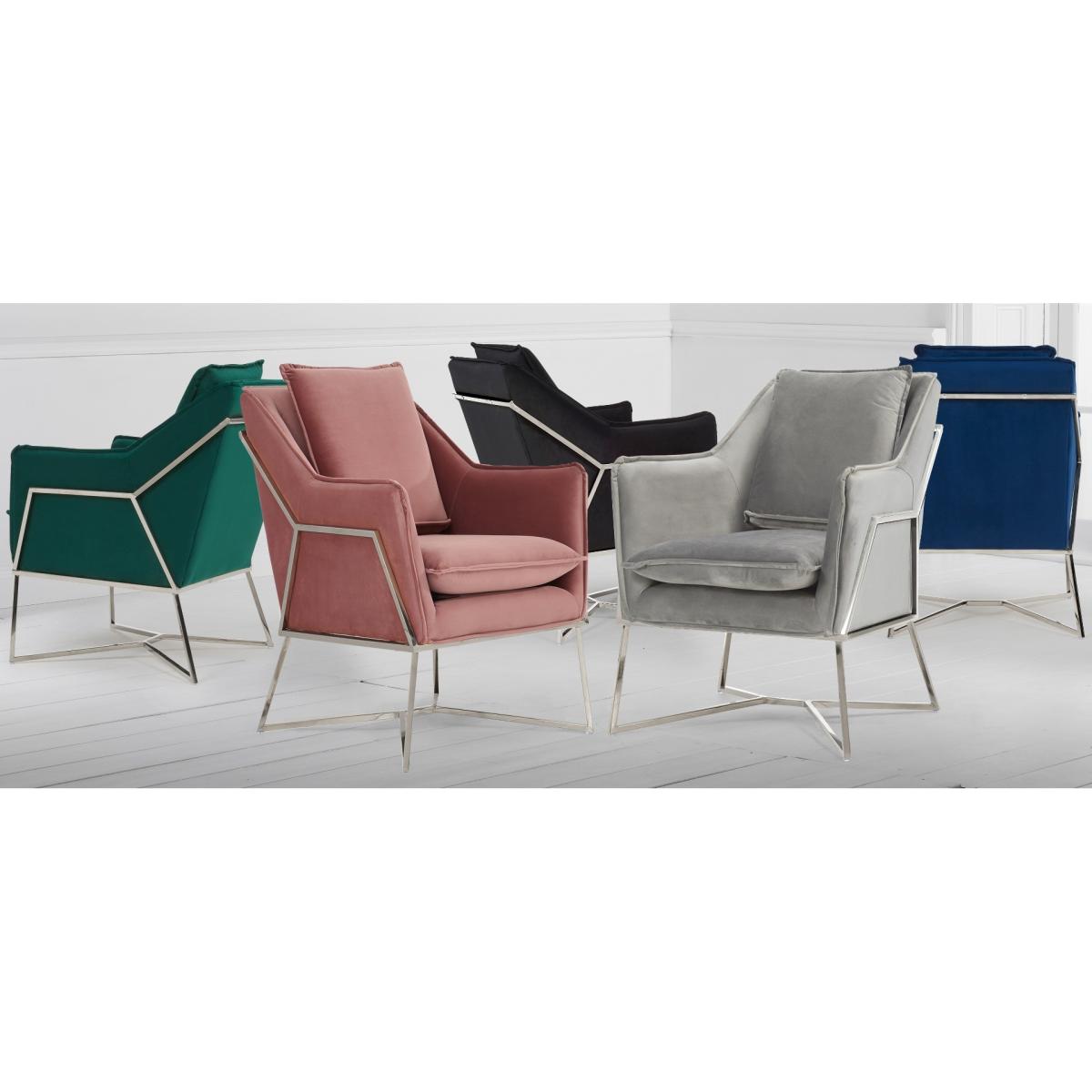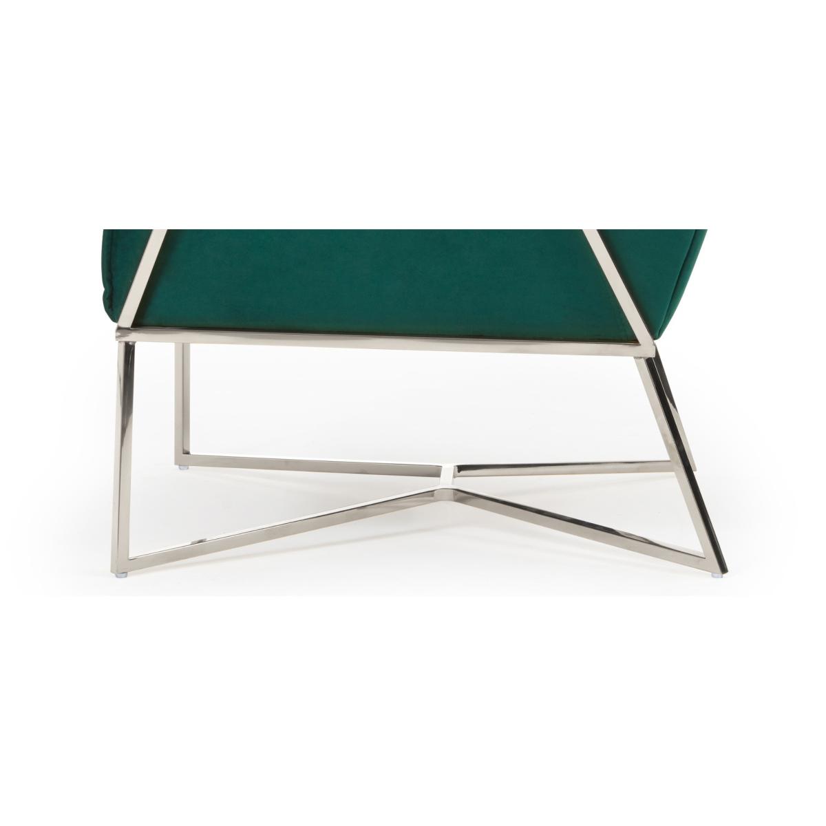 The Lara Green Velvet Accent Chair with Chrome Legs brings unique style to any space. With soft-touch green velvet and comfortable cushioning, the accent chair is complete with a sleek chrome base in a stunning crossed design. Unique accent chair makes a stylish statement Soft-touch velvet in jewel green adds a pop of colour Comfortable padded frame with seat and back cushion Sleek chrome base in an eye-catching crossed design