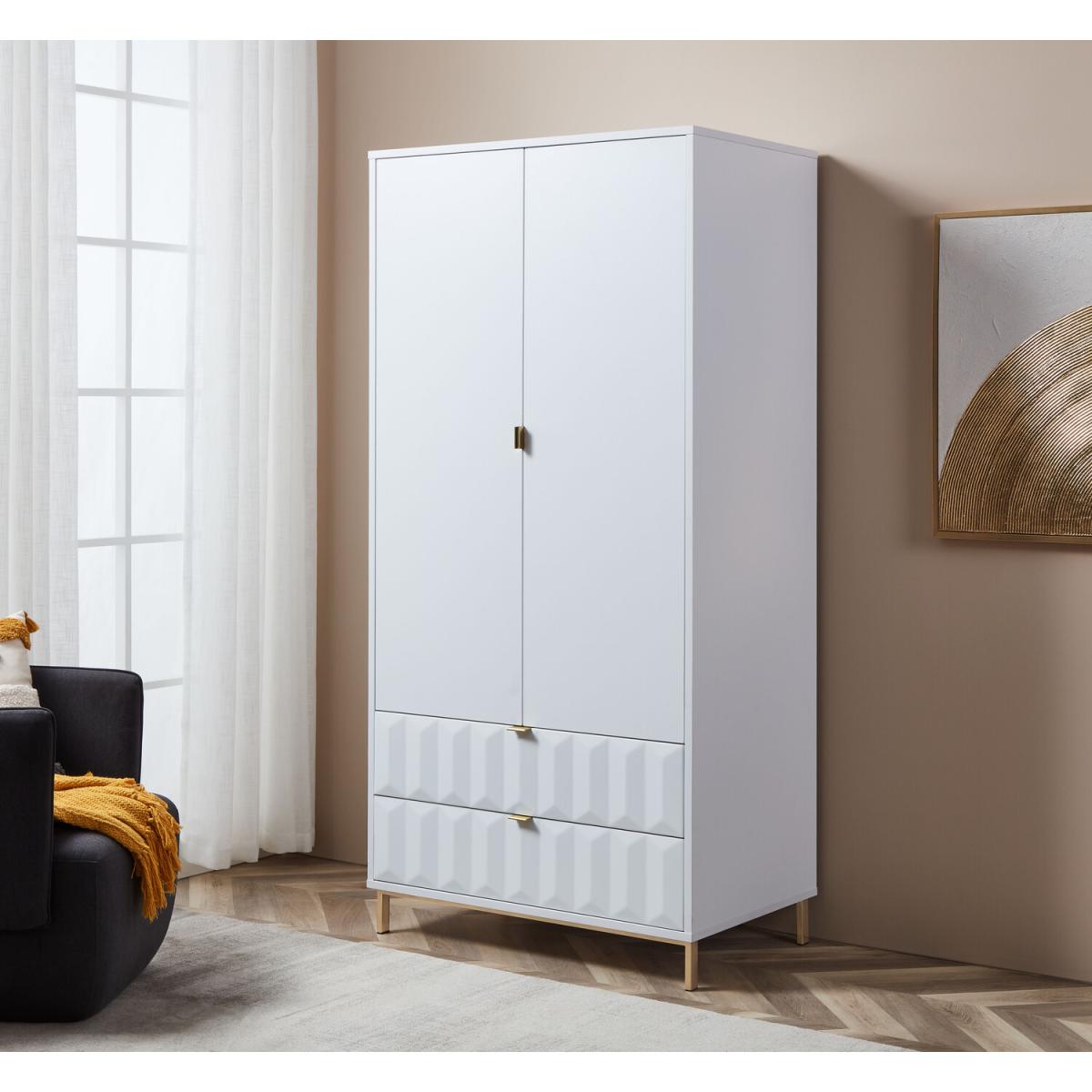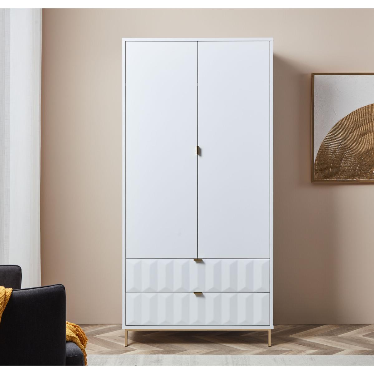 The shaped door front on this Lara Wardrobe creates a modern aesthetic in your bedroom for a refreshing upgrade. Not only is it easy to assemble and clean for your convenience, but it provides a large storage capacity for clothes and accessories thanks to the hang rail, integrated shelf, and two drawers. Plus, the gorgeous white tone means this wardrobe can easily be coordinated with your existing furniture and decor.