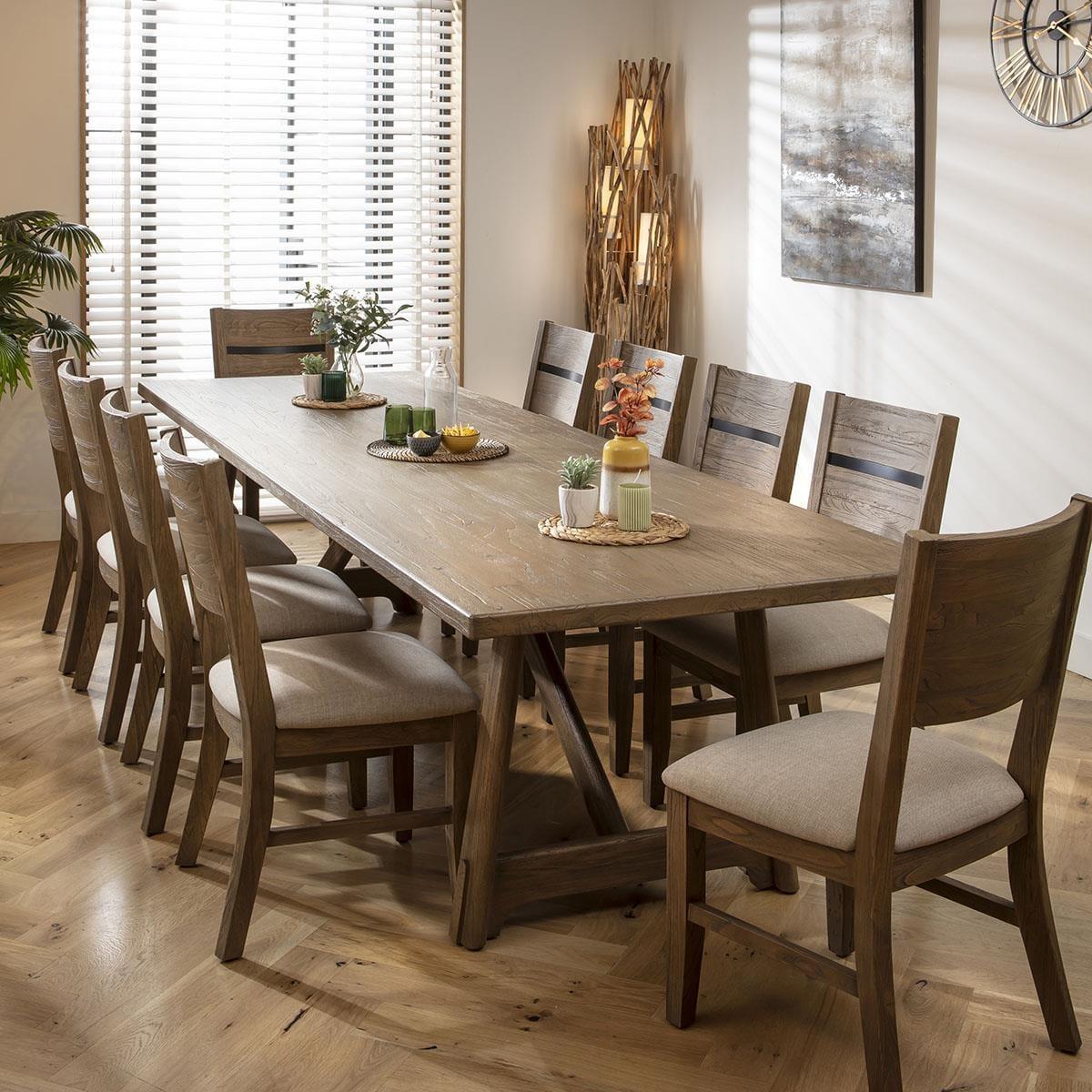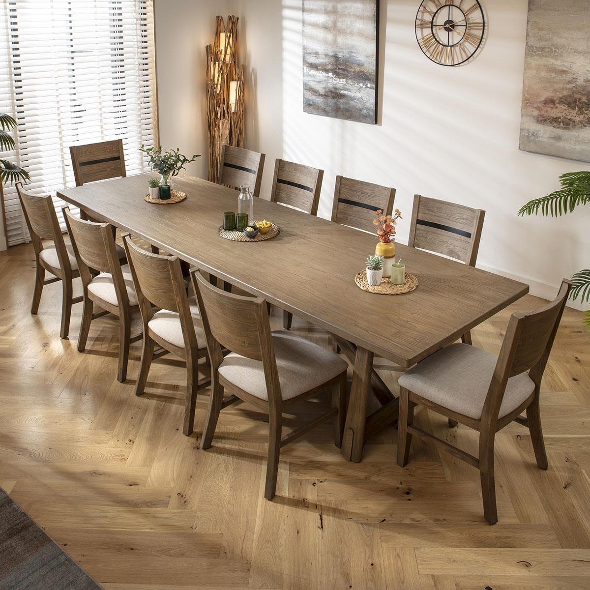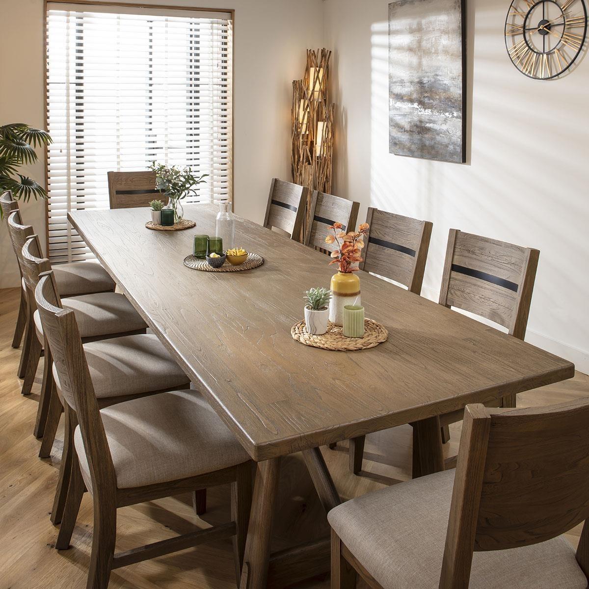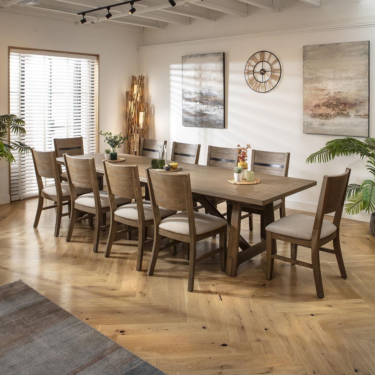 This 10 seater dining table and chairs set includes wooden dining chairs finished in a natural lacquered finish with a grey tint, and a fabric seat pad, with our large wooden dining table, crafted from hard-wearing wood with a rustic lacquered finish. This modern dining set is crafted for durability and comfort. The Basset large wooden dining table is a striking piece, perfect for big gatherings. A 10 seater dining table measuring 320cm by 100cm, it offers ample space for family and guests. Crafted from hard-wearing wood with a durable, rustic lacquered finish, this wooden table for dining room settings is stylish and enduring. Enhance your dining space with the 10 premium Basset chairs in this set, the ultimate blend of rustic charm and contemporary design. Crafted from solid wood with a natural lacquered finish in a grey tint, these modern dining chairs elevate any dining room or kitchen. Comfort meets style with a soft, padded seat upholstered in durable cream fabric. The cushion offers comfortable support, making these padded dining chairs perfect for extended dining sessions. This 10 seater dining set combines modern Basset chairs with the stunning Basset table. Whether you love the Basset chairs and would like to purchase them individually, or you think the Basset table would complete your dining room decor better with another chair, you can easily mix and match our modern dining tables and chairs to curate something truly unique. Table Size W320cm D100cm H76cm Chair Size W49cm D60cm H97cm Modern Dining Table And Chairs Set For 10