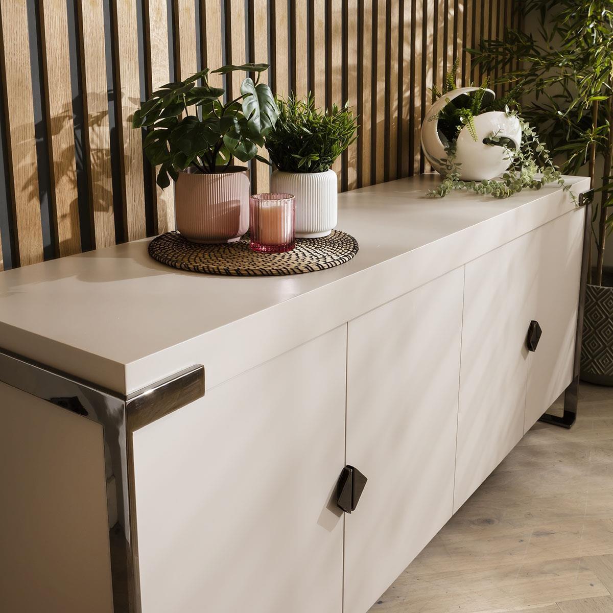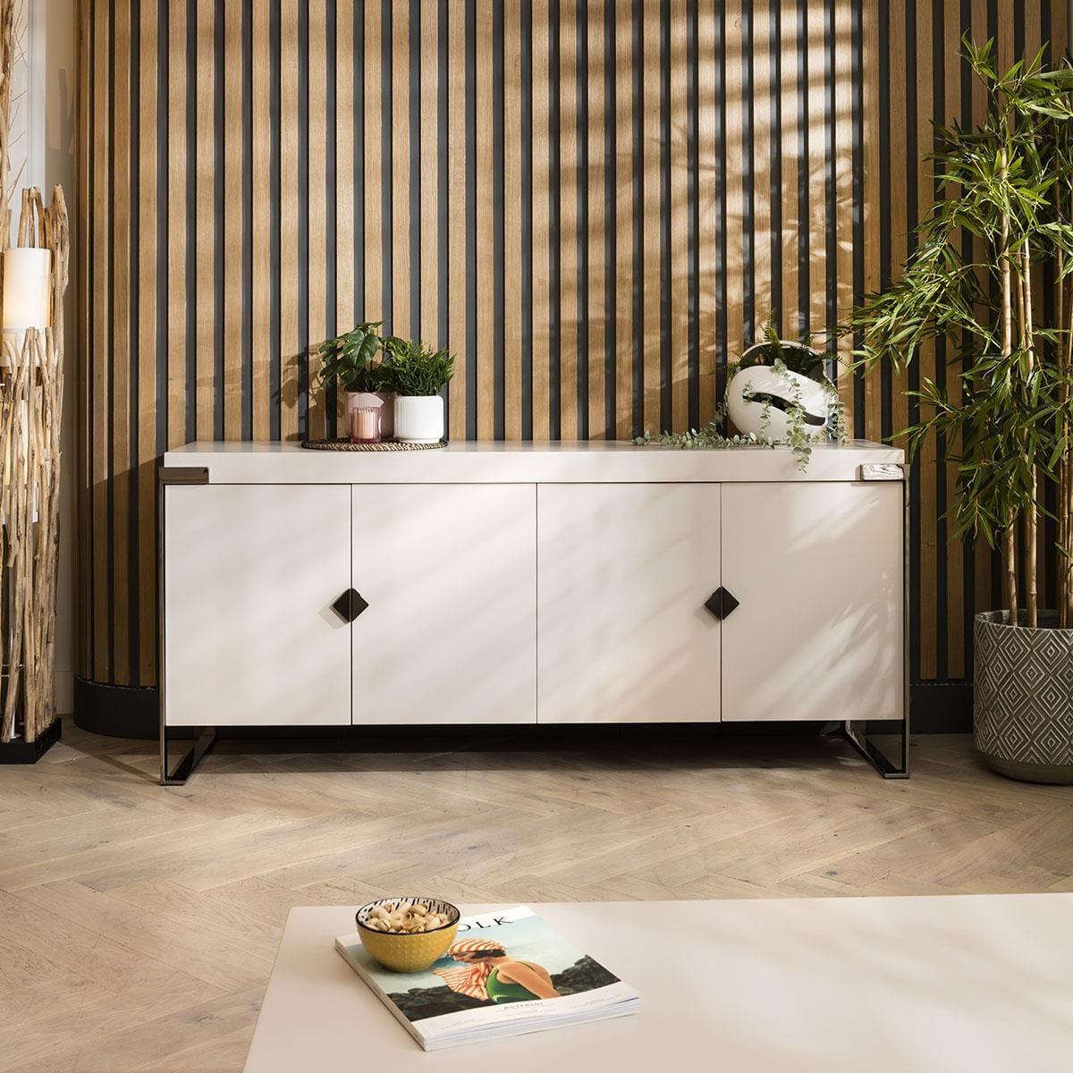 The Carbonado 4 Door Sideboard spells a contemporary charm and a quintessential touch, while providing welcome surface space and storage. This cabinet is visually pleasing in its modern design, and is crafted with a premium Chalk matte painted body encased by the sleek lines of the smoked chrome shaped into handsome legs. The sideboard cabinet creates a visually appealing contrast, lending to the elegance of this addition to your living or dining room with a stainless steel base and matte painted top, it's a perfect focal point of your living area or lobby. We are specialists in high-end home furniture, and from our experience, a truly luxurious interior needs a sideboard. Here at Quatropi you will find something to suit any decor, including small to large sideboard cabinets, and a whole host of colours and materials, like premium oak cupboard units to elegant pure white sideboard cabinets. W182cm D47cm H80cm Modern Chalk 1.8m 4 Door Sideboard View matching items in the Carbonado range