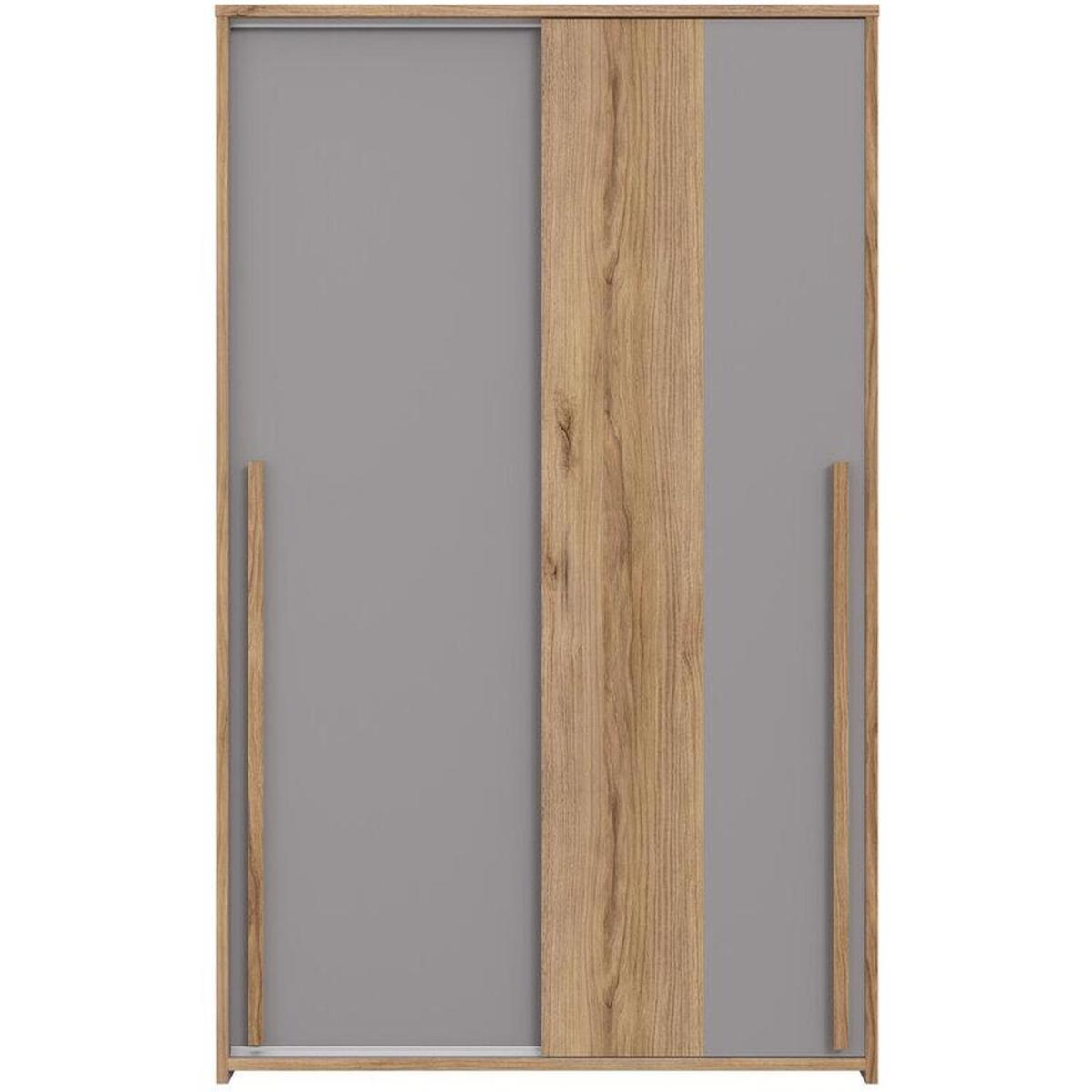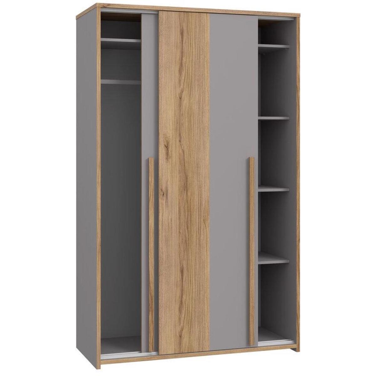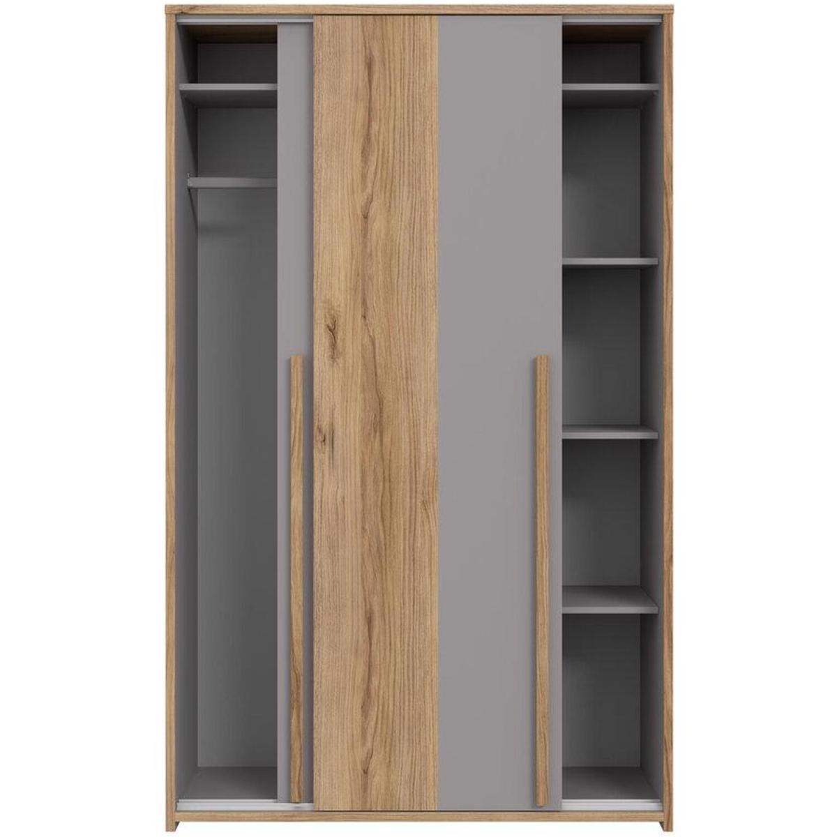 With ample storage space this modern styled wardrobe provides a beautiful storage solution. With an elegant matt grey finish with Catania Oak details offers a neutral feel that will blend with any style of room seamlessly. Hidden behind the 2 large sliding doors are 2 separate compartments. One consists of a large overhead storage shelf and integrated storage rail. The second consists of 4 heavy duty storage shelves.