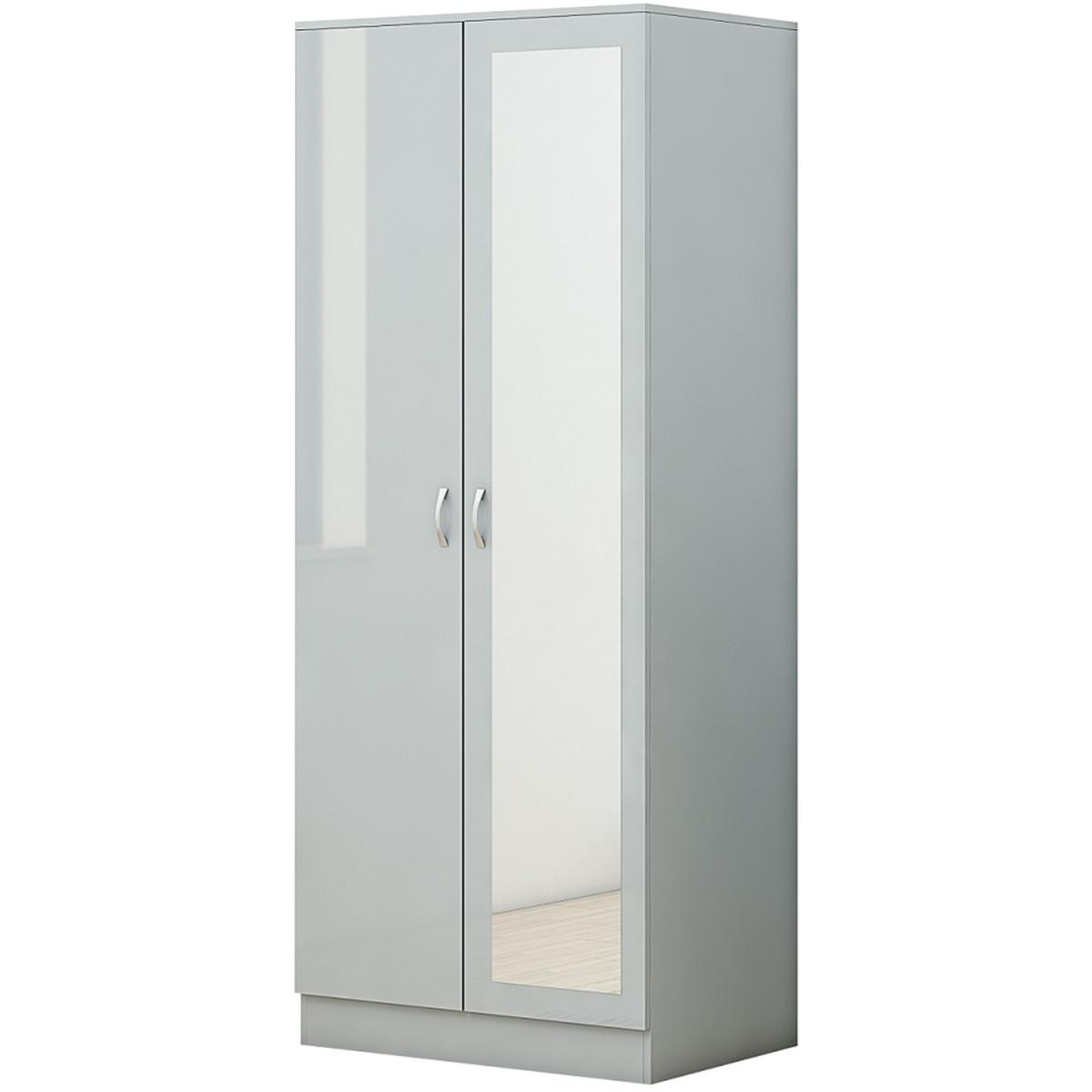 The 2 Door High Gloss Grey Wardrobe with 1 Mirrored Door is a modern and stylish piece of furniture that will add a touch of elegance to any bedroom. The wardrobe features two doors, one of which is mirrored, which not only provides additional storage space but also reflects light, making the room feel more spacious and airy. The high gloss grey finish gives the wardrobe a sleek and contemporary look, while the mirrored door adds a touch of glamour and sophistication. The mirrored door is also practical, allowing you to check your outfit and appearance without leaving the room. The wardrobe is constructed with high quality materials, ensuring its durability and longevity. The two doors open to reveal ample storage space for hanging clothes, with a rail that runs across the top of the interior. The wardrobe also features a handy shelf at the top, perfect for storing extra blankets or other items. The wardrobe's dimensions are optimized to fit most bedroom spaces, making it a versatile and useful addition to any home. The doors are equipped with easy to use metal handles that provide a comfortable grip and a sleek appearance. In summary, the 2 Door High Gloss Grey Wardrobe with 1 Mirrored Door is a beautiful and practical furniture piece that offers ample storage space and a stylish appearance. Its high quality construction, easy to maintain finish, and functional design make it an ideal choice for those seeking a modern and practical wardrobe solution with a touch of elegance.