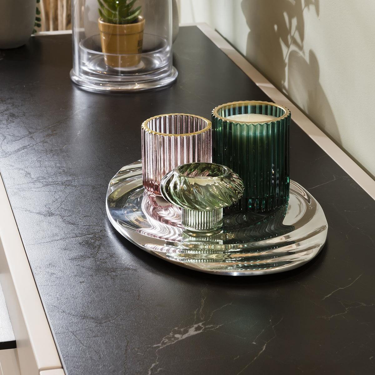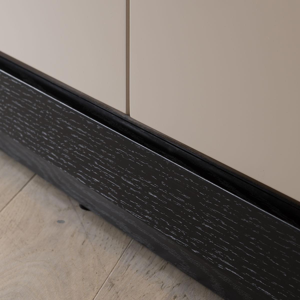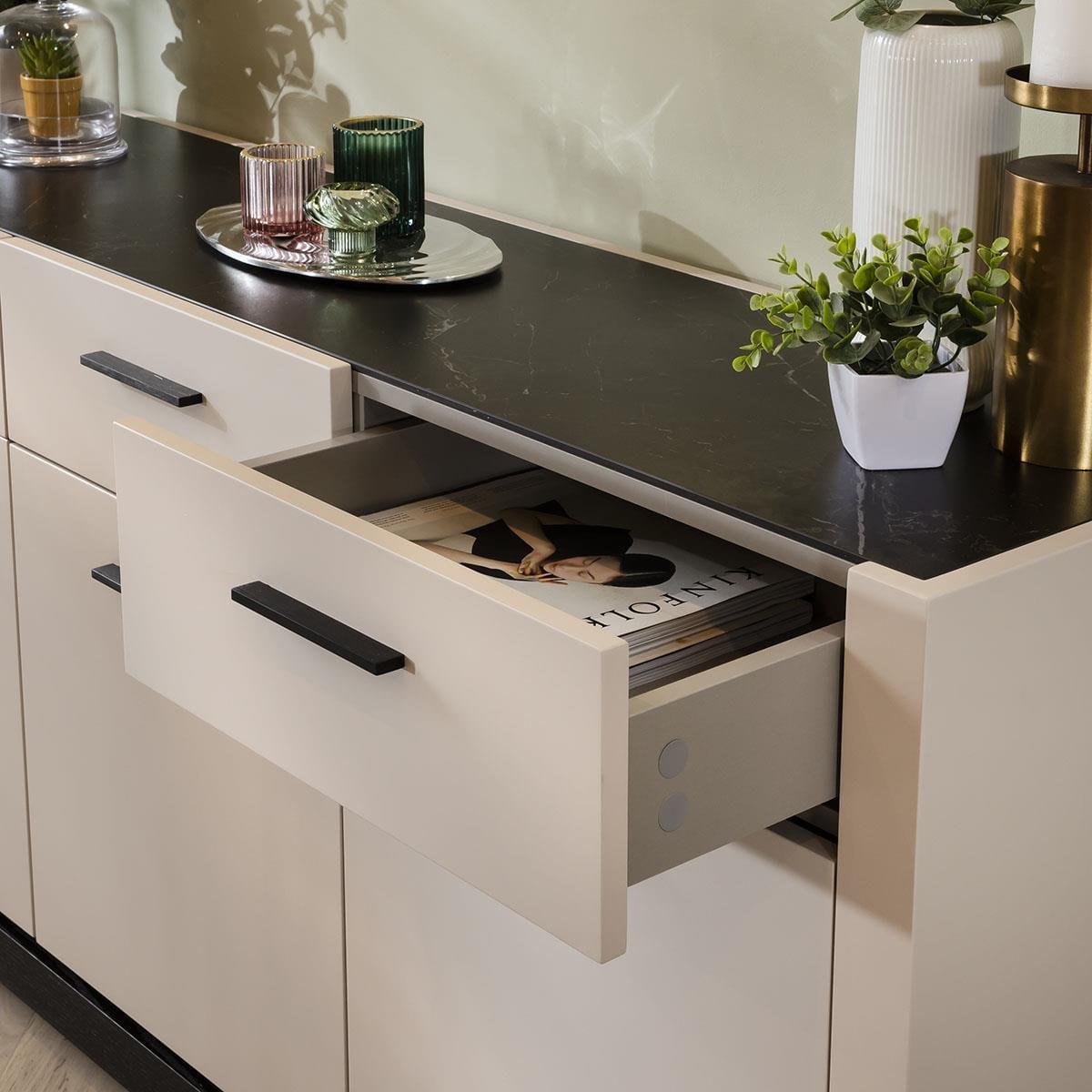 Our 160cm wide 3 door sideboard cabinet with drawers is designed to elevate your living space. Crafted with precision, this modern sideboard boasts a premium matte chalk finish combined with a black oak veneer and ceramic top, adding a touch of sophistication to any room. Plus, this storage unit arrives pre-assembled. The sideboard boasts a striking black oak veneer on its lower plinth and base, exuding a timeless charm that complements any decor. The premium matte chalk finish adorns its doors, drawers, and body. Behold the sturdy and scratch-resistant black ceramic top, providing a durable surface that withstands heat and stains with ease. No more worries about accidental spills or hot items marring its beauty it's a sideboard built to stand the test of time. Delivered fully assembled, this masterpiece saves you time and effort, ready to grace your home right out of the box. Equipped with three spacious drawers and three doors, this sideboard offers ample storage for all your essentials. The soft-close mechanism ensures smooth and silent operation, a testament to its superior quality and thoughtful design. Embracing the allure of minimalism, sleek black aluminum handles adorn the doors and drawers, effortlessly blending style with functionality. Heightened at 80cm, this sideboard stands tall, making a bold statement while offering convenience within arm's reach. Perfectly suited for dining rooms, living rooms, or even as an upscale storage solution in your office. Embrace sophistication and efficiency with our matte chalk sideboard a fusion of classic charm and modern innovation. W160cm D40cm H80cm Fully Assembled Large 3-Door Sideboard in Matte Chalk with a Black Ceramic Top