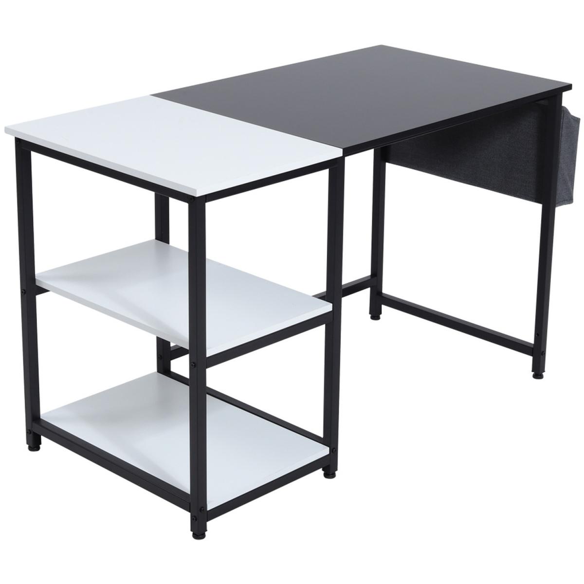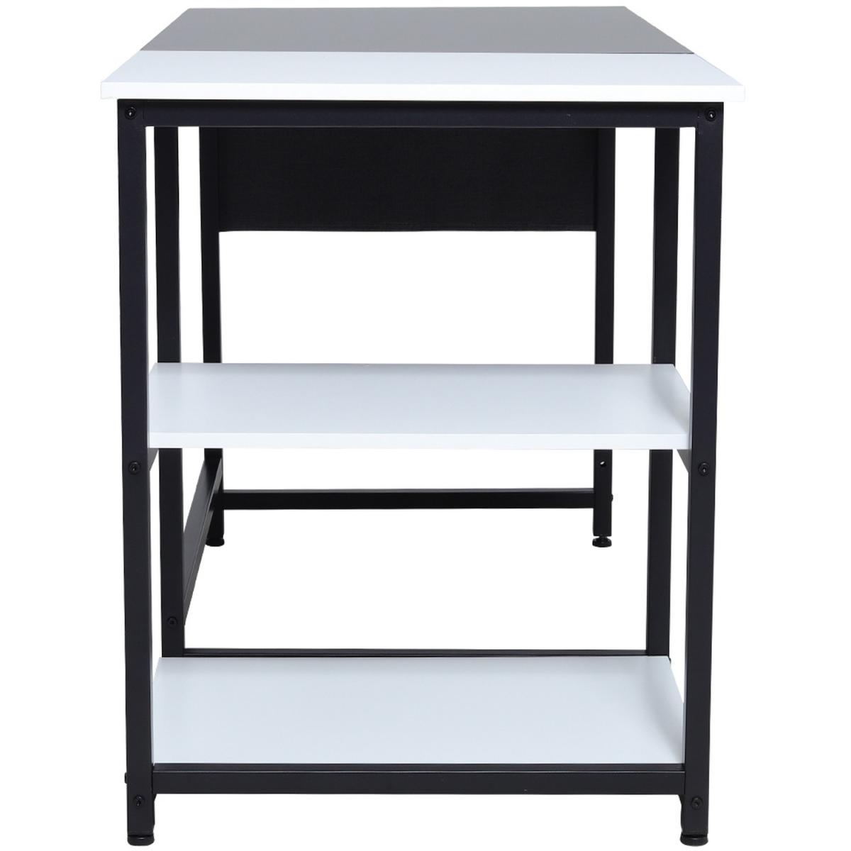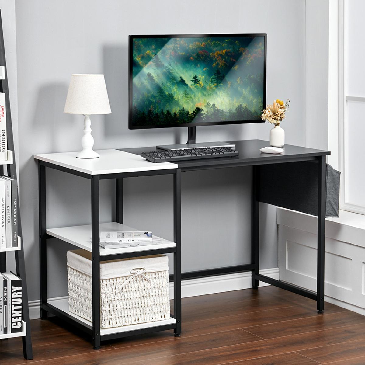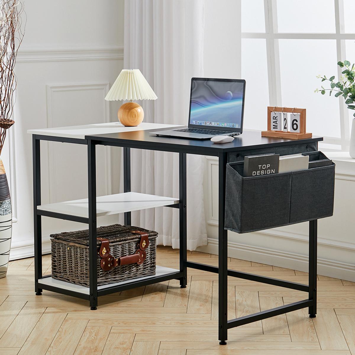 This is our writing computer desk. Simple and elegant lines make it beautiful and practical. Side cloth bags and hooks on the desktop can store smaller office supplies, keeping your desk clean and tidy. Small cloth bag stores smaller office supplies, on the other side, with 2 hooks. With a solid build painted frame, the unit is very stable and durable. It is a multifunctional workstation, it can be used as a computer desk, office table, meeting desk, writing table or exhibition desk etc. Flat package, easy to install by yourself.