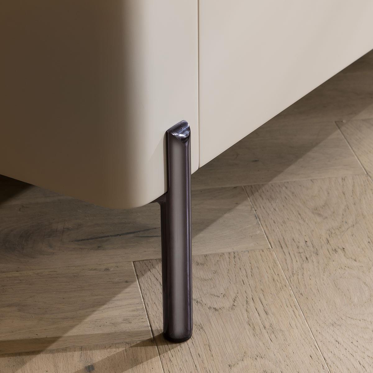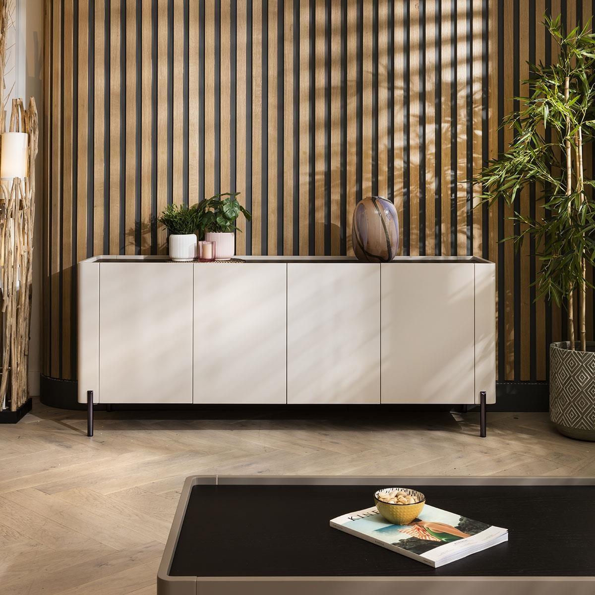 A storage unit for a modern lifestyle, the sideboard from the Newton range offers a creative and practical design. The 180cm large 4 door sideboard is designed to be a focal point of the room with a modern, minimalist design in matte lacquered Chalk and a black oak veneer top. It's shiny smoked stainless steel legs are sturdy and bring the overall height to 74cm. The sideboard has a large storage capacity with 4 flush doors that open up to 2 large compartments. Instantly rejuvenate your space with the contemporary Newton collection. Enjoy the elegant Chalk matte lacquered finish, the harmonious black oak veneer top, and the contrasting stainless steel legs that when combined offer a unique aesthetic to the units in the Newton design, pulling the whole piece together with class. W180cm D45cm H74cm Premium Chalk Matte Lacquered Sideboard with Black Oak To Four Spacious Cupboard