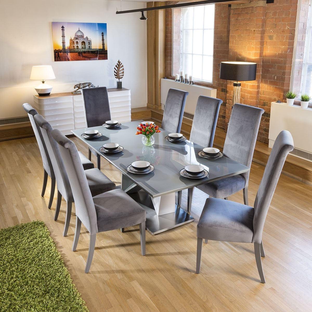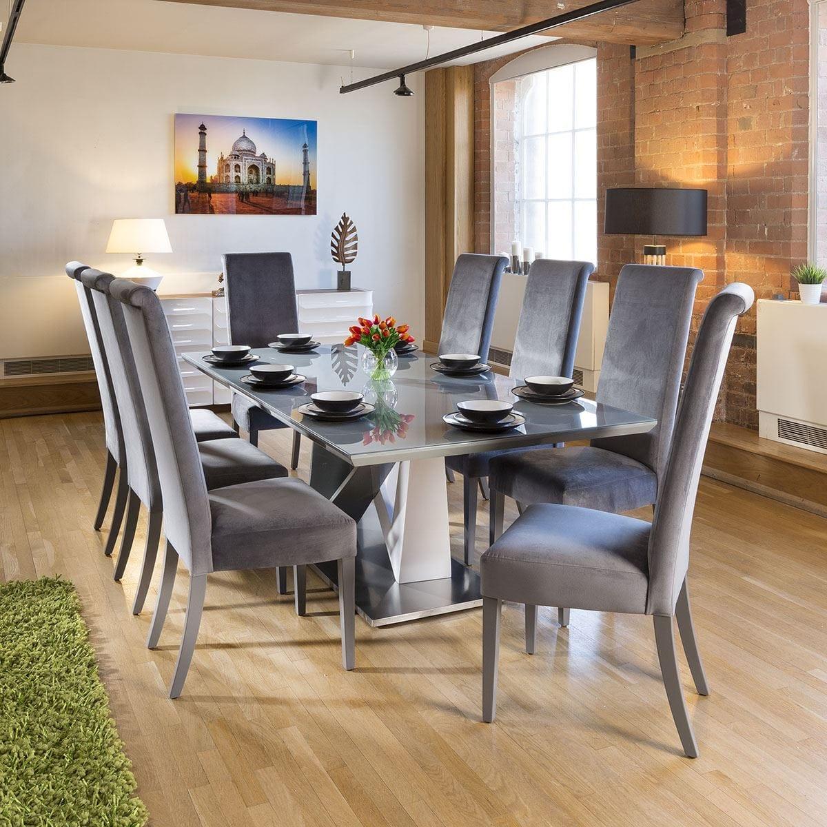 Luxury High End Dining Set, Rectangular Table with Grey Glass Top and 8 Stunning Extra Tall Velvet Grey Chairs from Quatropi. This gorgeous table features beautiful grey glass top, strong white and grey gloss stem and brushed stainless steel heavy base. All tables and chairs have nylon feet under to protect your floor. Extremely high quality chairs from Portugal feature soft grey velvet fabric, exta high backs and super strong wooden frame and legs. W220cm D110cm H75cm Set includes 1 x dining table and 8 chairs Mix and Match any of our tables and chairs