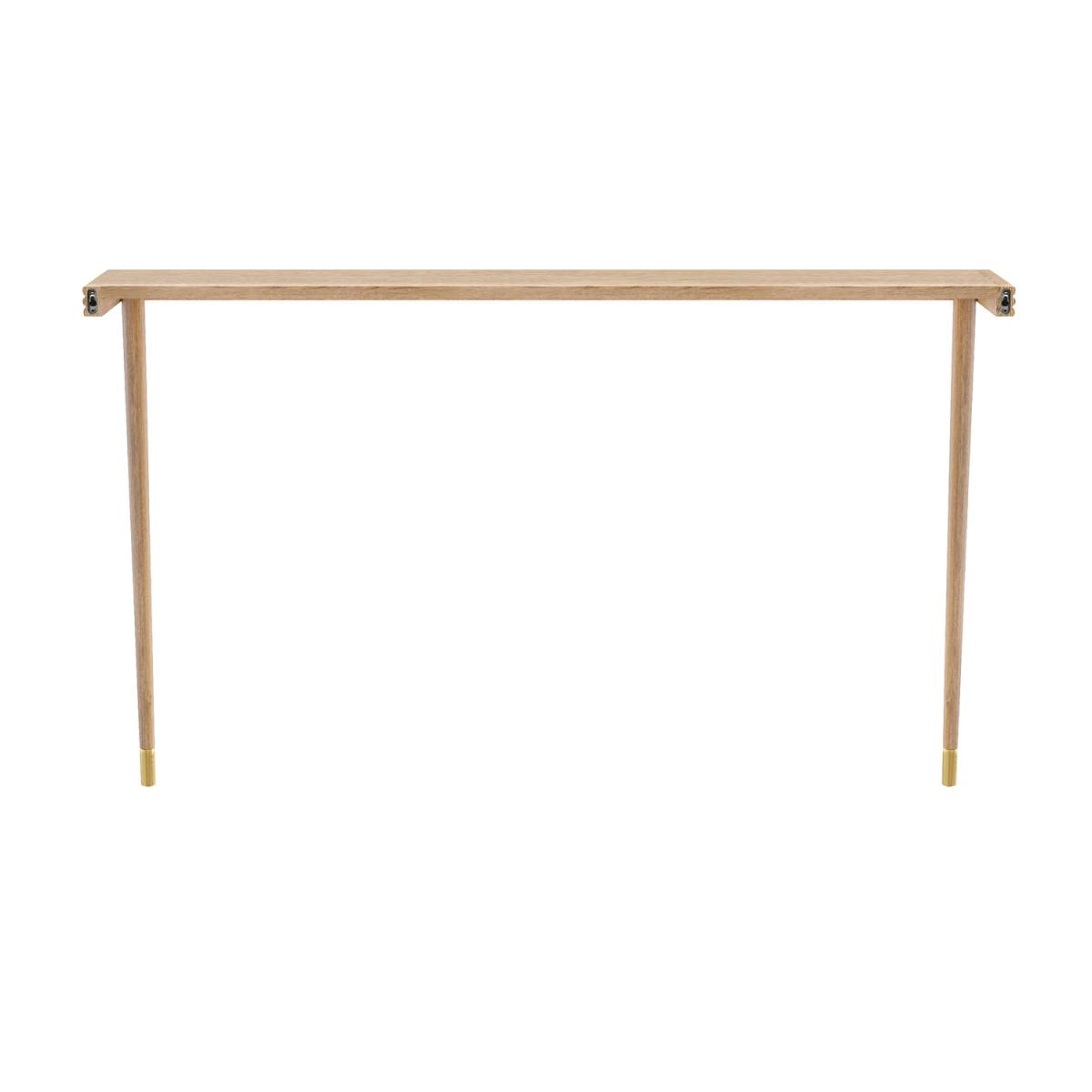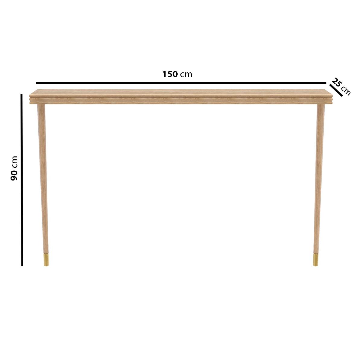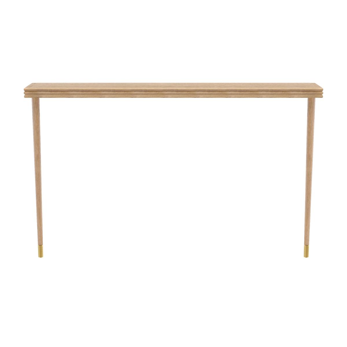 Crafted from solid oak with a weathered finish, it combines both durability with a natural, rustic charm. The subtle chunky ribbed profile add texture and sophistication to the design. Subtle brass tips on the legs add a modern and luxurious touch to the design. Designed with discreet yet sturdy legs and a secure wall attachment for added support. A statement piece with ample surface space, perfect for larger hallways or living areas. Enhance your space with this beautifully designed wall-mounted console table, offering a perfect blend of style and function. The natural weathered oak finish and elegant fluted detailing create a refined aesthetic, while the brass-tipped legs add a modern touch. Ideal for narrow spaces, this console table provides a sleek surface for displaying décor, storing essentials, or adding a sophisticated accent to your home. Designed for stability and durability, crafted from high quality solid oak, it’s a stylish solution for contemporary living. This extra small console table is perfect for compact spaces, offering a stylish yet functional surface. Due to the nature of the natural wood, each piece will be unique due to the variation of the real wood grain.