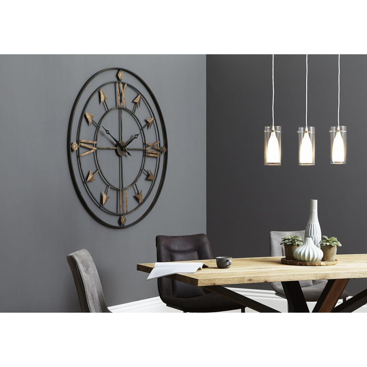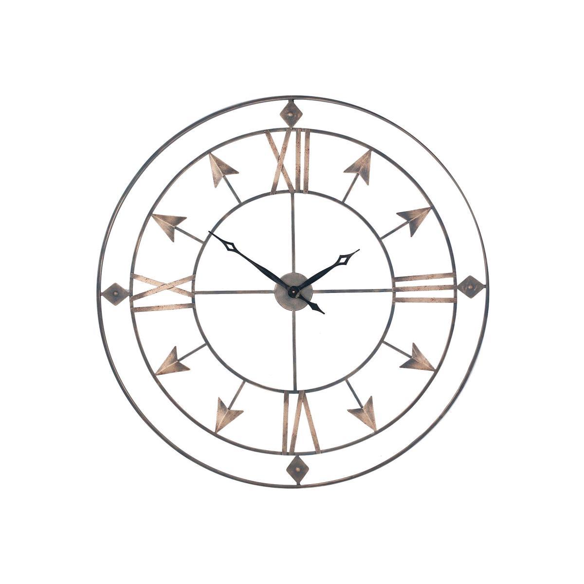Make a statement in your kitchen, hall or living room with this classically designed large metal wall clock finished in antique grey and gold. The double metal frame is beautifully detailed, with cut-out roman numerals and arrows marking the hours. This larger than life vintage style clock will be a real feature in any room. Antique grey and gold statement wall clock. Large in scale. Double metal frame is beautifully detailed. Cut out roman numerals and arrows mark the hours. Makes an impact in any room. Metal, with an antique grey and gold finish. Fabulous vintage style for kitchen, hall or living room. Dimensions. Diameter: 120cm (47 in).