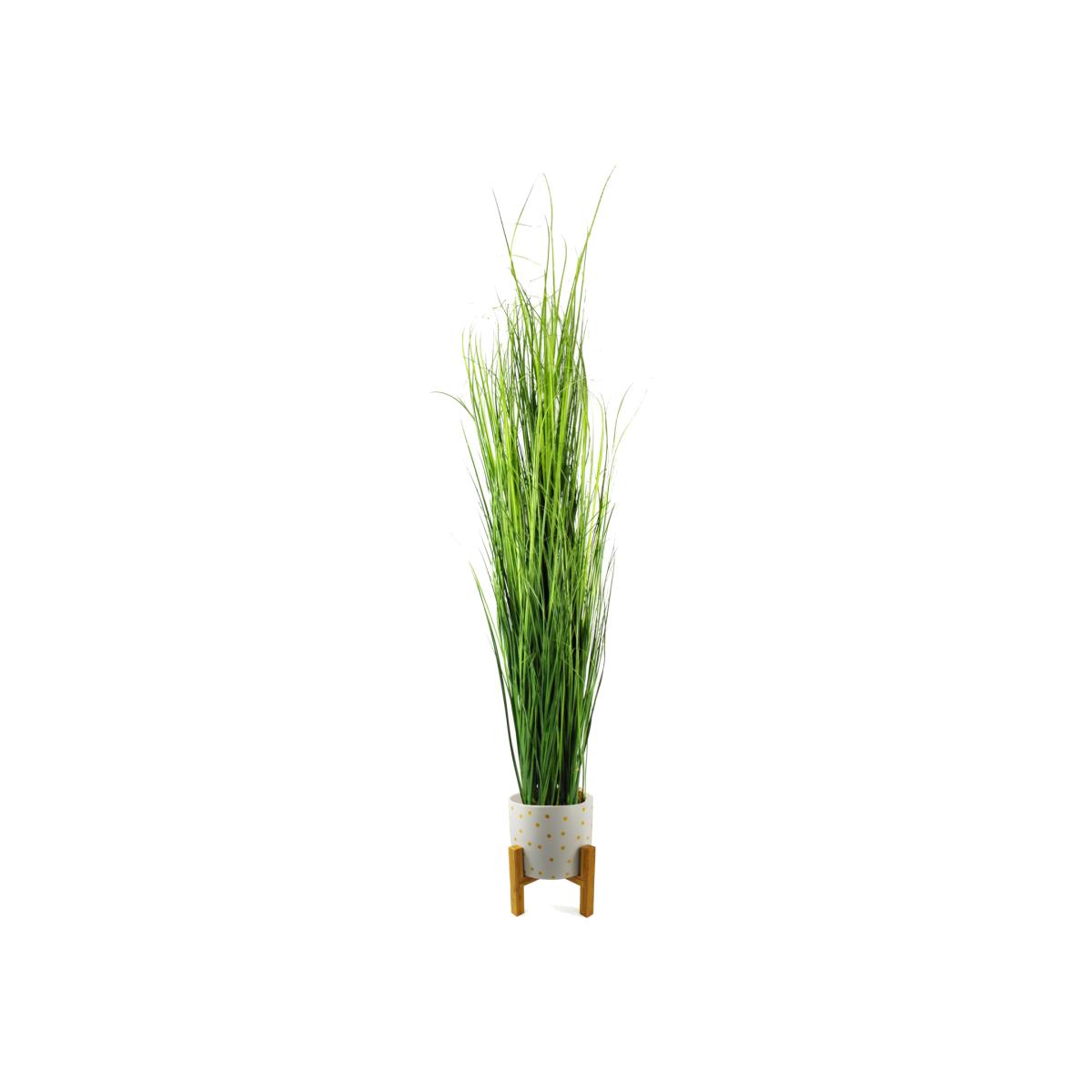 Artificial Onion Grass Plant. Artificial plant by Leaf Design UK. Potted in a plain plastic pot and is fully assembled. Pack includes Gold Dot Planter Plant Pot with Bamboo Stand. Indoor use only. You can add soil - gravel or bark around them to make them look even more realistic.