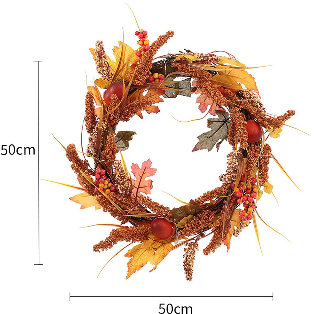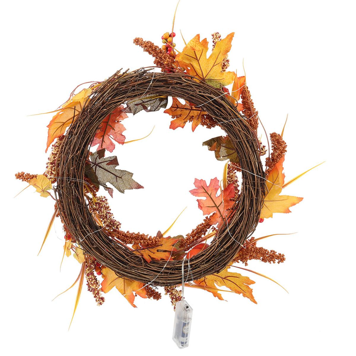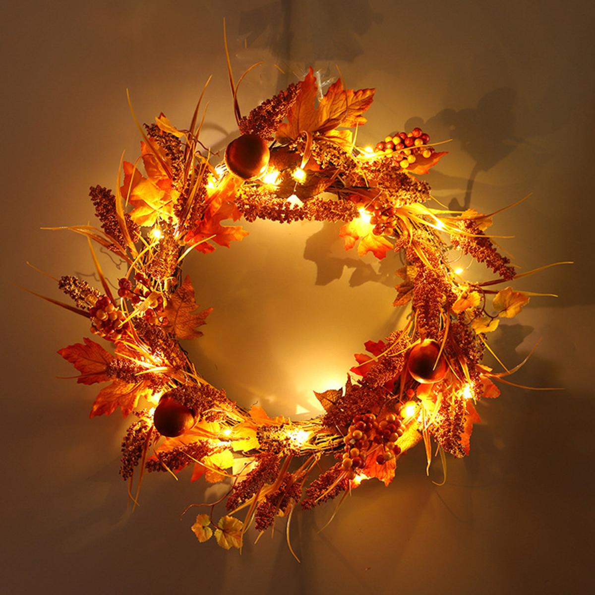 Our fabulous fall wreath is filled with autumn vibes. From the lush ears of wheat to the ripe fruits, you can feel the harvest all around. When lit at night, the wreath looks even more amazing and oozes an inviting touch that you will love it. Hang it on the door for a delightful addition.