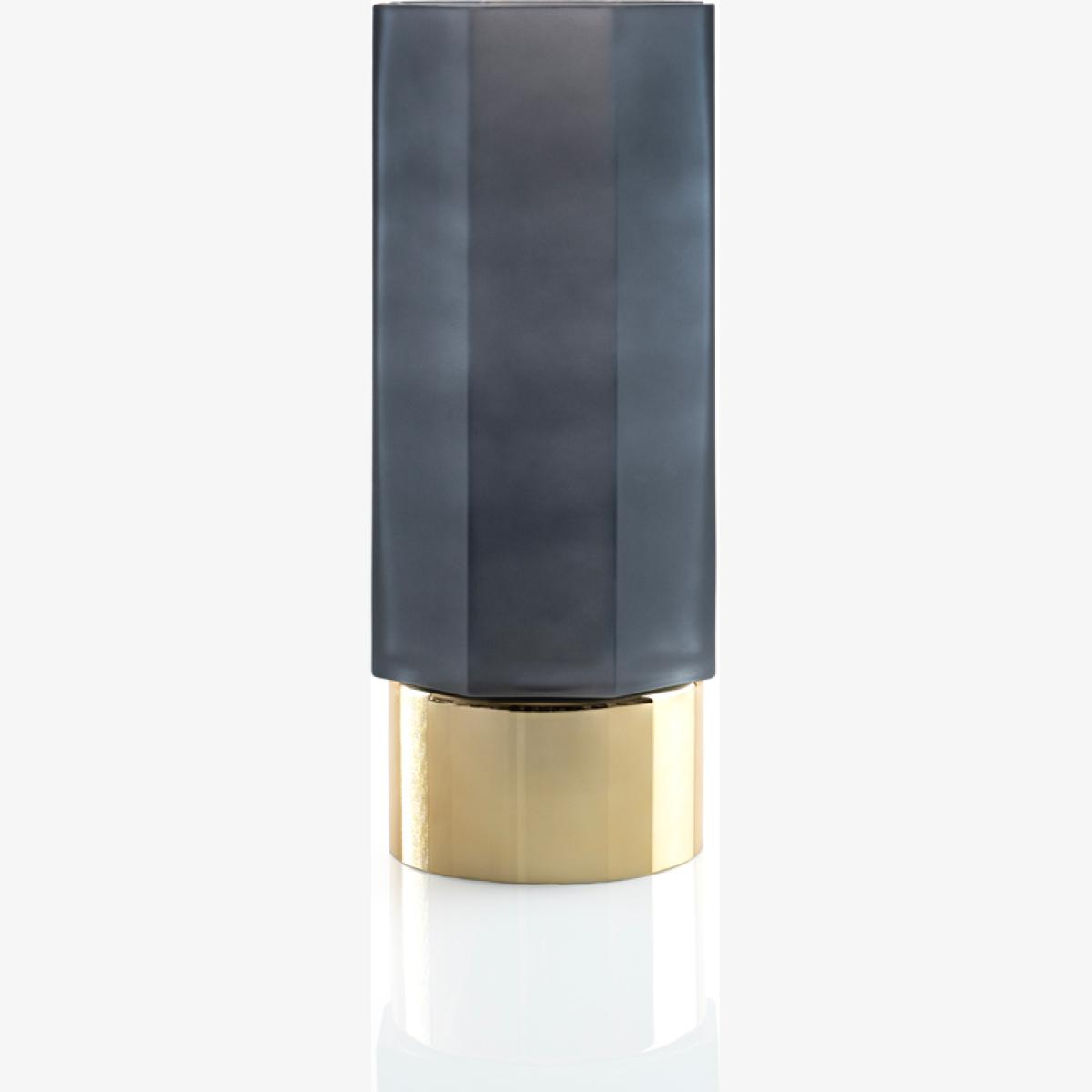 An impressive, large scale vase. High quality hand-made item. Hexagonal design. 6mm thick frosted black glass top. 6mm thick gold coloured glass base. Ideal for displaying tall flowers, grasses and branches.