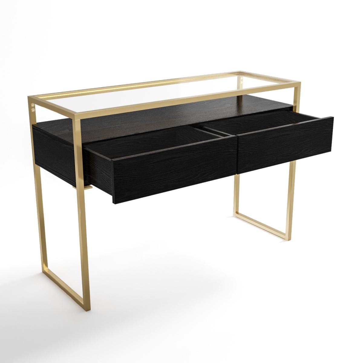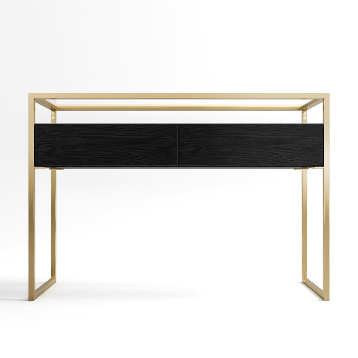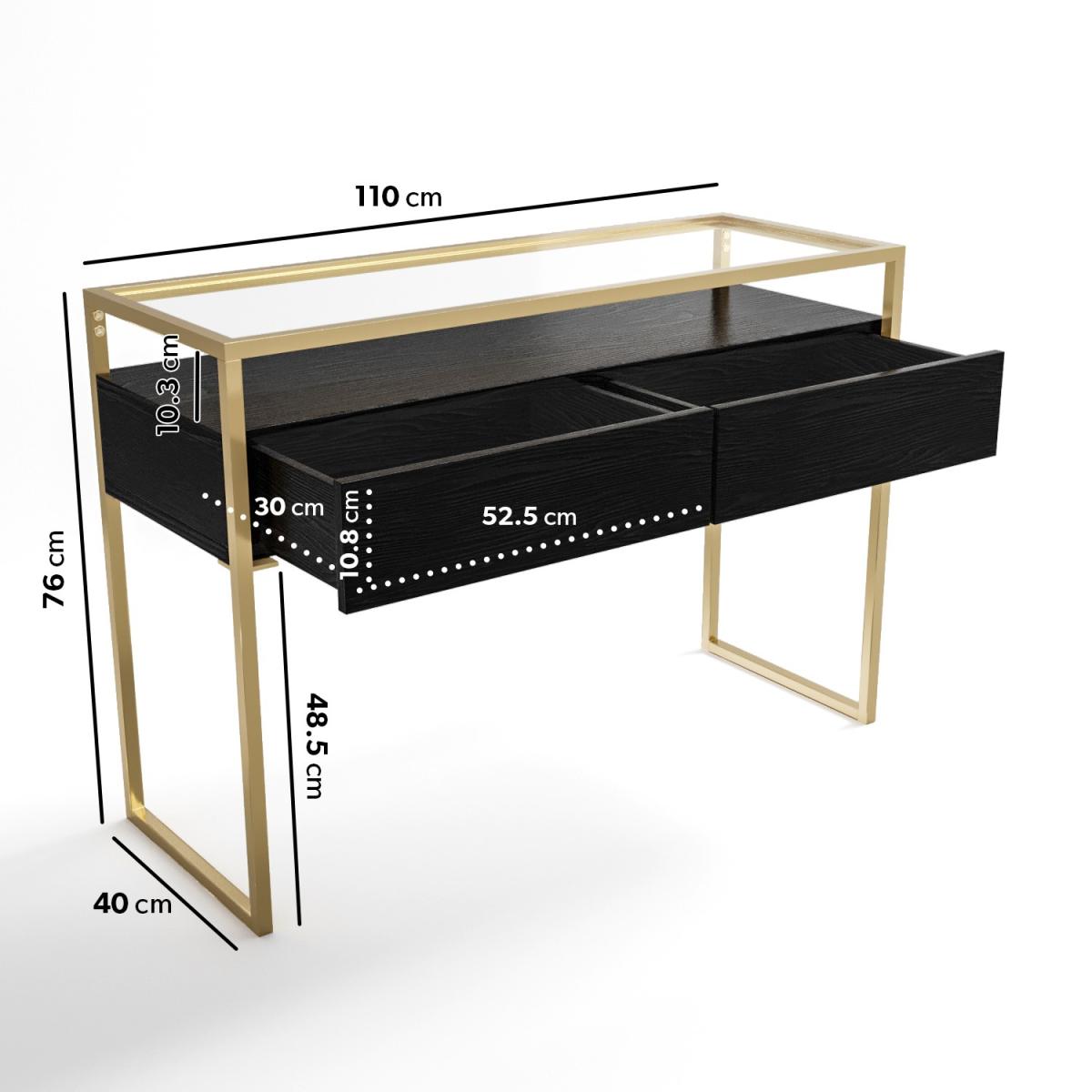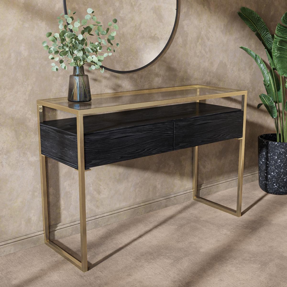 All about me The Akila black console table is unique, the modern brass legs are guaranteed to create a focal point in any hallway or living space. The two drawers are perfect for stowing away your essentials, and the durable glass top is easy to clean while being resistant to heat and scratches, perfect for constant use in your hallway. Need to know Dimensions:W110 x D40 x H76 cm Packaging dimensions:W122 x D52 x H19 cm Weight: 30 kg Maximum load weight: 100 kg Colour:Black and brass Finish: Lacquered Material: MDF, metal and tempered glass Assembly required: Yes