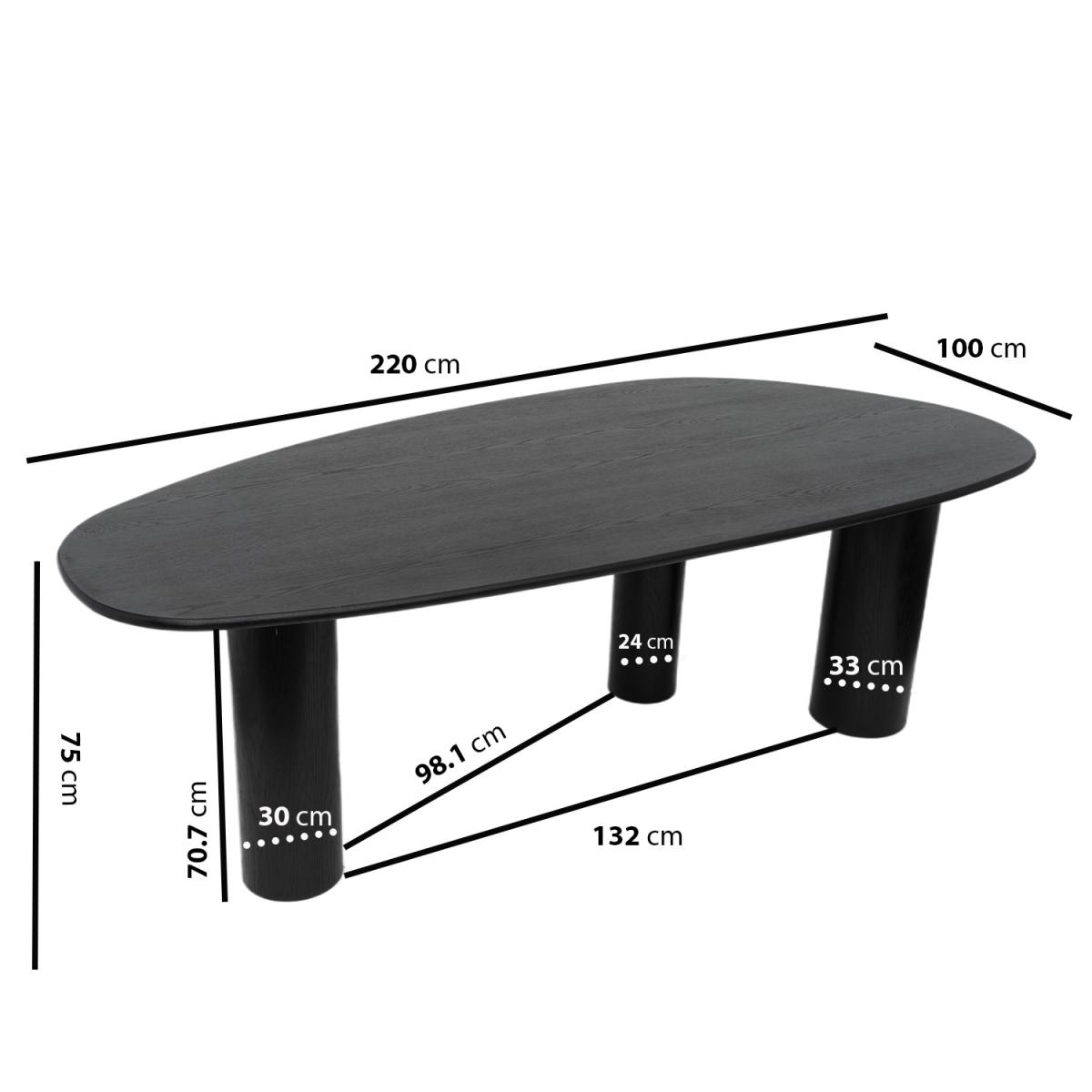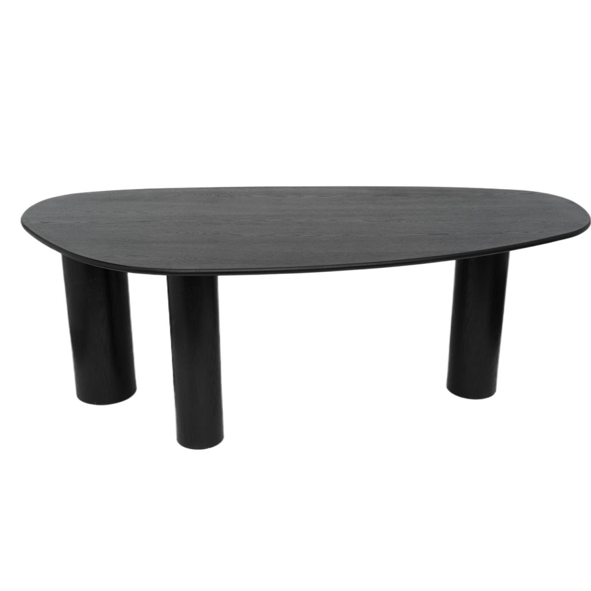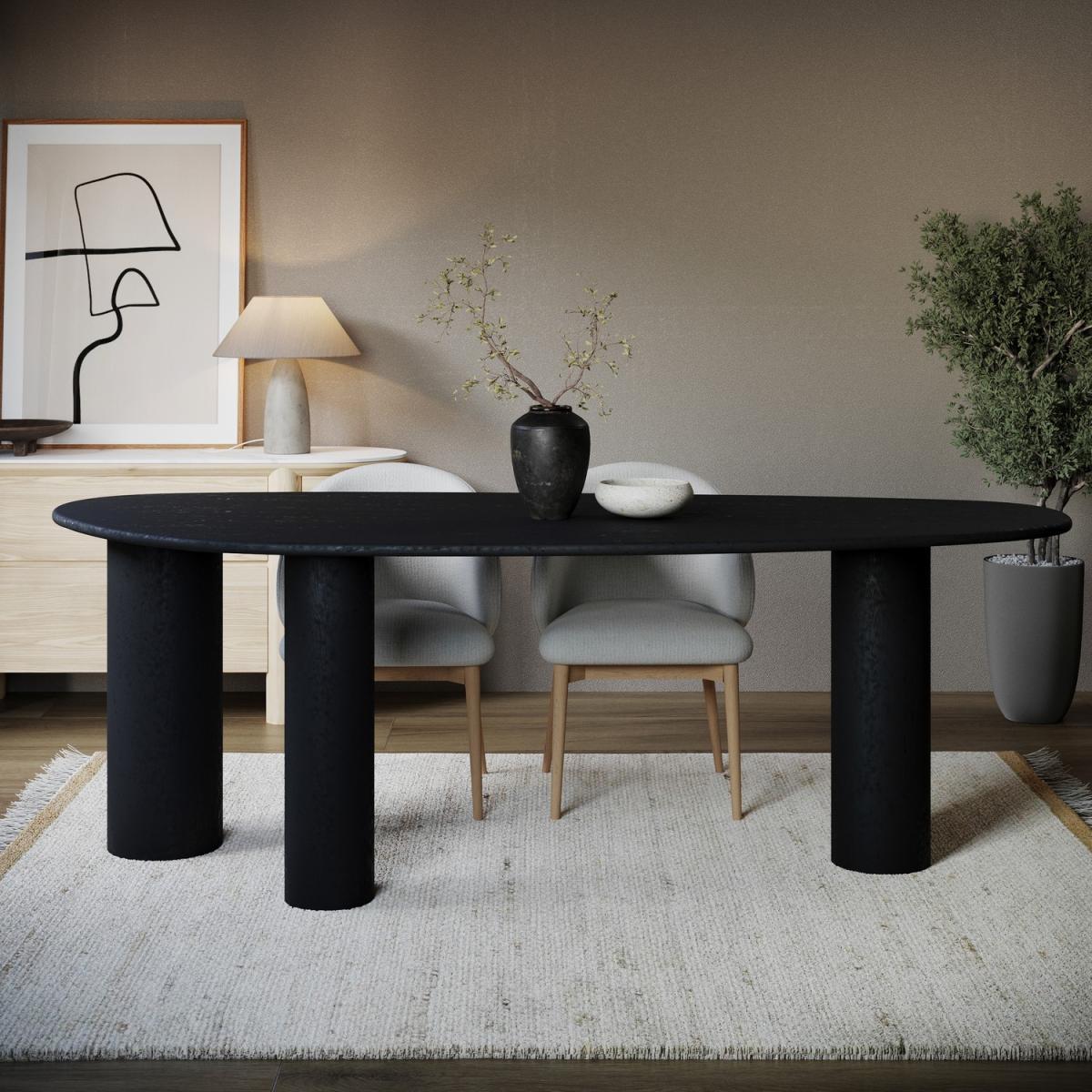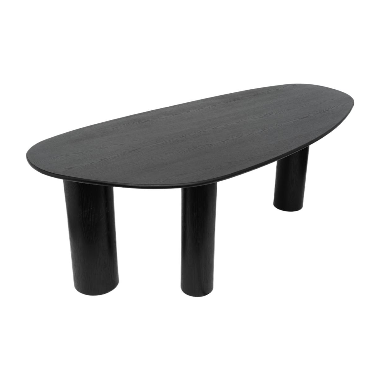 With its unique pebble-shaped top and bold pillar legs, the Oscar dining table turns everyday dining into a design moment. Its organic curves bring a soft, sculptural edge to your space. Generously sized to seat up to six people, it’s perfect for relaxed family meals or dinner parties. Crafted with a black oak veneer finish, Oscar blends contemporary design with a touch of natural texture. The deep tone brings warmth and sophistication to modern interiors. The irregular, oval silhouette adds interest without overwhelming. It's the ideal centrepiece for kitchens or dining rooms that minimal, bold, or anything in between. From its smooth pebble-like shape to the bold pillar legs, everything about this Oscar Dining Table feels thoughtfully designed. The black oak veneer finish brings texture and richness to your space, while the curved silhouette keeps it soft and inviting. Comfortably seating four to six, it’s perfect for family gatherings. Whether styled with neutral chairs or bold accents, Oscar brings balance, beauty, and versatility to the table. Please use heat-protective mats & coasters when placing items onto the table to protect the tabletop, clean up any spills straight away as wood is porous and will absorb liquids. Dimensions: W220 x D110 x H75 cm Seats: 4-6 Chairs included: No Shape: Oval Colour: Black Material:Oak Veneer Finish: Stained Assembly required: Yes Product Weight: 70kg Maximum supported weight: 100kg Packaging dimensions: Box 1:W77.5 x D81 x H32 cm; Box 2: W230 x D107 x H7 cm