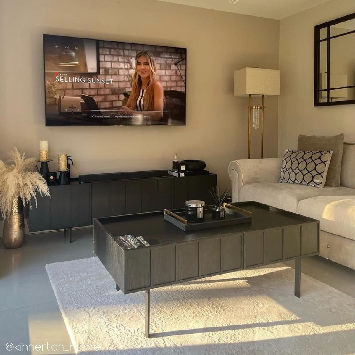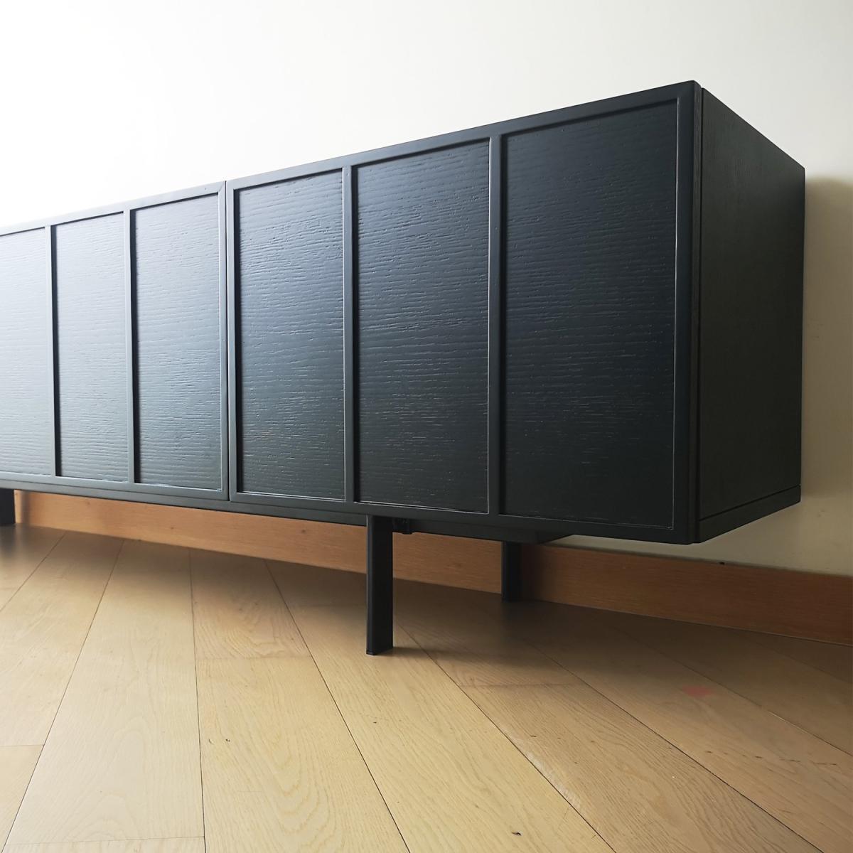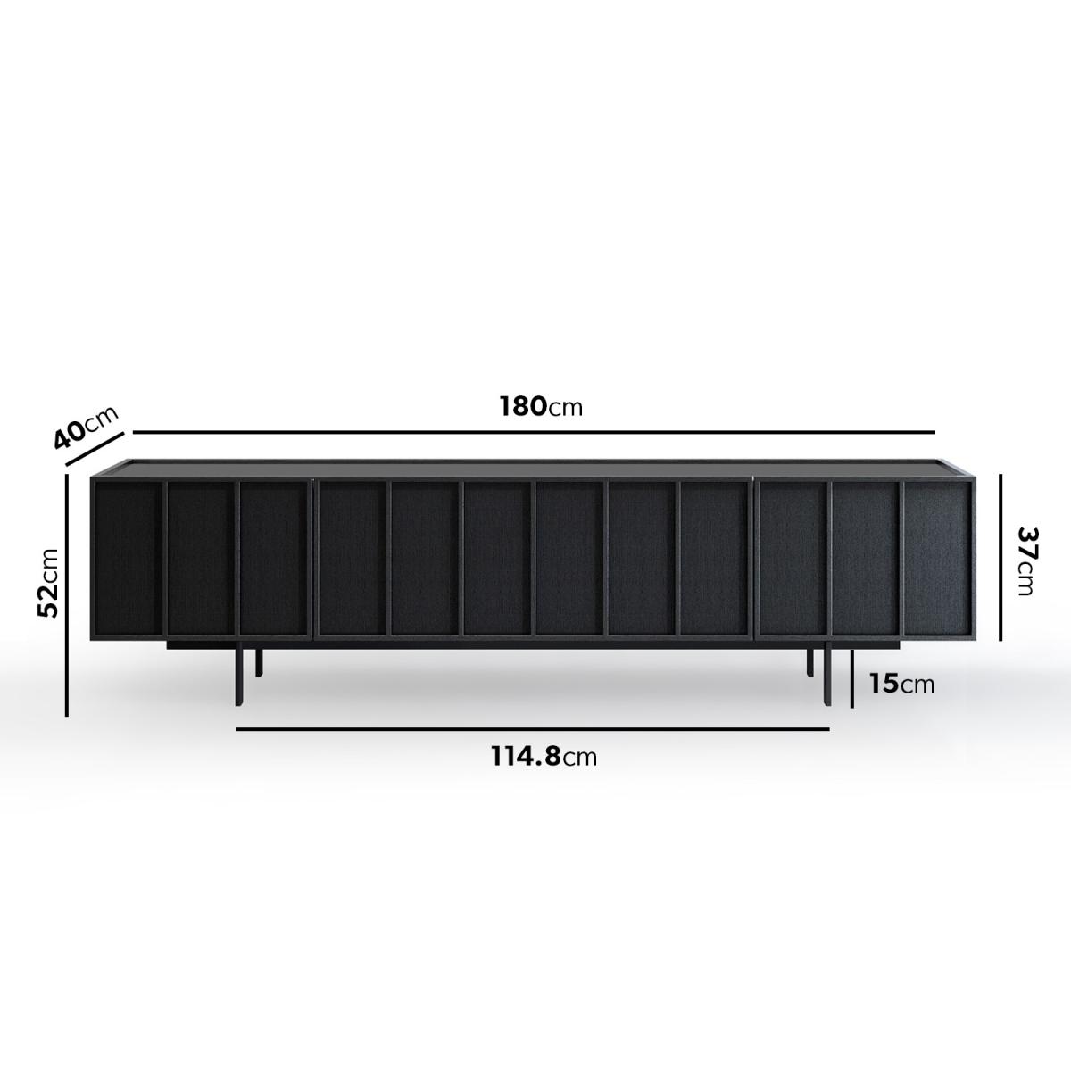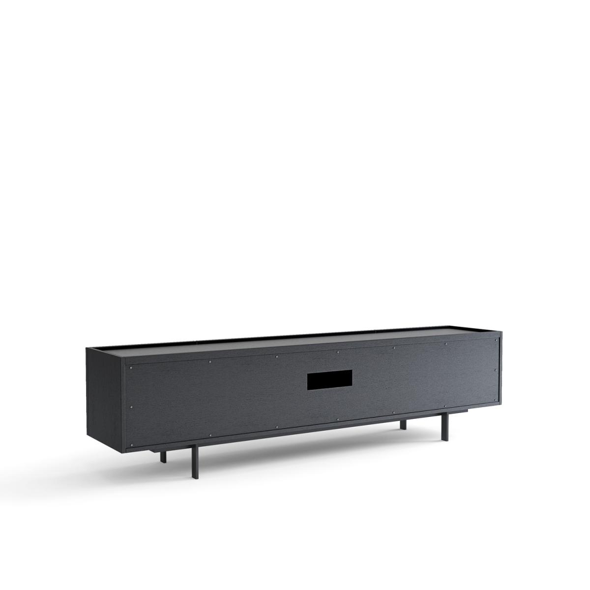 Features we love Statement piece with eye-catching blackened oak finish. Modern on-trend design with stylish linear detailing. Integrated central cable hole for your devices. Upgrade your living room with this premium TV Unit Central door folds down for remote access. Discrete handy storage solution. Matching items available in the Helmer range. The media holes are the perfect size to fit a UK plug through all hold all your device's cables. Need to know. Dimensions. H52 x W180 x D40cm Internal shelves dimensions. H18 x W47 x D37cm Number of shelves. 4 Weight. 52kg Max weight. This unit will hold 30kg Max tv size. 70 inches Colour. Black Finish. Blackened oak veneer Material. Black painted oak veneer backed with MDF plywood drawers with black powder-coated metal legs and premium German hardware Assembly required. Yes - attaching the legs..