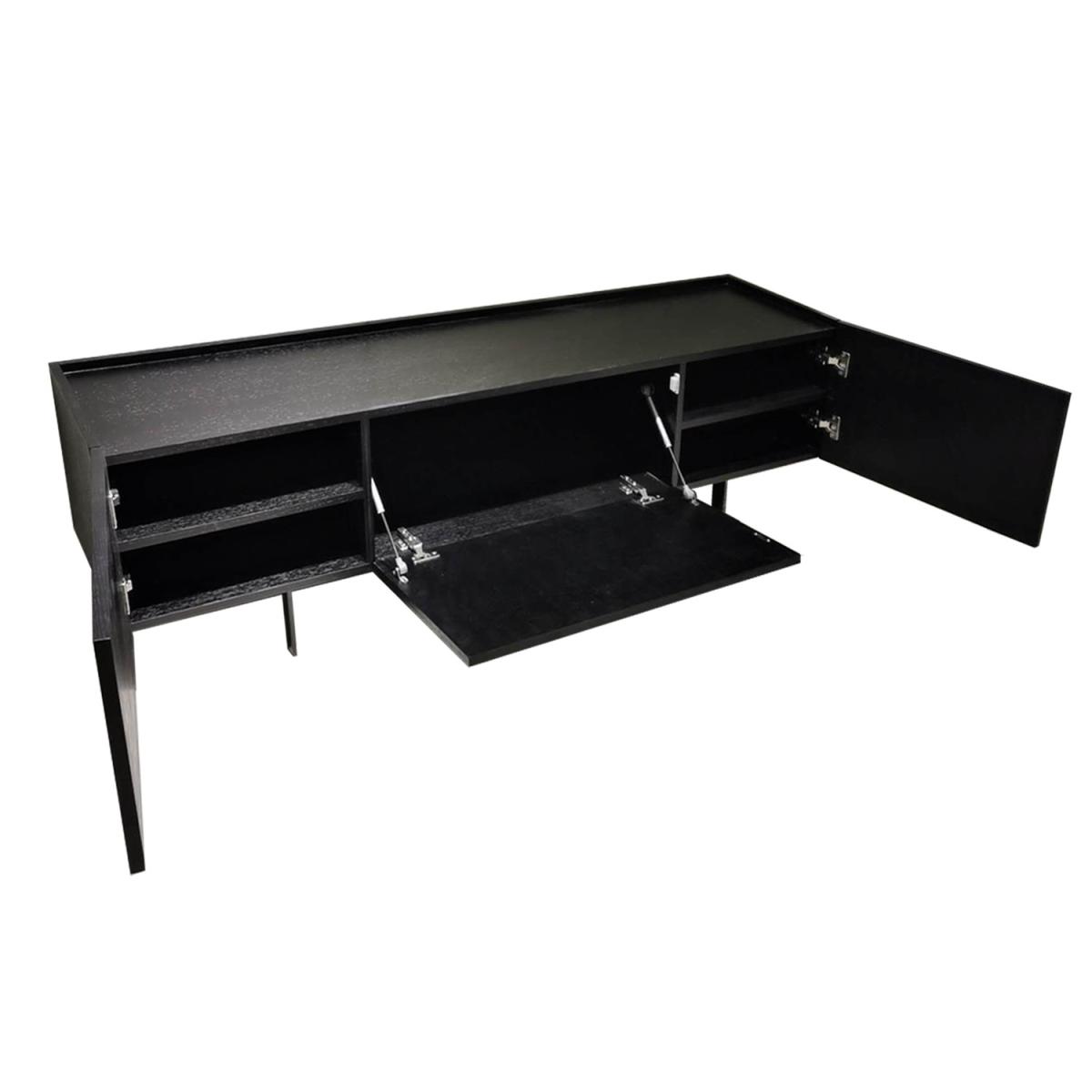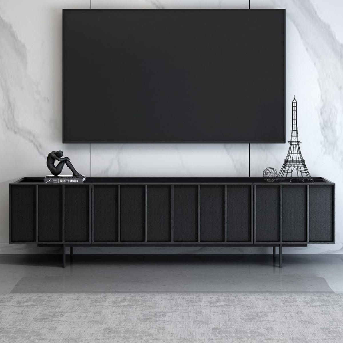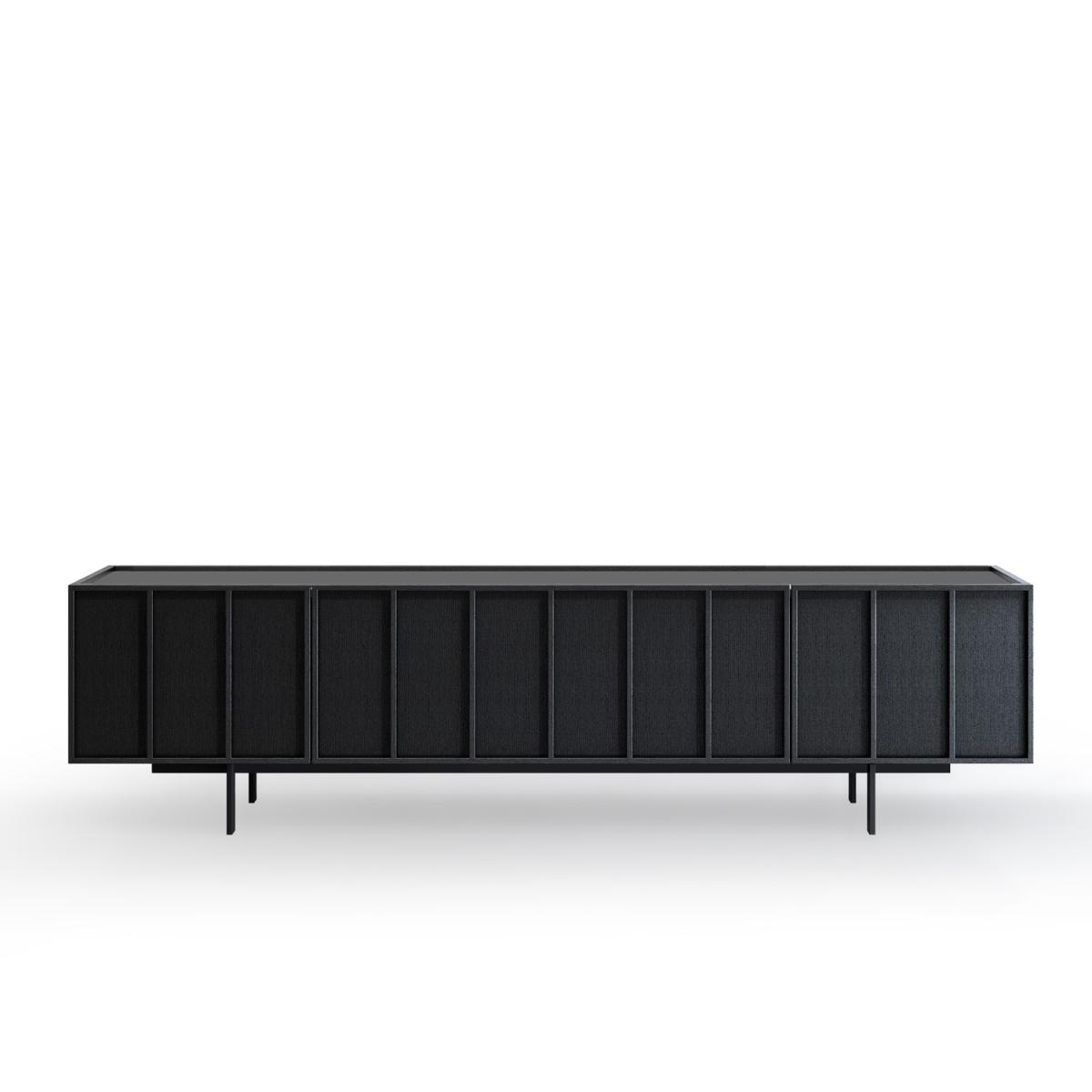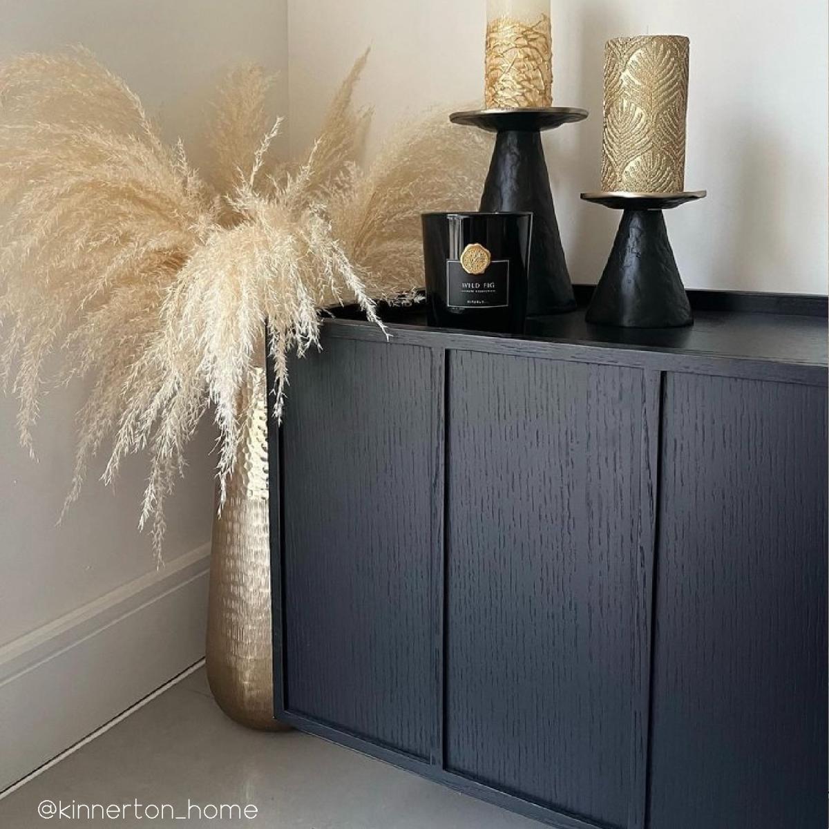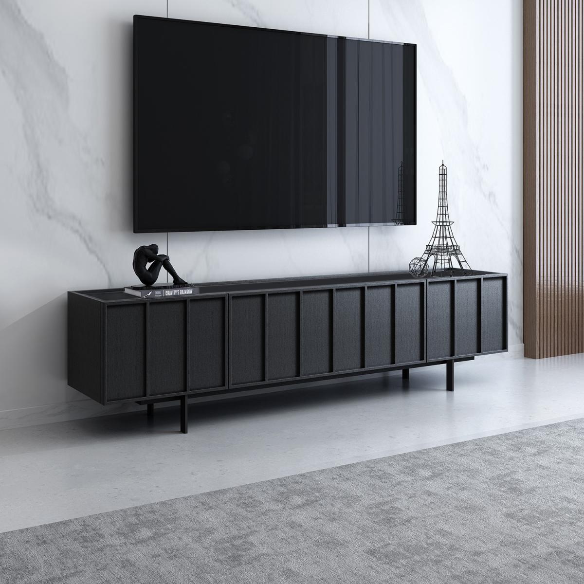 Features we love Statement piece with eye-catching blackened oak finish. Modern on-trend design with stylish linear detailing. Integrated central cable hole for your devices. Upgrade your living room with this premium TV Unit Central door folds down for remote access. Discrete handy storage solution. Matching items available in the Helmer range. The media holes are the perfect size to fit a UK plug through all hold all your device's cables. Need to know. Dimensions. H52 x W180 x D40cm Internal shelves dimensions. H18 x W47 x D37cm Number of shelves. 4 Weight. 52kg Max weight. This unit will hold 30kg Max tv size. 70 inches Colour. Black Finish. Blackened oak veneer Material. Black painted oak veneer backed with MDF plywood drawers with black powder-coated metal legs and premium German hardware Assembly required. Yes - attaching the legs..